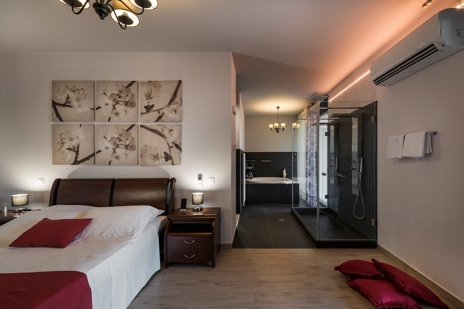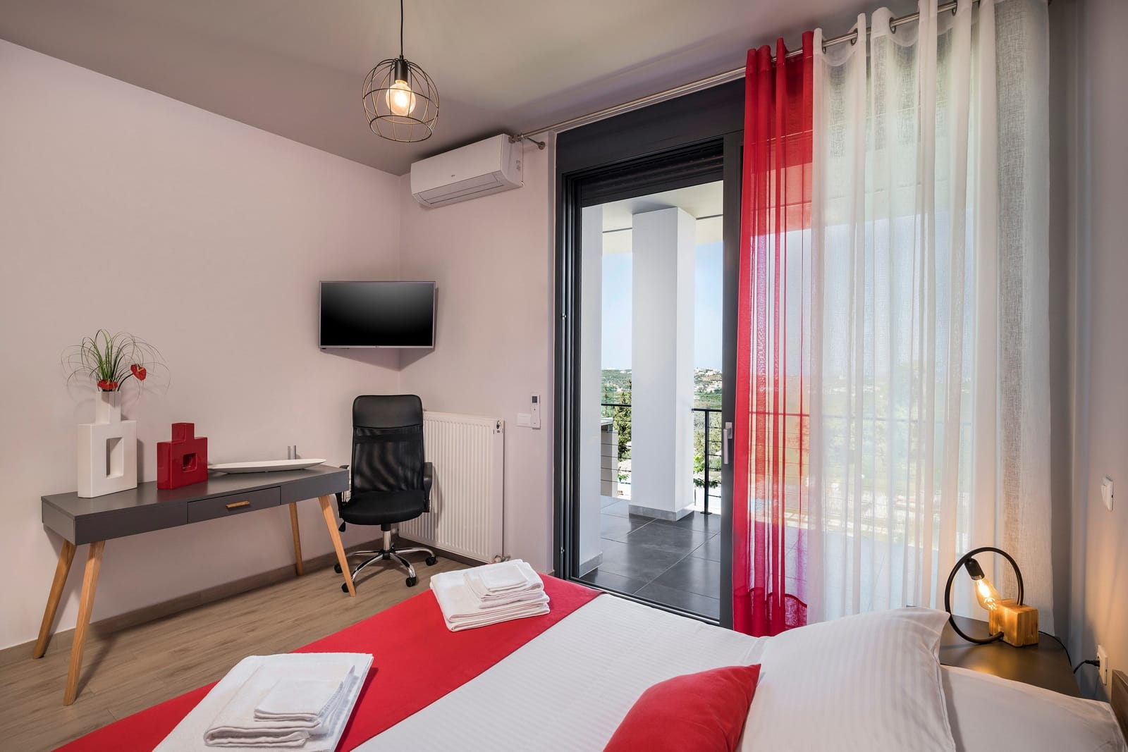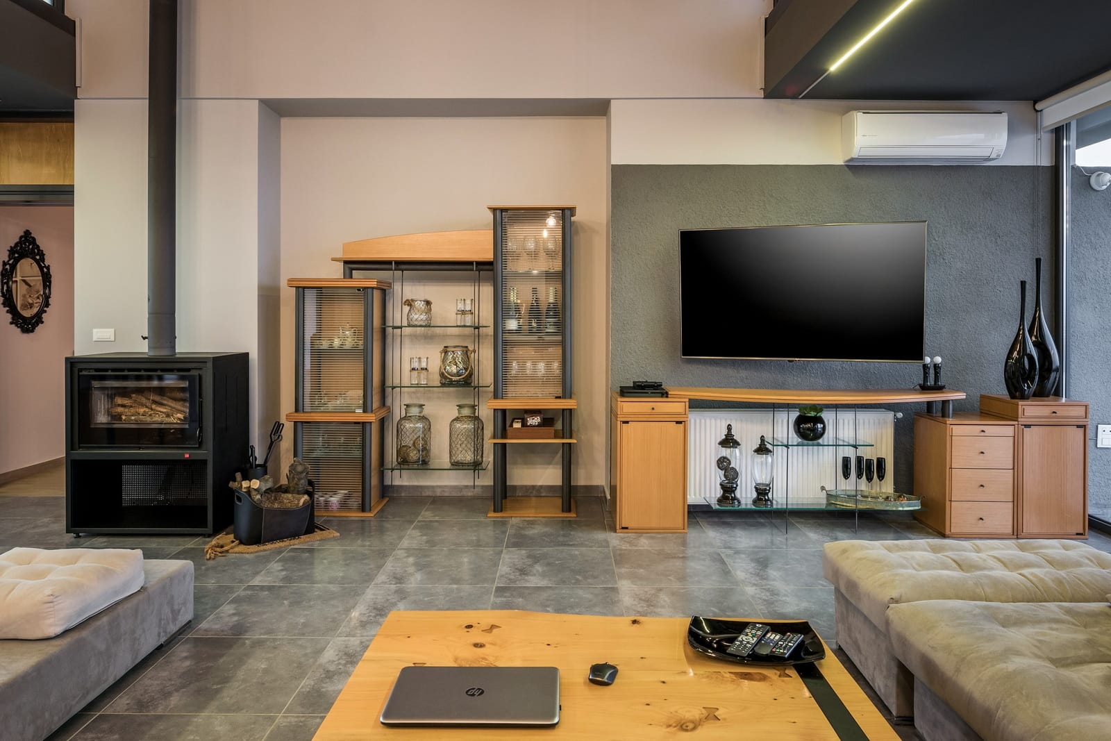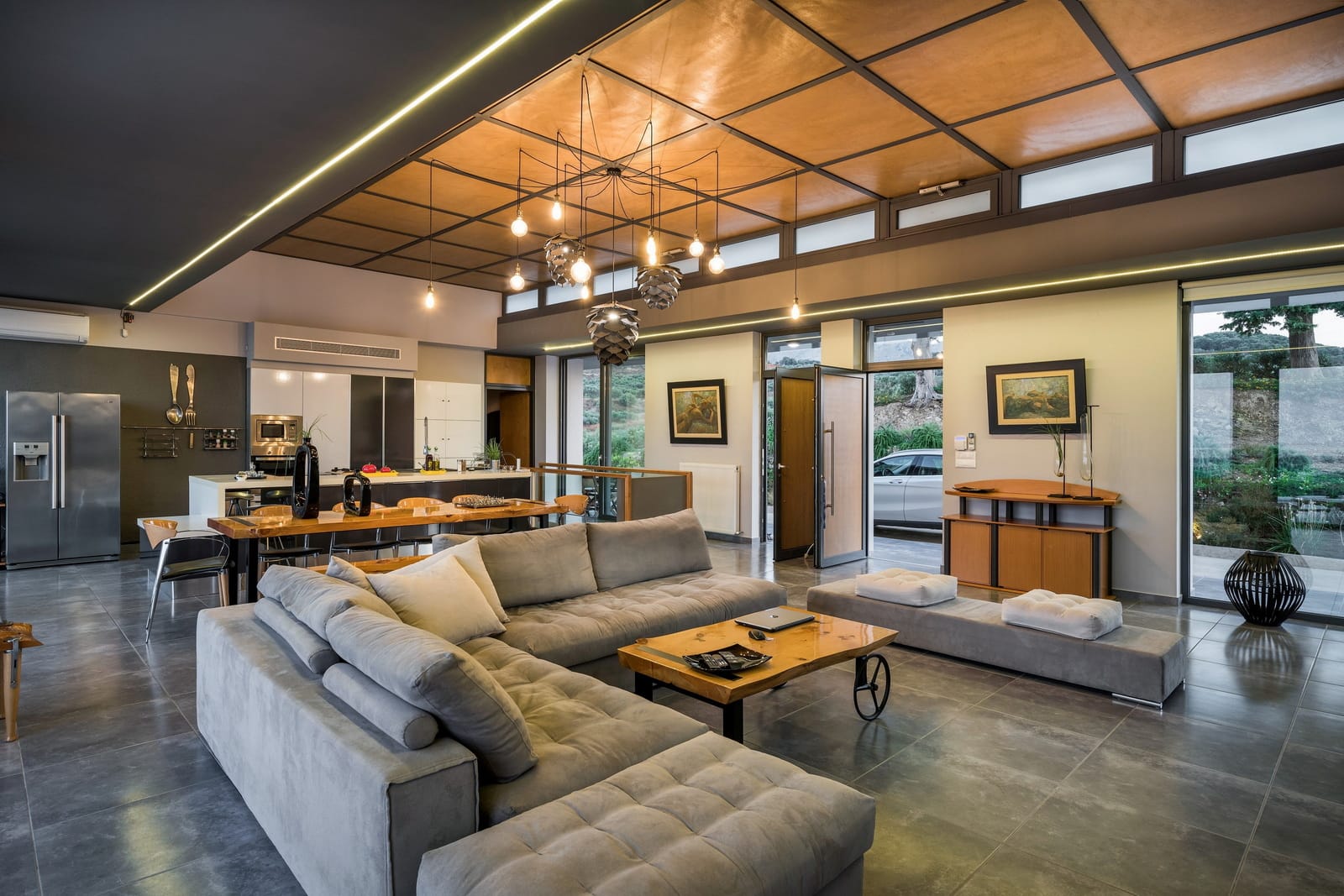 Olivenest Villa presents a picturesque location on the outskirts of Chania, for a family gathering or special occasion with the capacity to host 16 guests, and is outfitted with tasteful furnishing and modern comforts you require for a luxury holiday in Crete. Olivenest villa boasts a 500 m2 luxury living space, which is divided into a central part and 2 wings, functioning perfectly as 3 independent homes. There is an open plan living area with a terrace, plus a dining area and an ample kitchen with fantastic views over the pool and a centuries ’old olive tree. Outdoors, the glossy and comfort atmosphere is well-kept including multiple terraces, a private heated pool and lawn gardens with a BBQ. A small lawned area around the pool offers ample space for sunbeds surrounded by nature that will add value to your special moments. The view from the indoor and terrace is simply stunning, and the living areas are thoughtfully designed to offer maximum privacy and comfort; Olivenest Villa is spit in 3 separate and independent villas; the Royal floor (no stairs), with 3 bedrooms, 1 kitchen, 2 bathrooms, to accommodate 6 guests, the Imperial West Ground floor (no stairs), with 3 bedrooms, 1 kitchen, 1 bathroom to host 6 people and the Imperial East Ground floor (no stairs), with 2 bedrooms, 1 kitchen, 2 bathrooms, to host 4. Sink into the contemporary sofas in the central living room, which is laid out to the highest standards, cozy up to the kitchen’s facilities to prepare food and gather around the monastery type dining table for a special Greek meal with family or friends. You can sit back, relax and take in this fabulous setting from the massive balcony, or dive into the swimming pool and savor a vacation that allows you to connect with yourself at a leisurely pace.