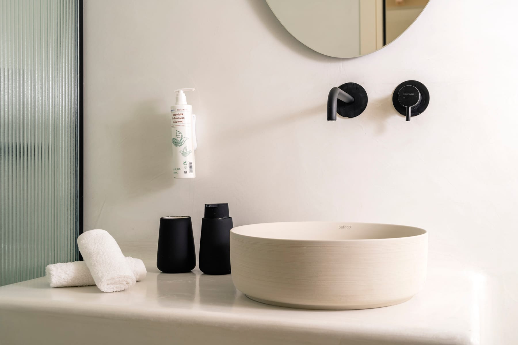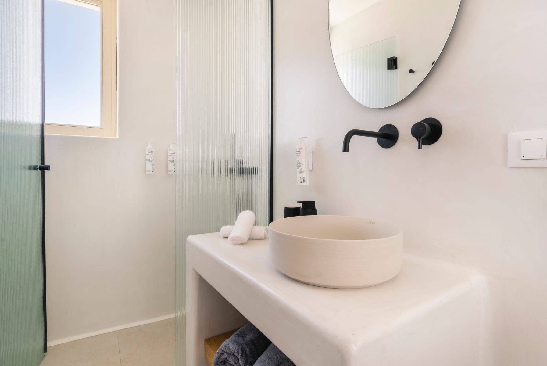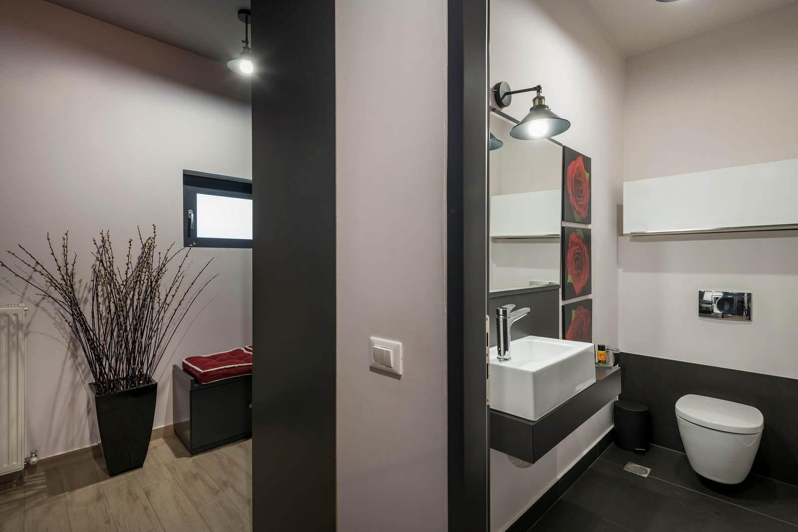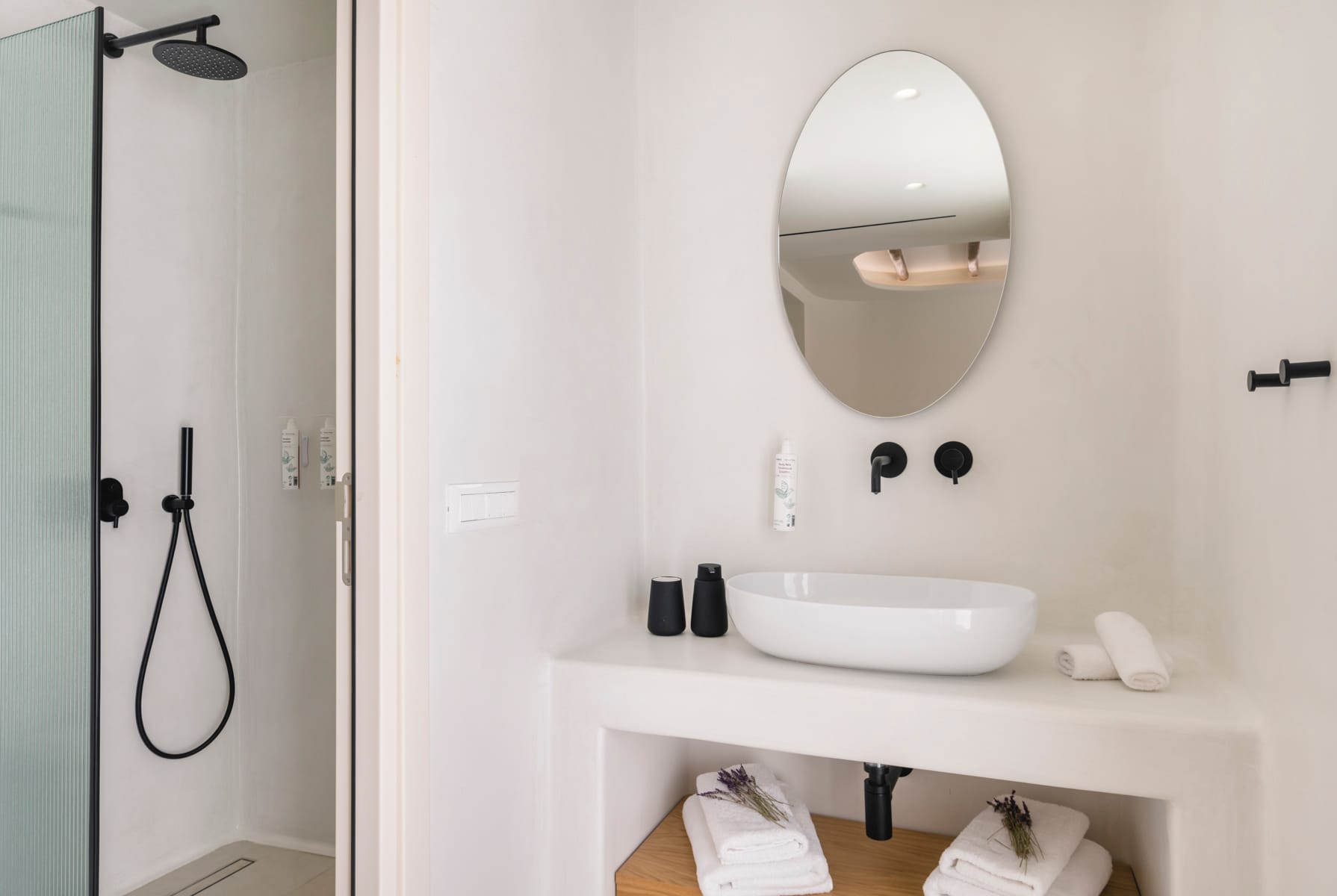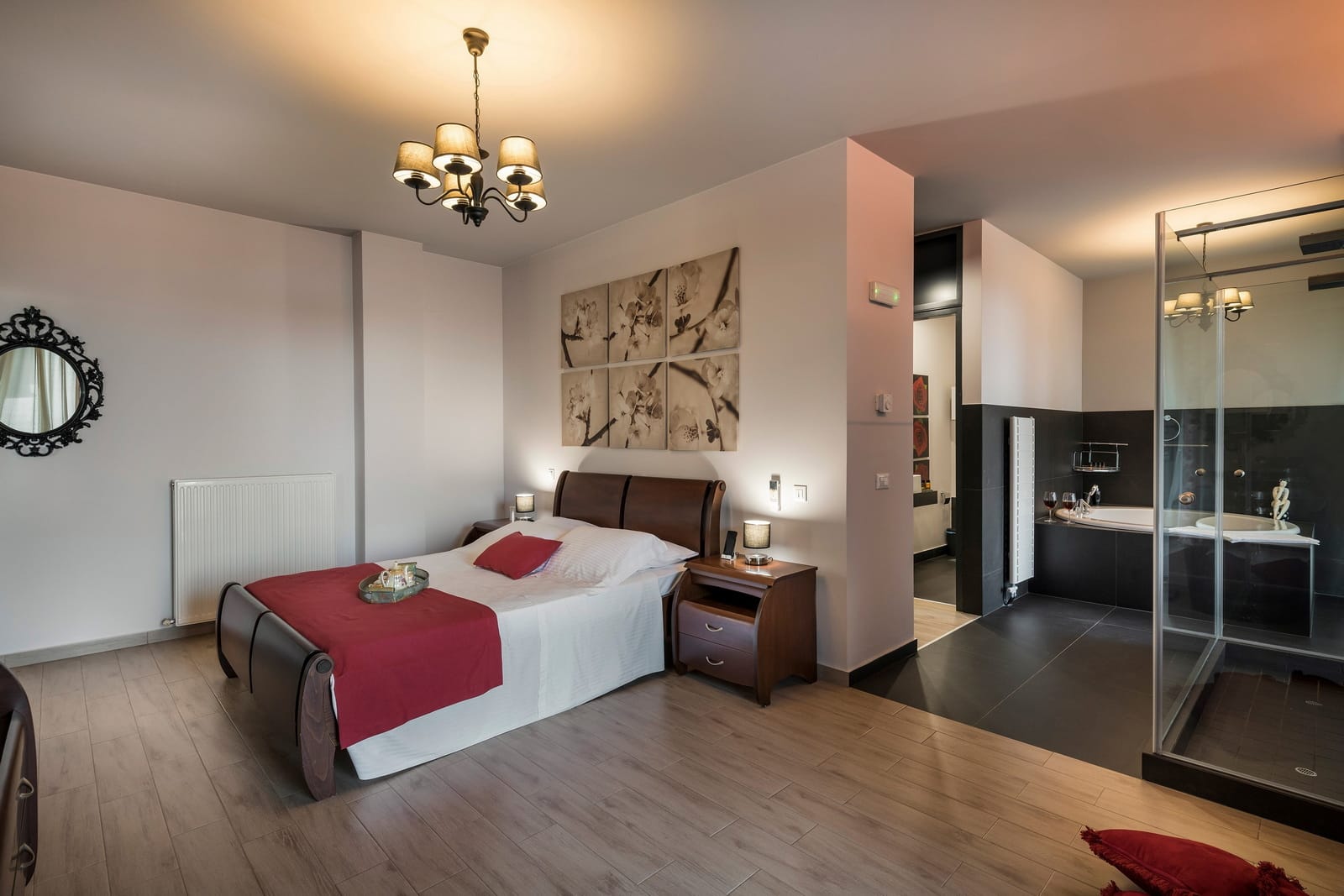 Olivenest Villa presents a picturesque location on the outskirts of Chania, for a family gathering or special occasion with the capacity to host 16 guests, and is outfitted with tasteful furnishing and modern comforts you require for a luxury holiday in Crete. Olivenest villa boasts a 500 m2 luxury living space, which is divided into a central part and 2 wings, functioning perfectly as 3 independent homes. There is an open plan living area with a terrace, plus a dining area and an ample kitchen with fantastic views over the pool and a centuries ’old olive tree. Outdoors, the glossy and comfort atmosphere is well-kept including multiple terraces, a private heated pool and lawn gardens with a BBQ. A small lawned area around the pool offers ample space for sunbeds surrounded by nature that will add value to your special moments. The view from the indoor and terrace is simply stunning, and the living areas are thoughtfully designed to offer maximum privacy and comfort; Olivenest Villa is spit in 3 separate and independent villas; the Royal floor (no stairs), with 3 bedrooms, 1 kitchen, 2 bathrooms, to accommodate 6 guests, the Imperial West Ground floor (no stairs), with 3 bedrooms, 1 kitchen, 1 bathroom to host 6 people and the Imperial East Ground floor (no stairs), with 2 bedrooms, 1 kitchen, 2 bathrooms, to host 4. Sink into the contemporary sofas in the central living room, which is laid out to the highest standards, cozy up to the kitchen’s facilities to prepare food and gather around the monastery type dining table for a special Greek meal with family or friends. You can sit back, relax and take in this fabulous setting from the massive balcony, or dive into the swimming pool and savor a vacation that allows you to connect with yourself at a leisurely pace.
