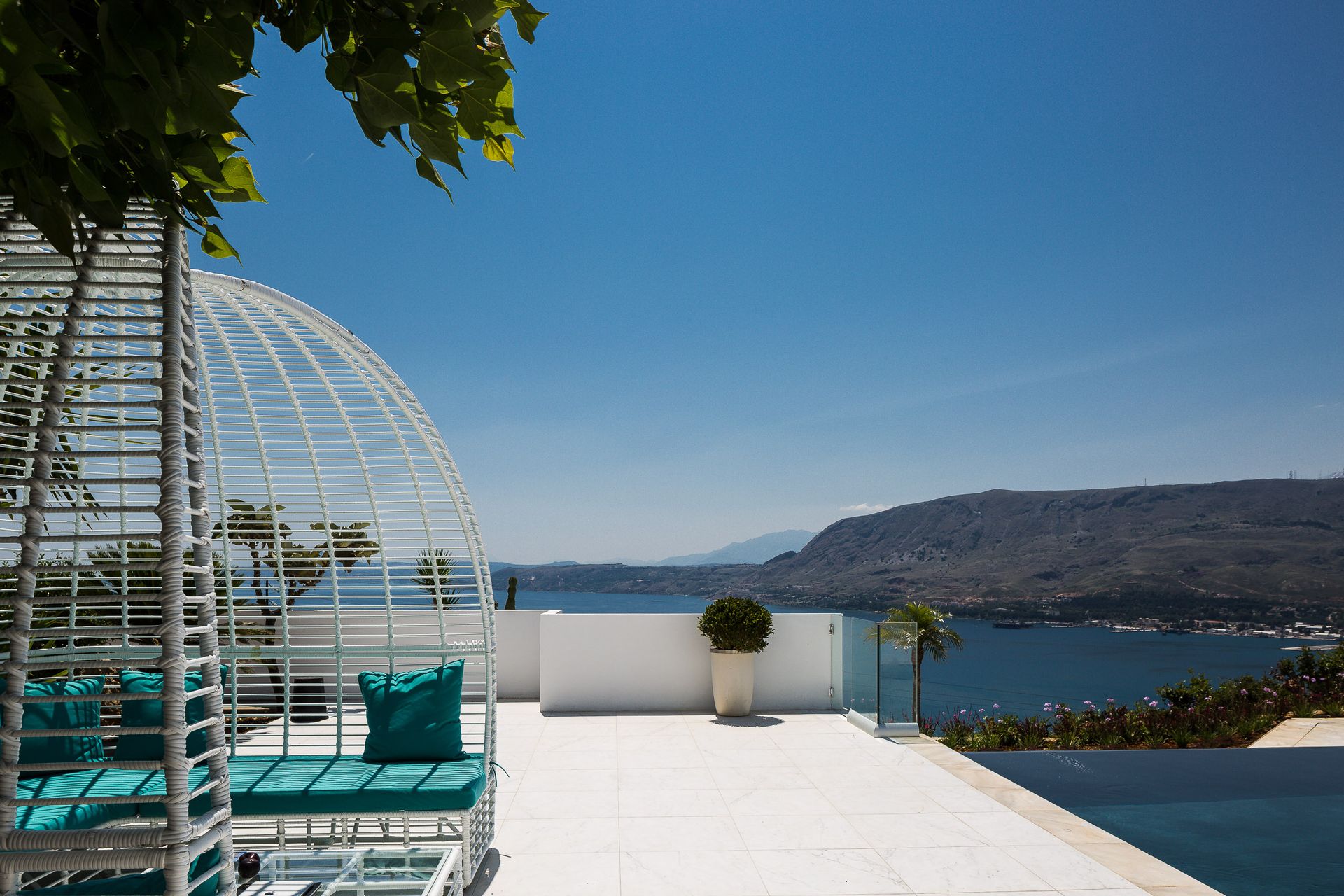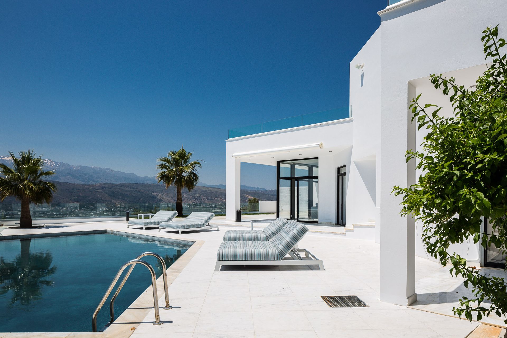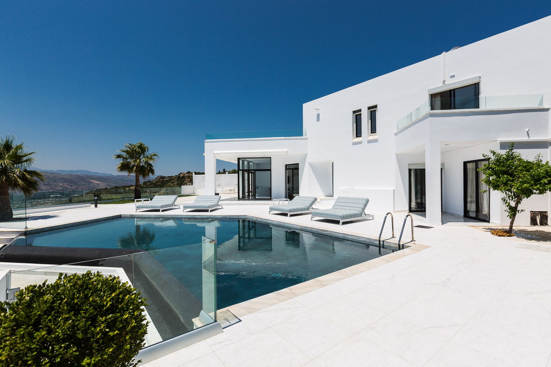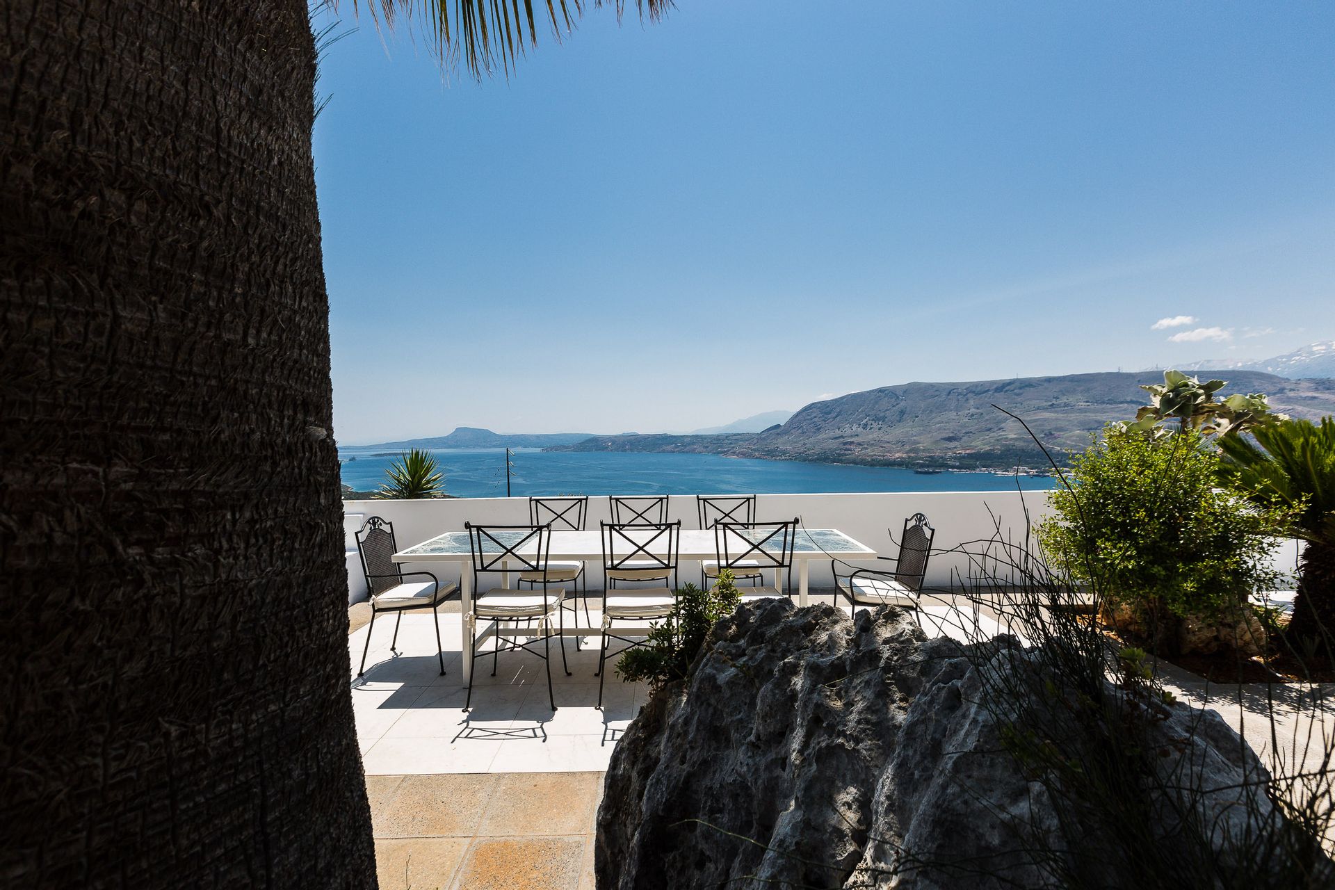 Epic & spectacular in every way vacation villa offering sensational blue sea and mountain vistas from the edge of a secluded hill-top with stylish finish, white interiors and sleek exterior spaces, also capable of hosting memorable wedding events. The concept was to design a pearly spacious luxury villa with exquisite architecture that create the feeling that guests are on board, facing the calm waters of the Souda Bay.