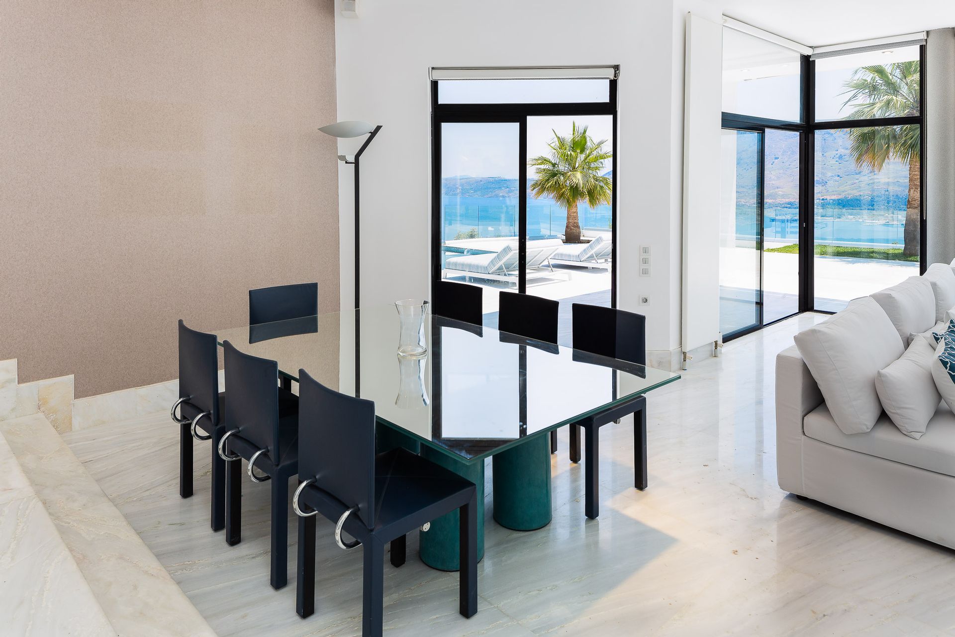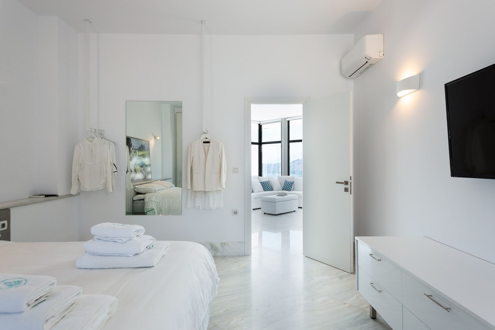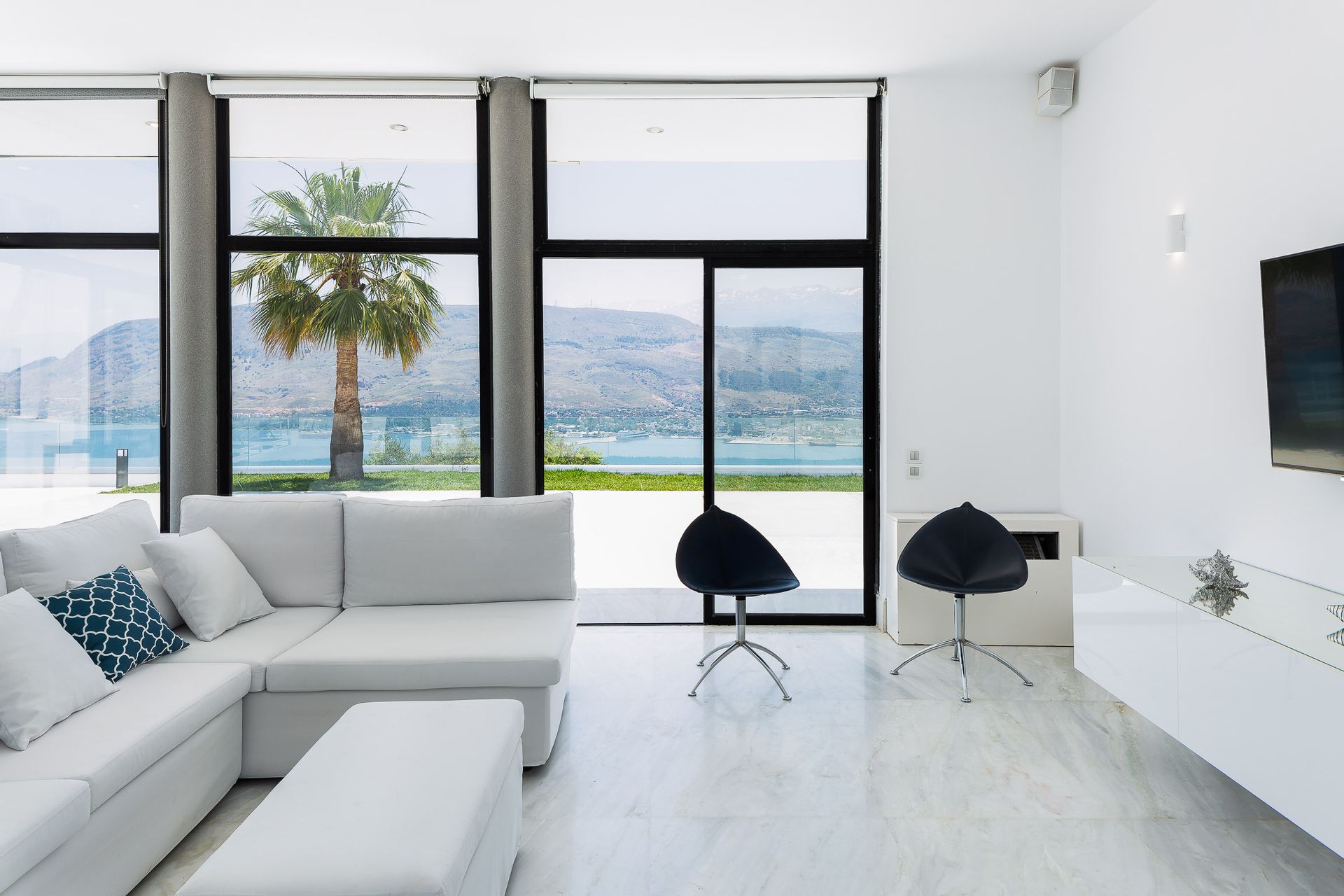 Epic & spectacular in every way vacation villa offering sensational blue sea and mountain vistas from the edge of a secluded hill-top with stylish finish, white interiors and sleek exterior spaces, also capable of hosting memorable wedding events. The concept was to design a pearly spacious luxury villa with exquisite architecture that create the feeling that guests are on board, facing the calm waters of the Souda Bay.