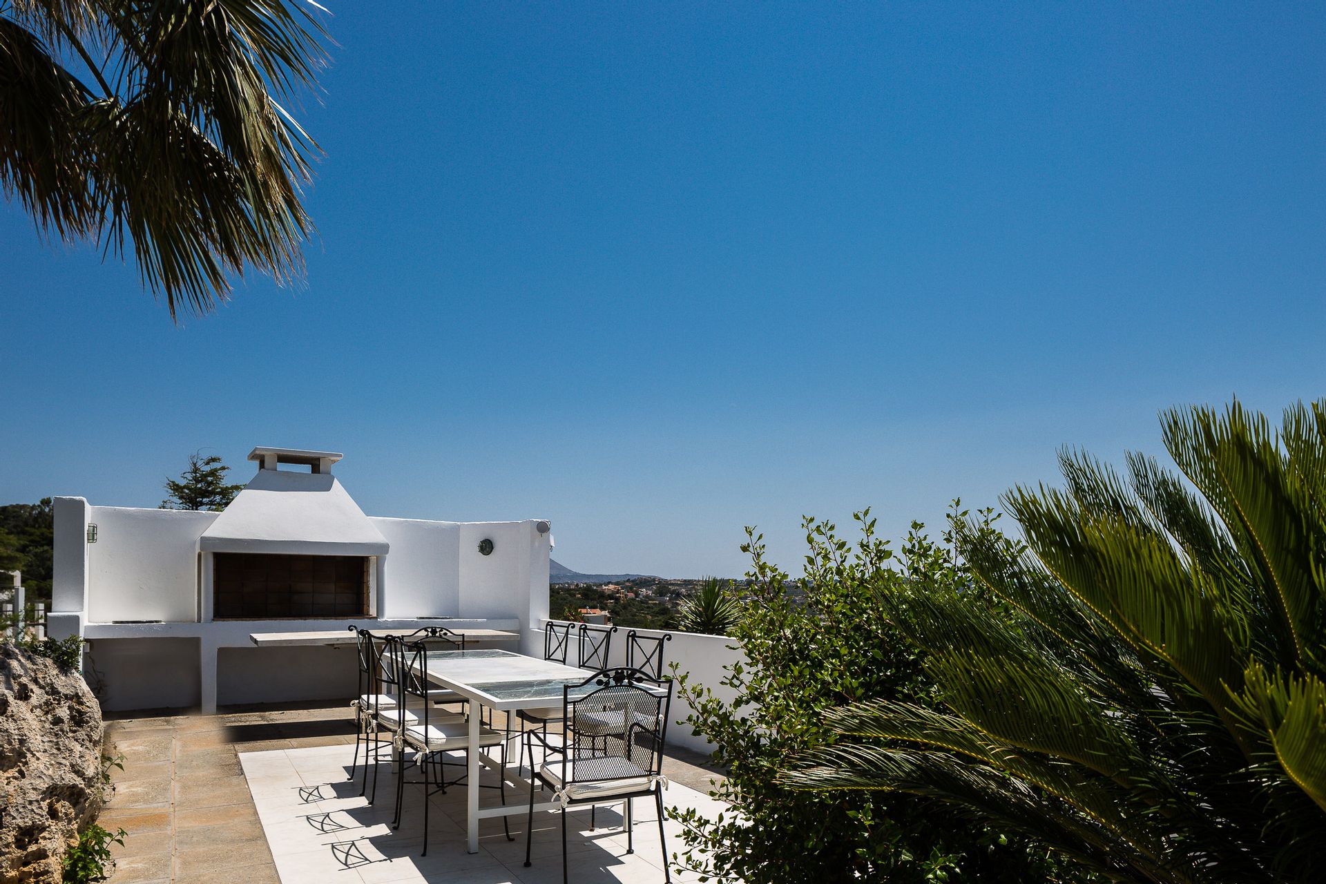 Paul's Mansion has five bedrooms all with king size beds and their own bathrooms paired to the style of each bedroom, while the master bedroom is an exemplar of its kind with a big bathroom, a walk in closet and access to a balcony with a Jacuzzi. The fresh white palette interior reflects neutrality and subtle sophistication, while the total layout of the mansion makes for an easy family holiday with children of all ages. An infinity pool, a Jacuzzi and a terrace of sun-worship bring the style and comfort on the outdoor living space where you can admire the panorama of the entire Souda Bay, inspiring both relaxation and excitement. Enjoy the loungers and al fresco dining or pour yourself a cool cocktail and relish the Cretan breezy summer evenings that feel like a celebration. Amid the striking combination of sea and mountain backdrops in western Crete, this villa will give you the best luxury vacation experience or fairytale venues, offering amazing photography options for your portraits and group shots, with the wonderful backdrop of the proud White Mountains, so that all the elements of the contradictory sceneries of the resort island of Crete can be enjoyed in sheer luxury.