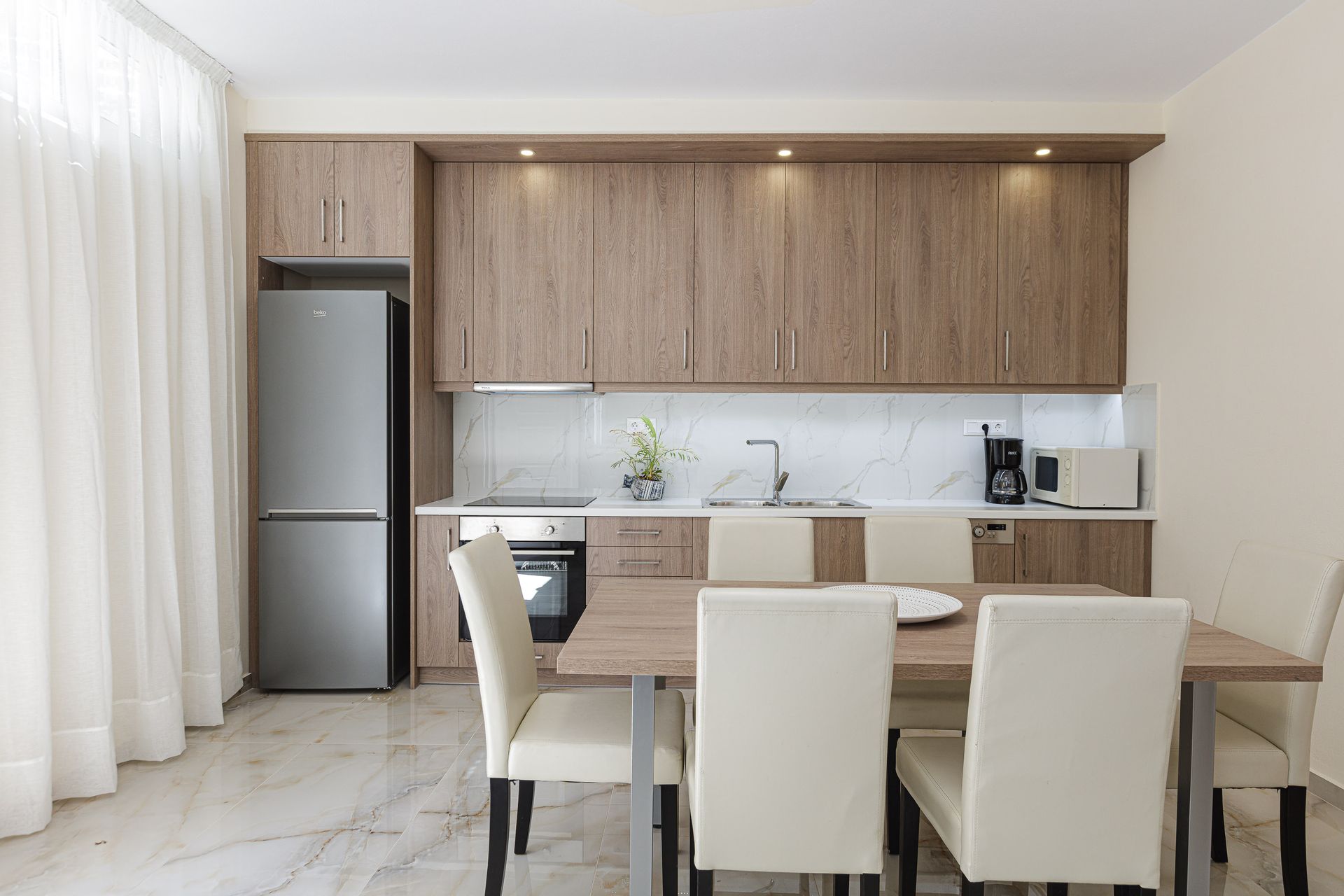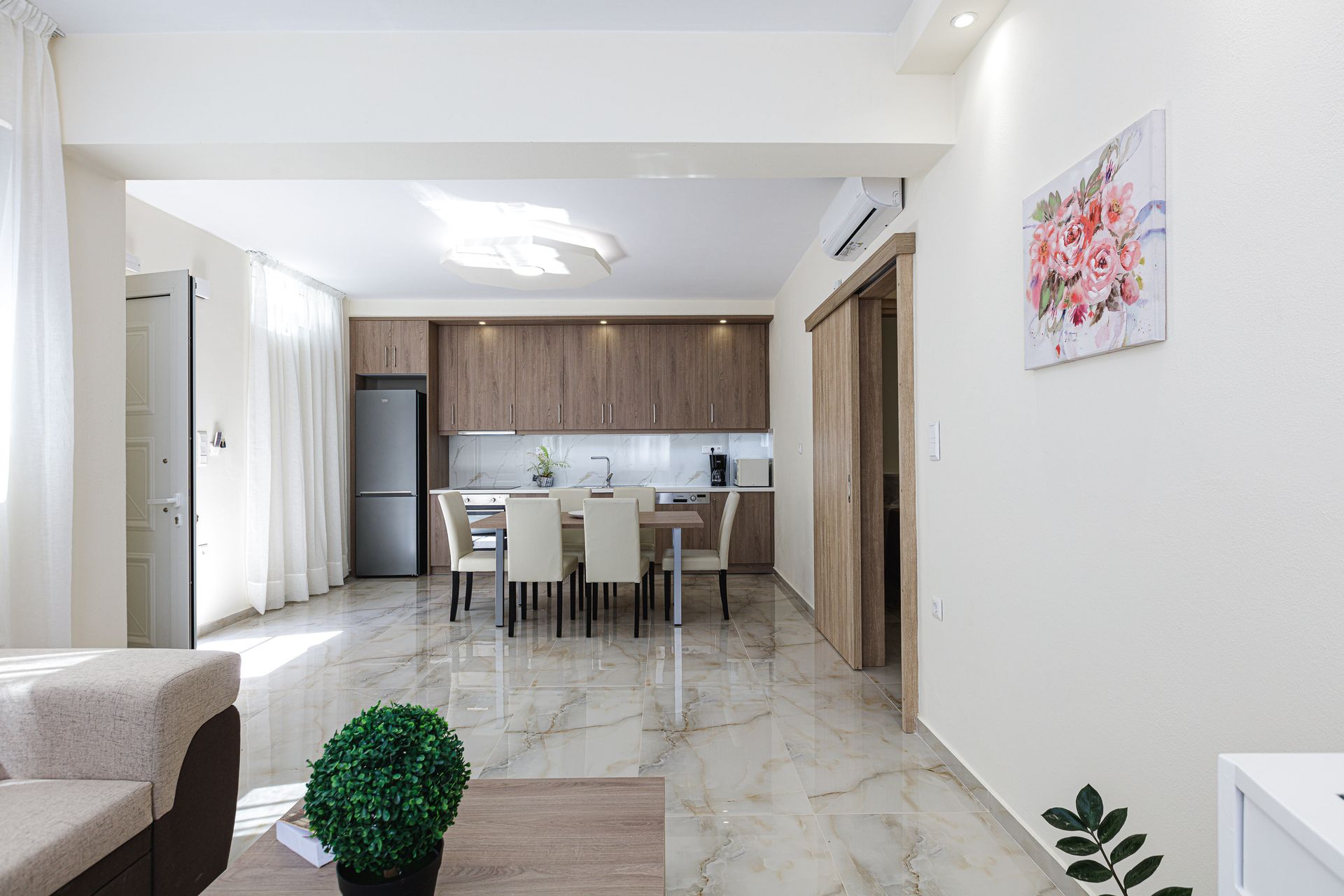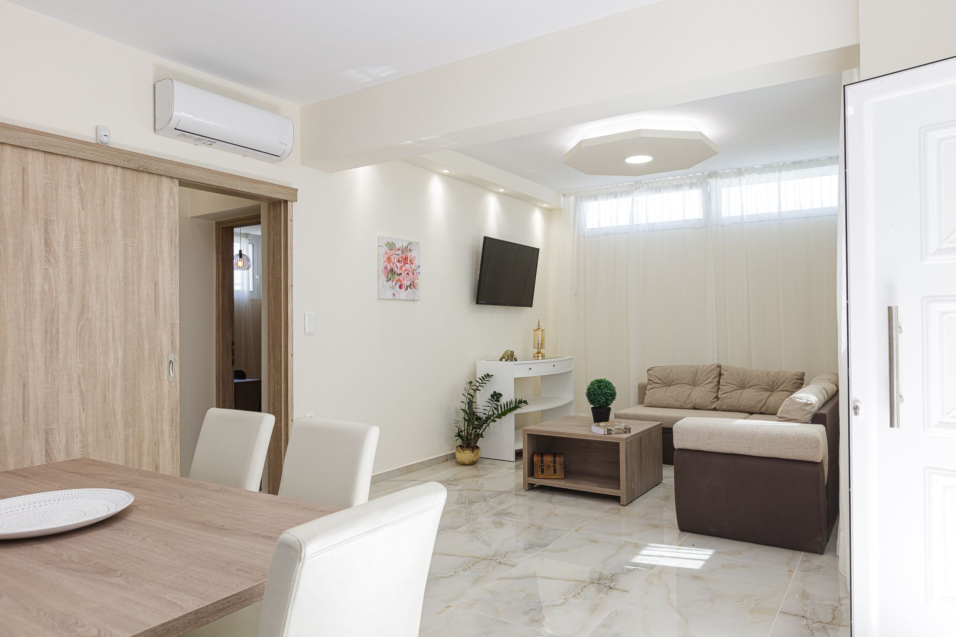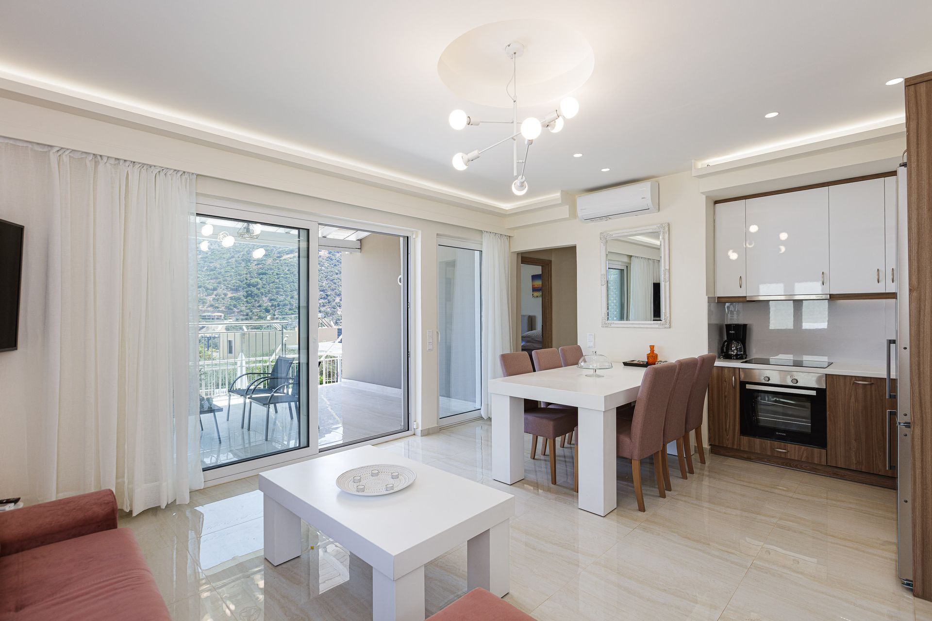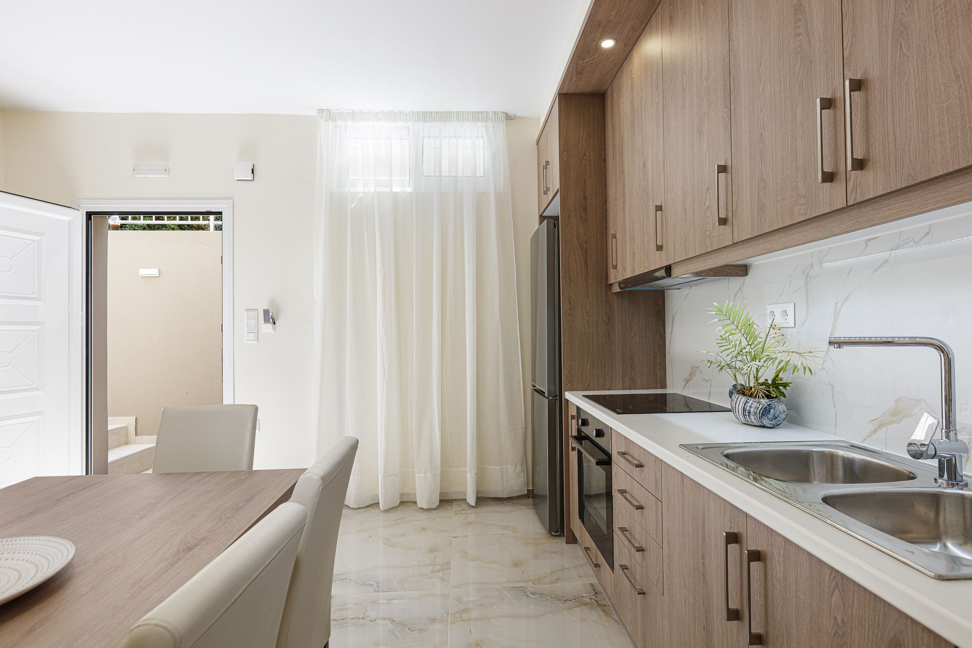 Kitchen and living room with direct access to the patio and pool area, dining table, 1 double bedroom ,1 twin bedroom & 1 big bathroom