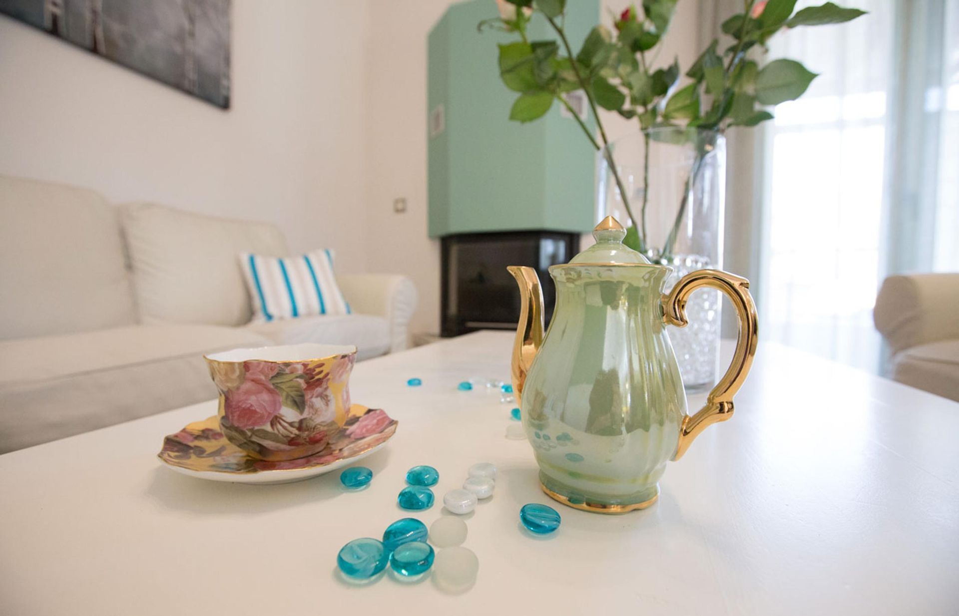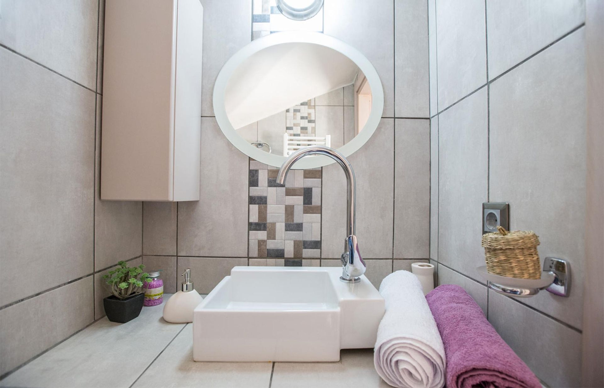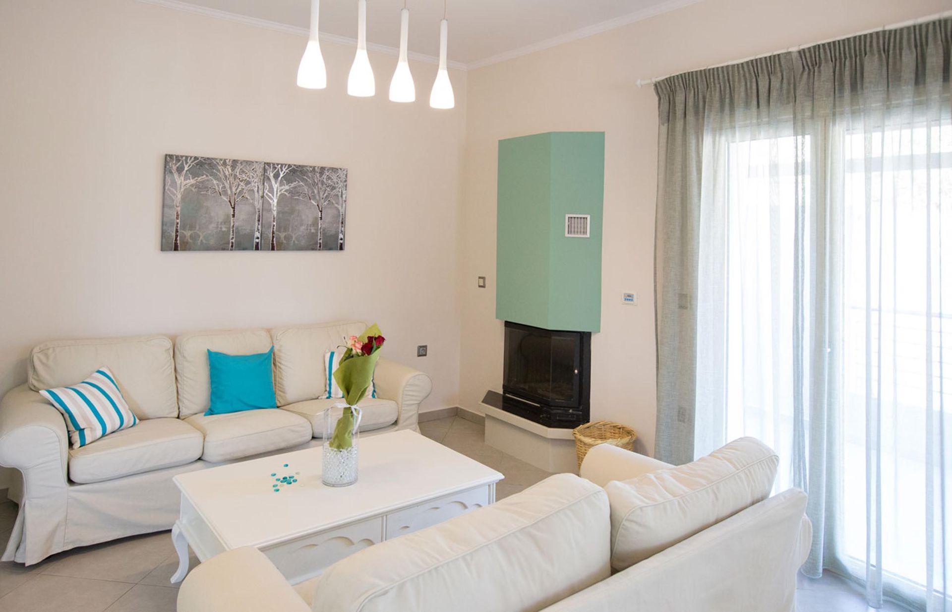 The property is 500 square meters and the villa is 120 square meters. The swimming pool has a children’s corner, sun loungers and sun beds are also provided. Villa can accommodate up to 6 people in its two double bedrooms, one twin bedroom, WC (with no shower) and WC/bathroom. You can have fun at the hydro massage cabin in the villa. Moreover there is a fully equipped kitchen with all modern comforts such as oven, dishwasher, fridge, coffee maker, toaster, blender etc… coffee and sugar are available aswell. The stylish and beautifully decorated living room has a fireplace, big screen HDTV with satellite cable, dvd player, WIFI and air condition. While seating at the balcony on the first floor you can enjoy sea and landscape views.