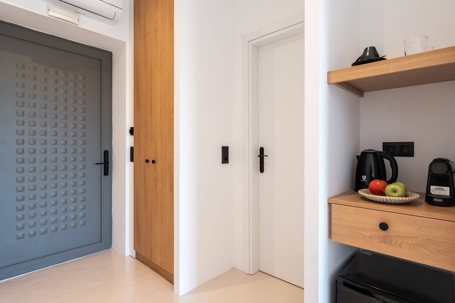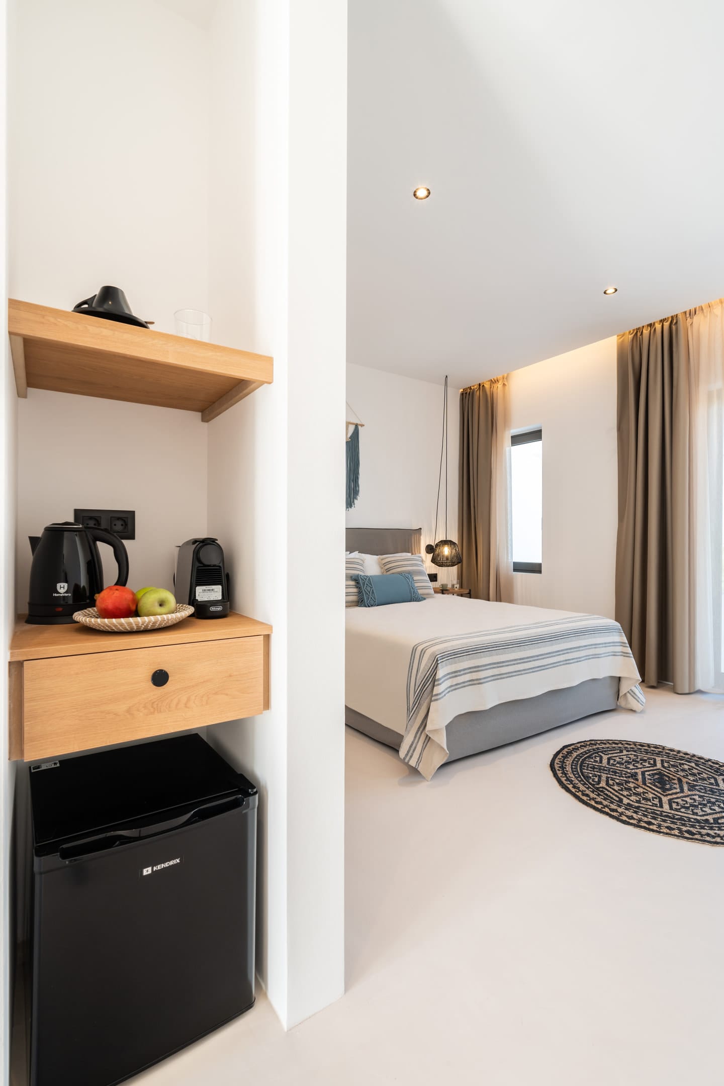 A convenient kitchenette, equipped with essential amenities like a Nespresso machine and kettle, ideal for enjoying a quick caffeine fix or hot beverage. Additionally, a mini fridge is available for storing your snacks and refreshments.