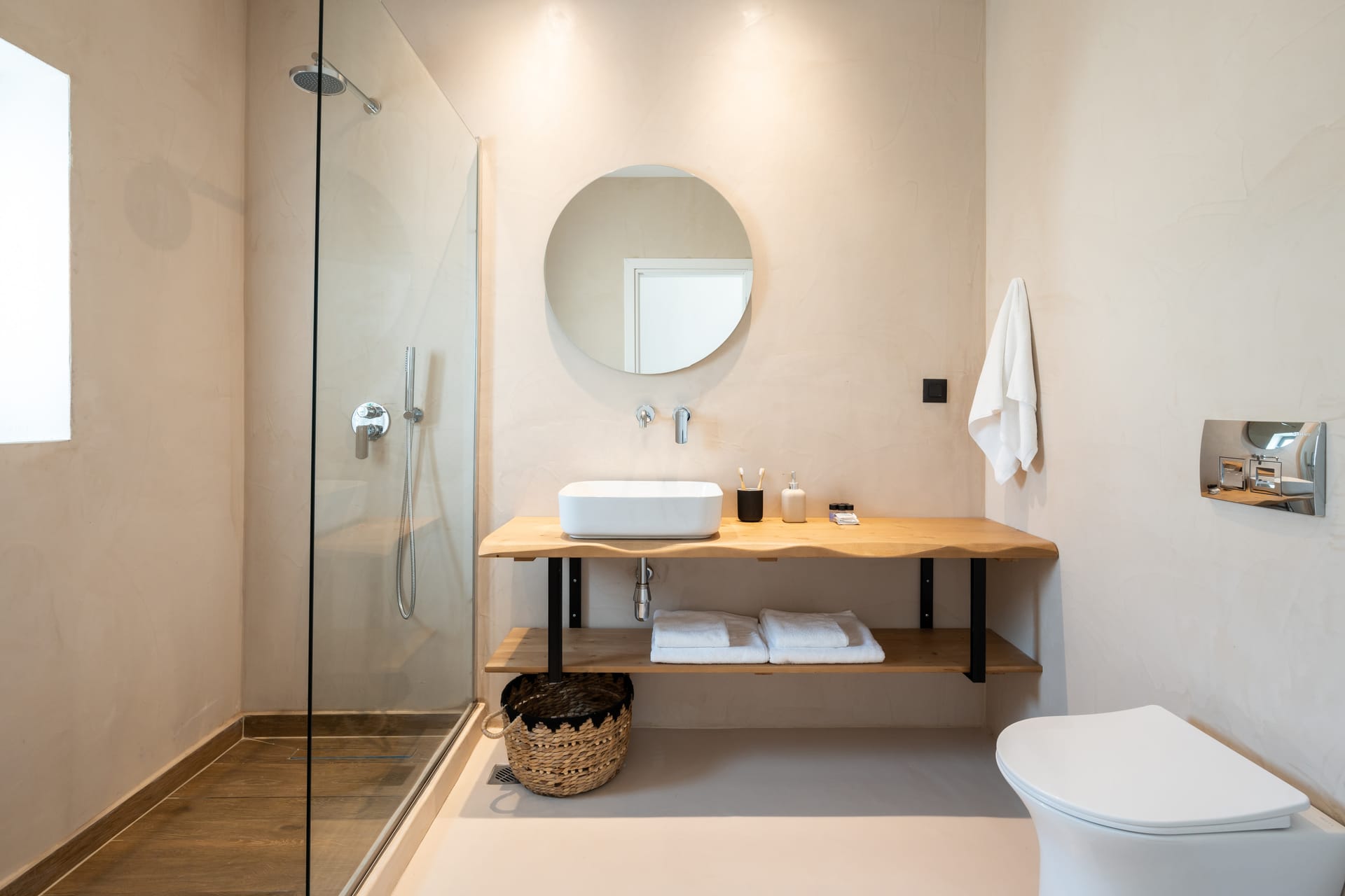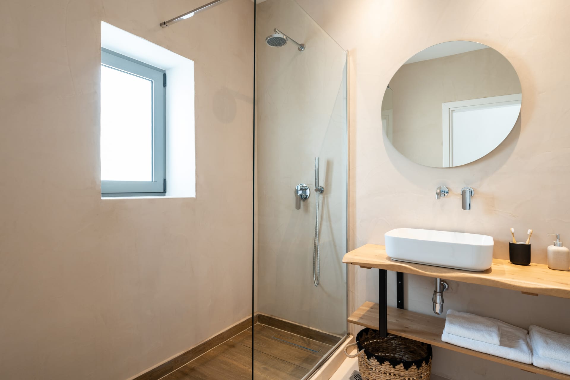 The well-appointed bathroom features modern fixtures and a refreshing shower, inviting you to unwind and pamper yourself in style.