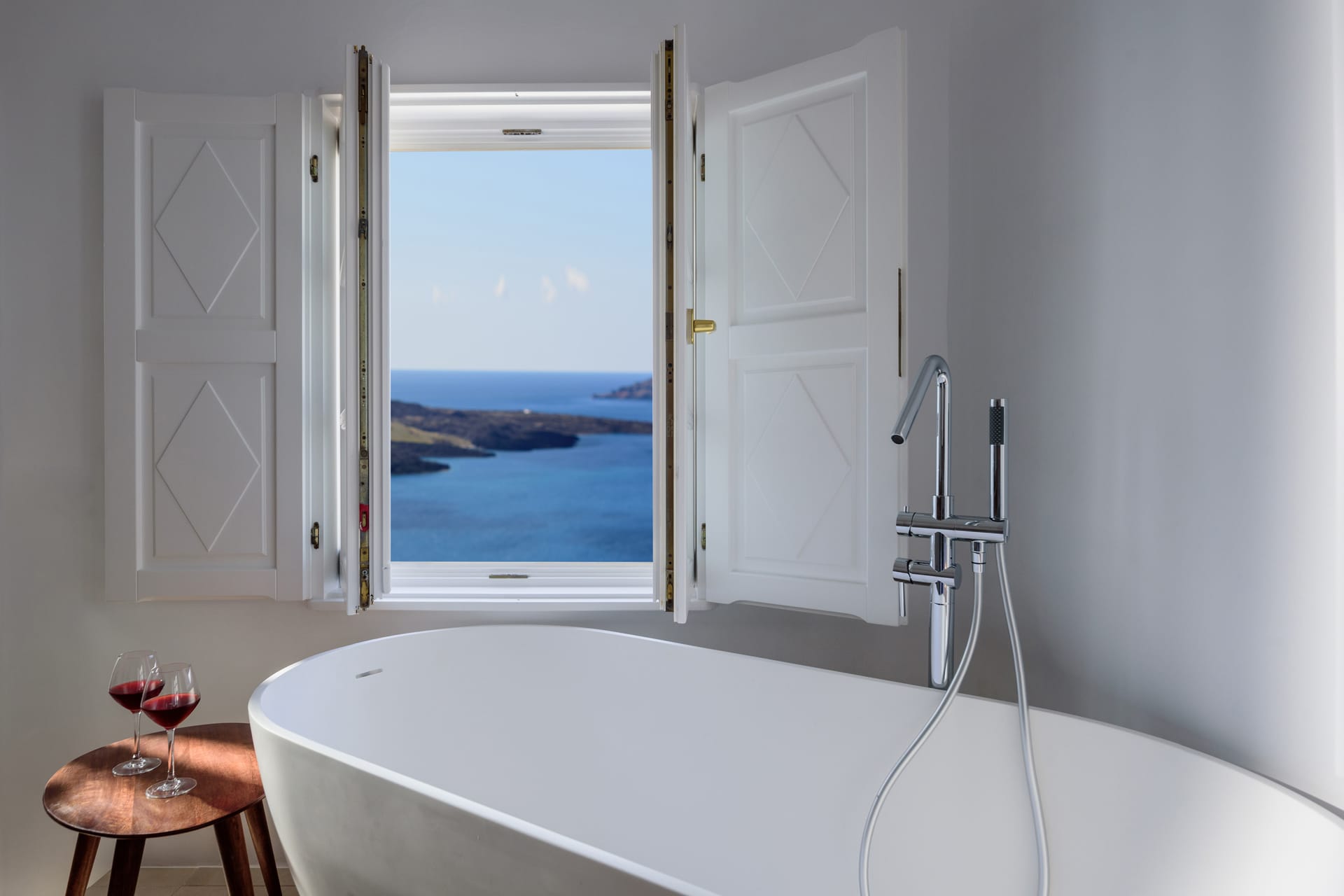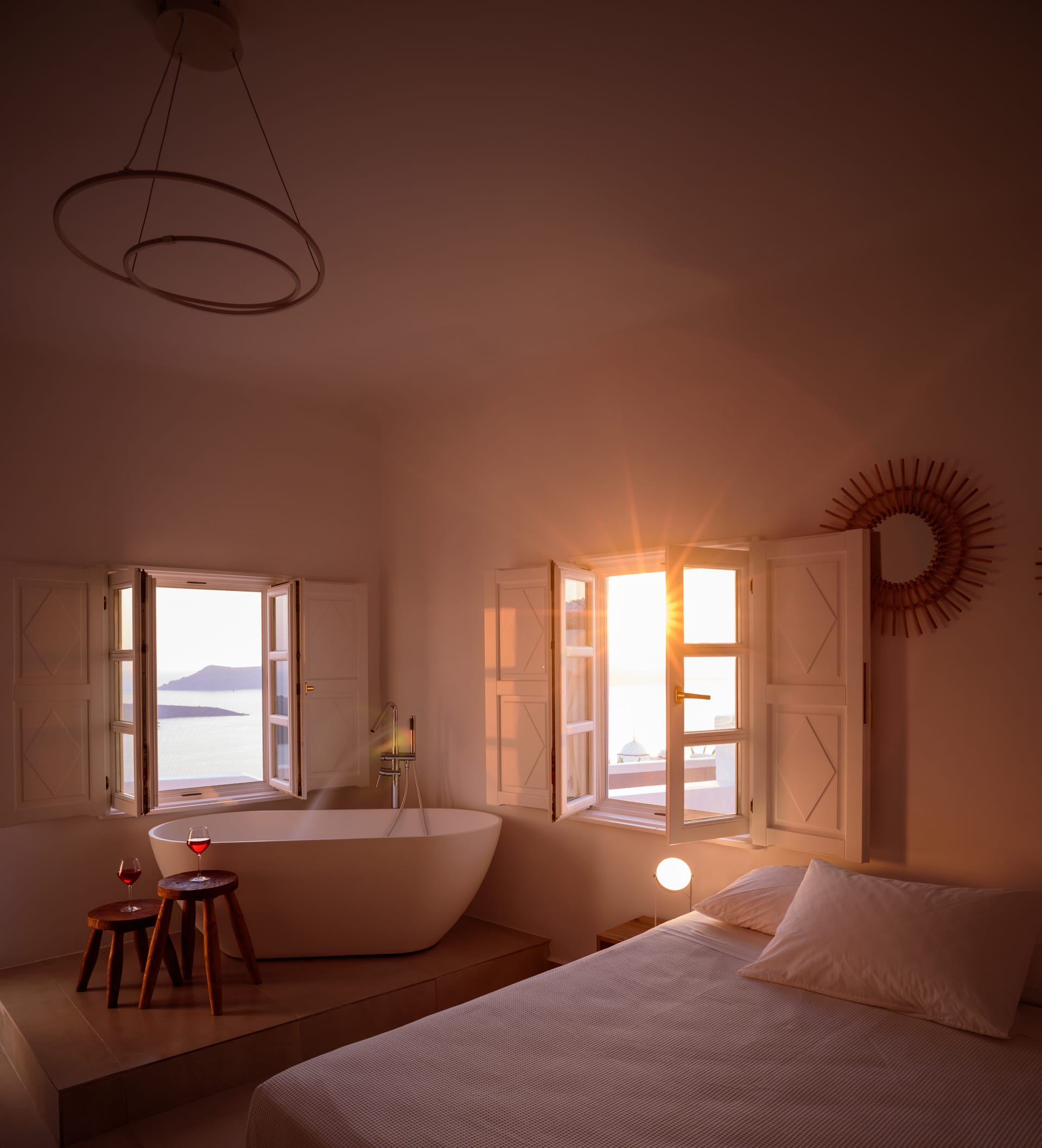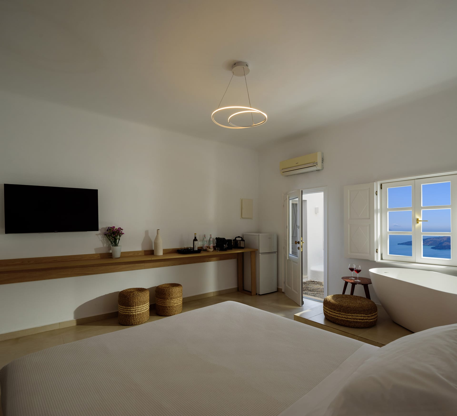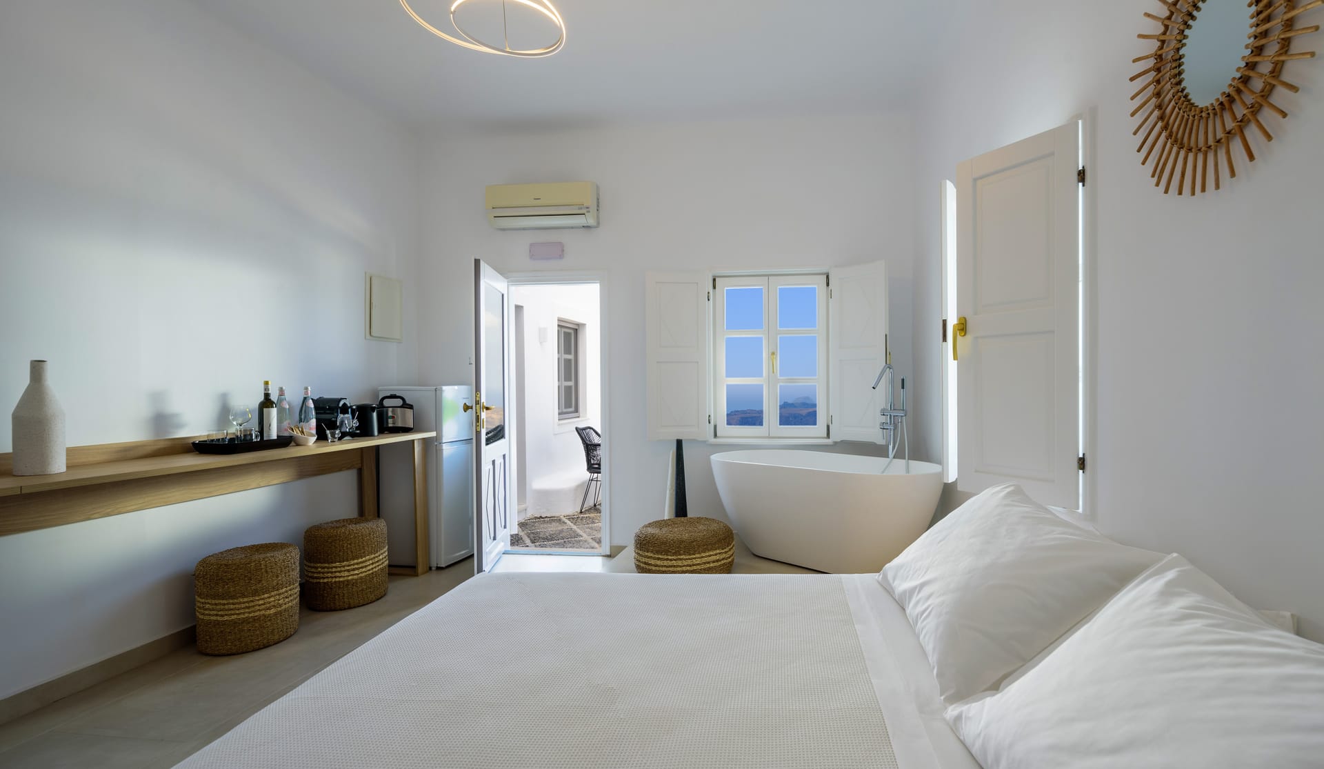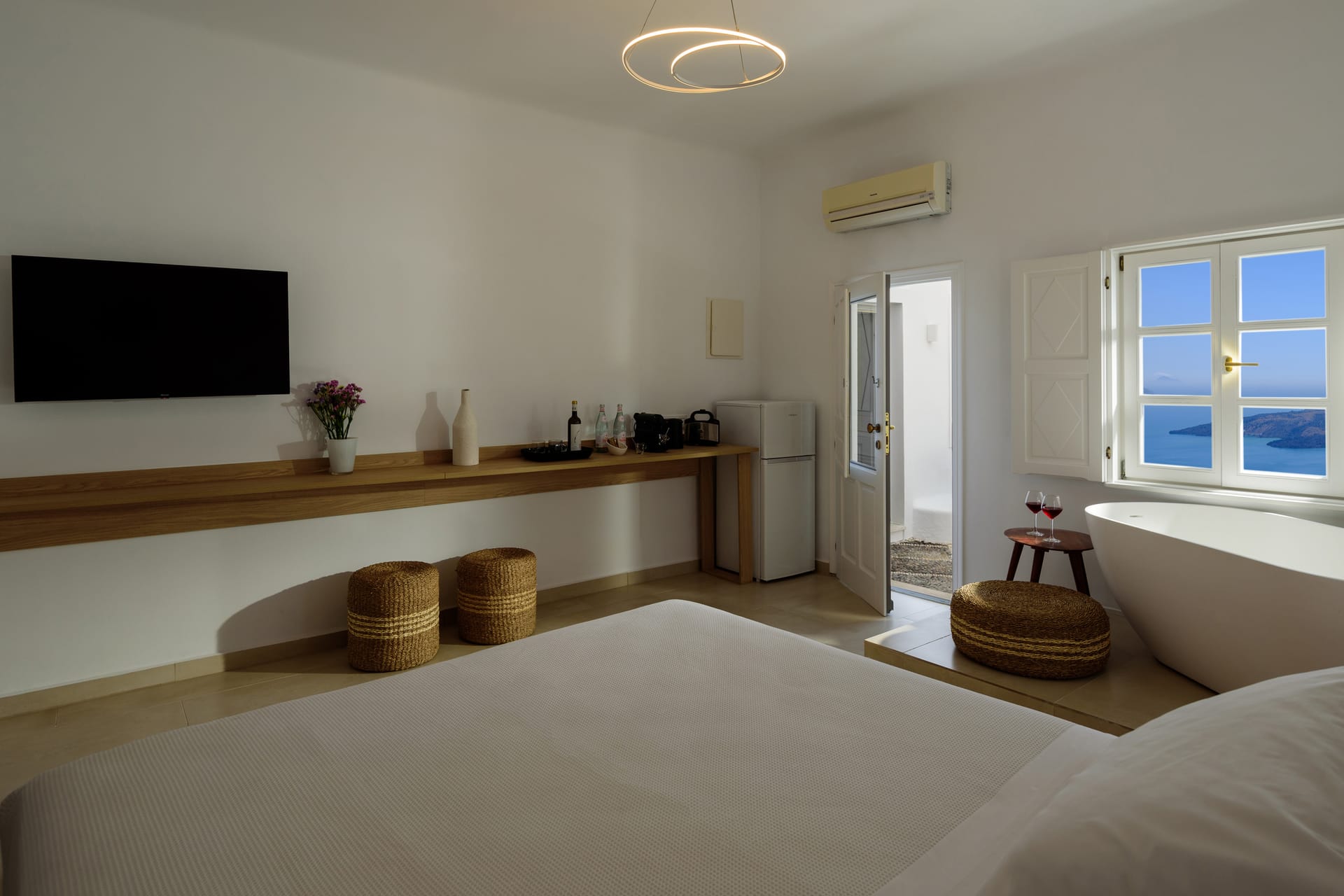 The deluxe suite can accommodate up to 2 guests, with a queen bed, shower and bathtub with a view to Caldera.