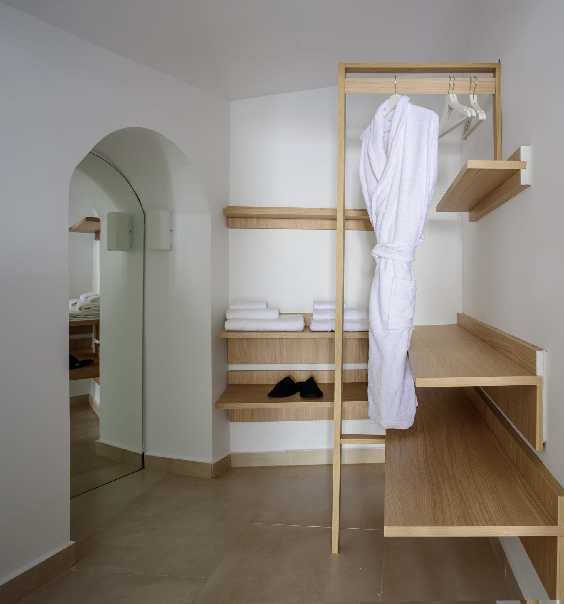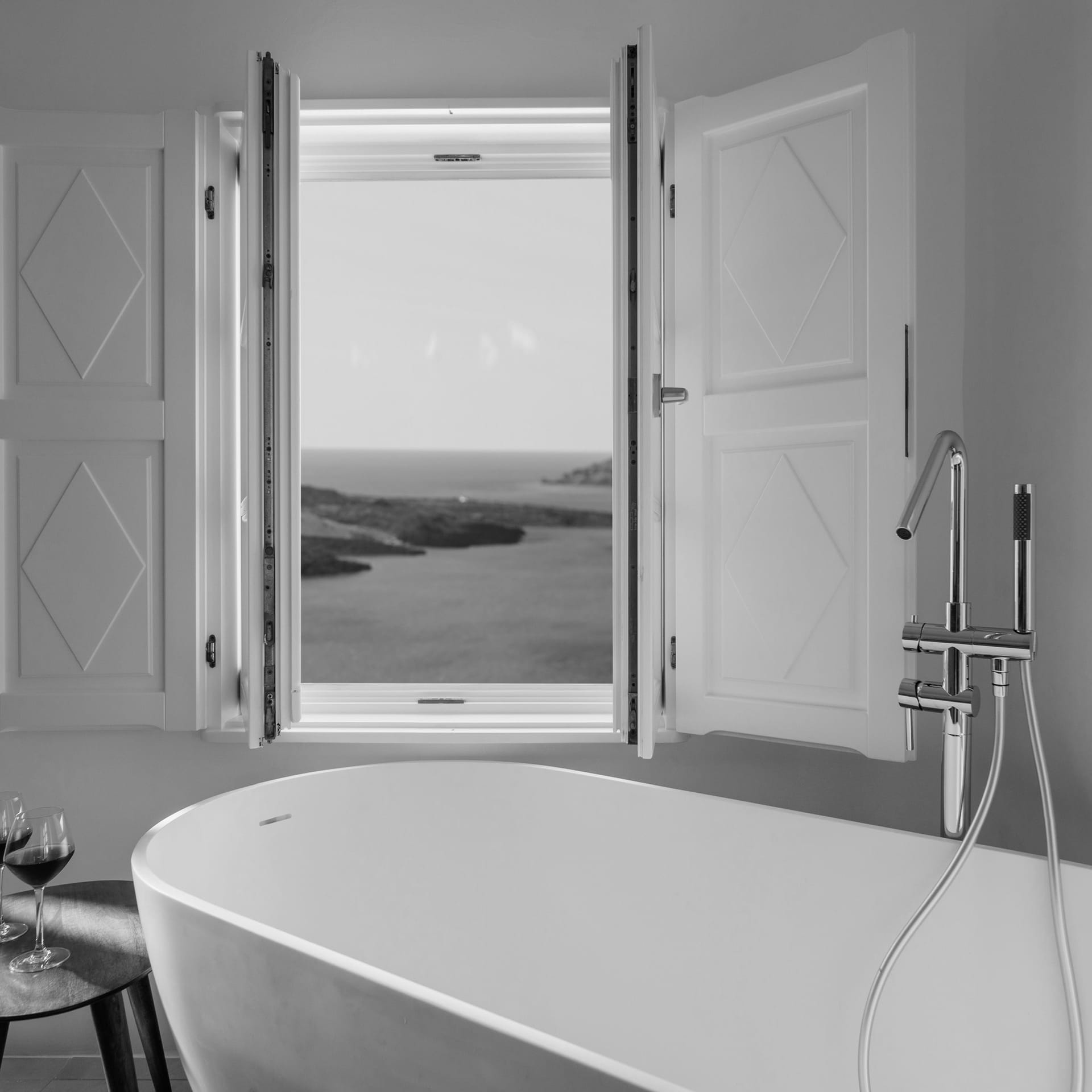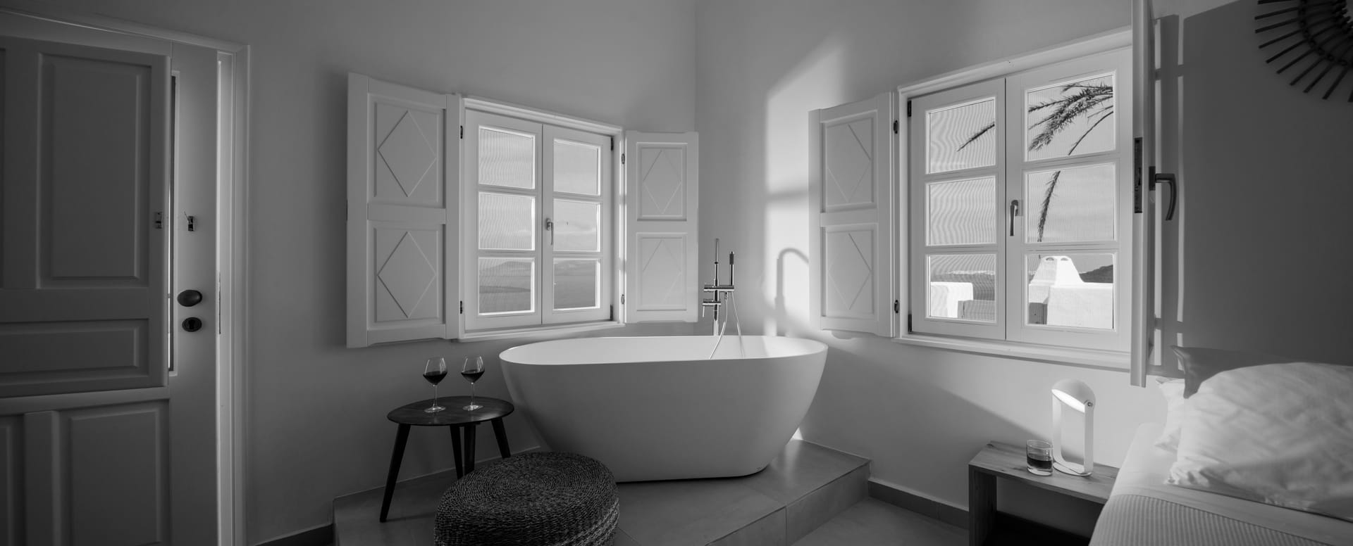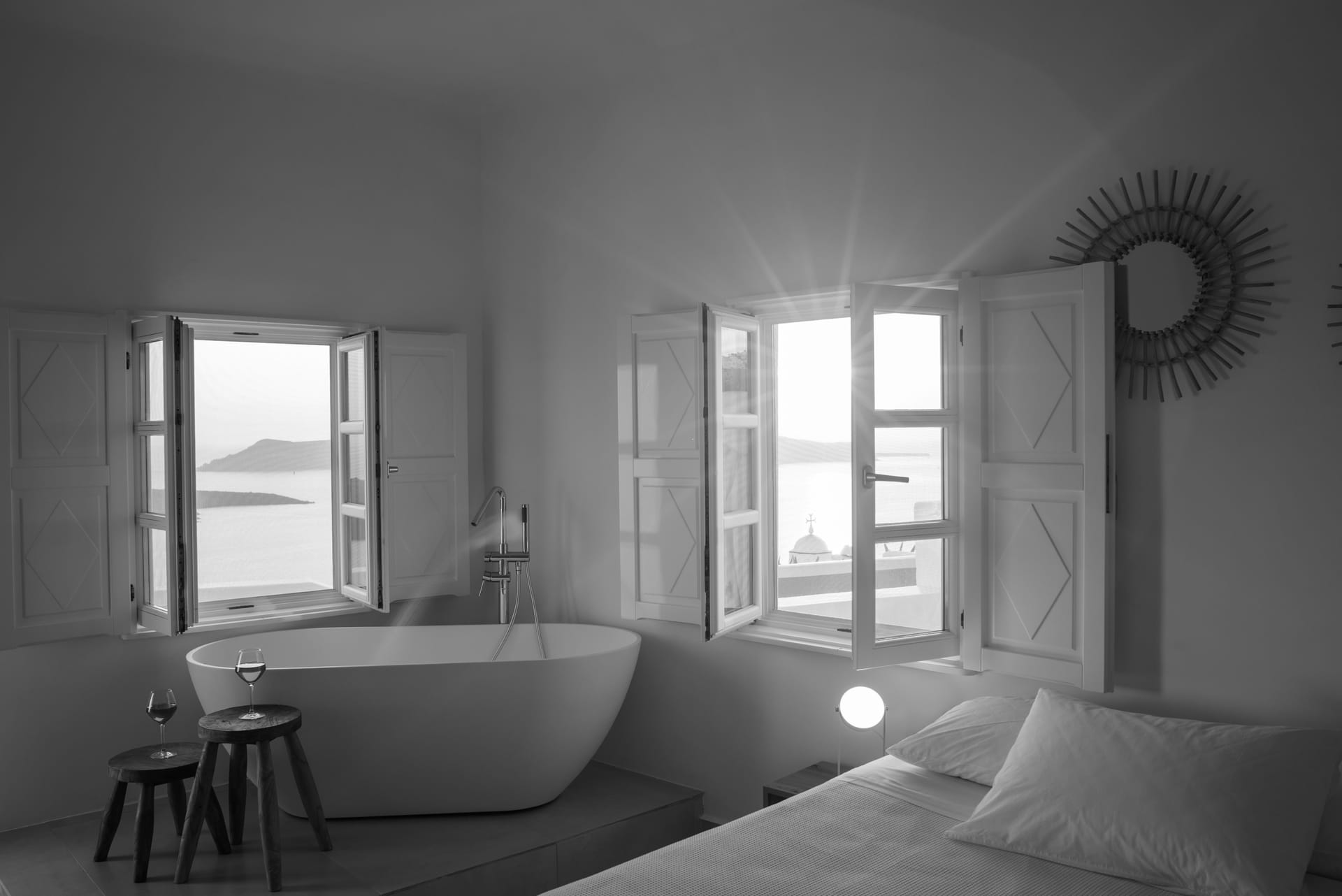 The deluxe suite can accommodate up to 2 guests, with a queen bed, shower and bathtub with a view to Caldera.