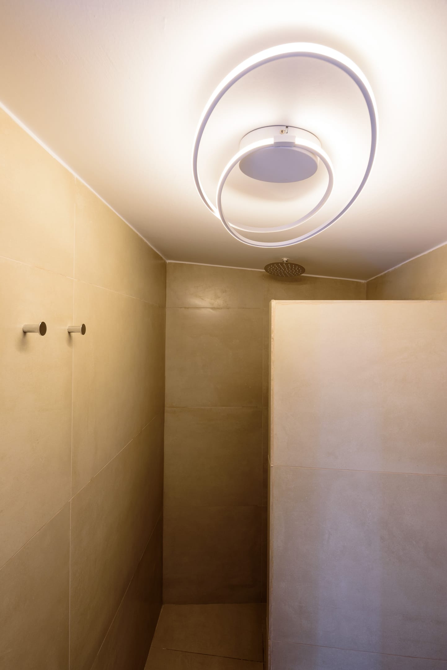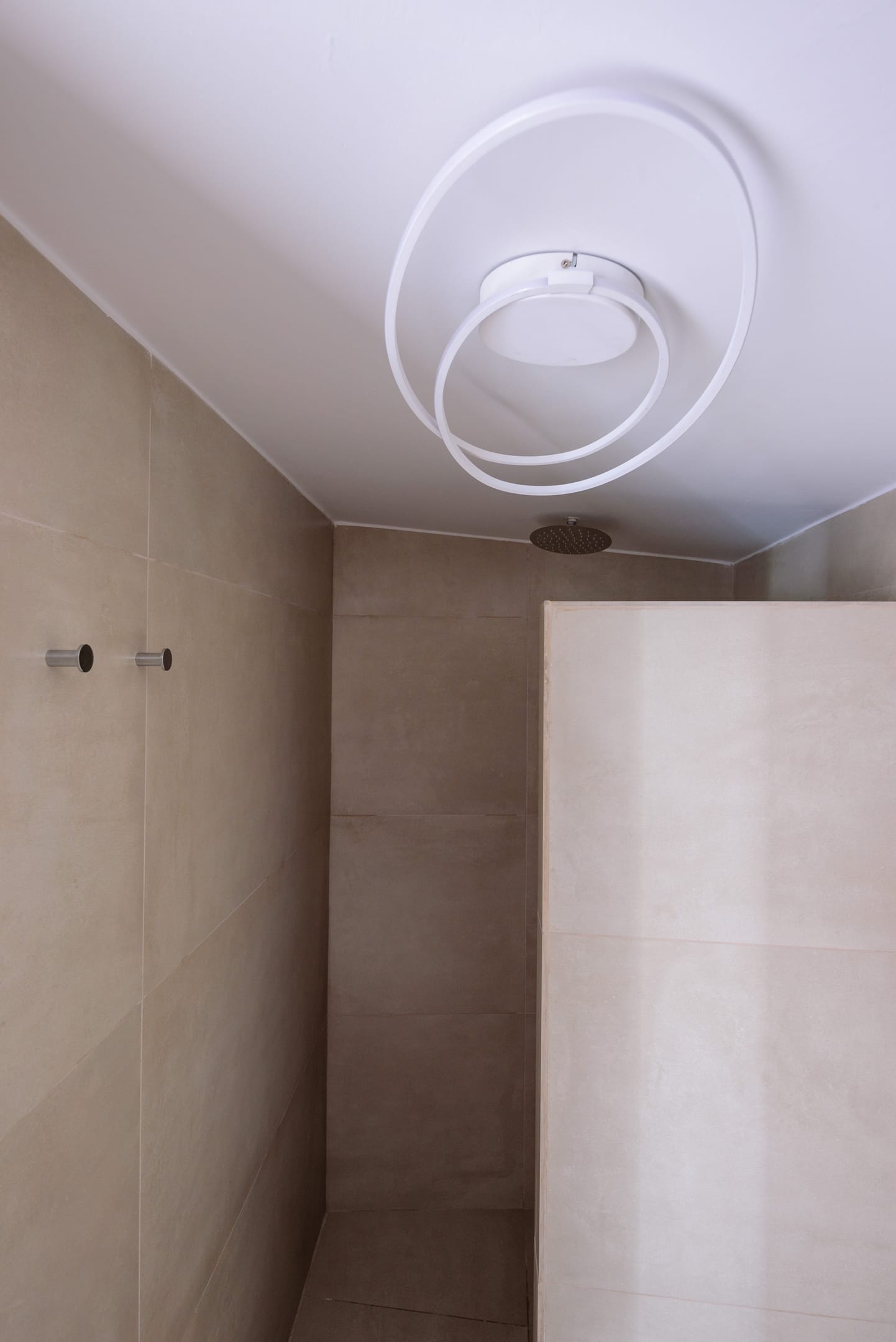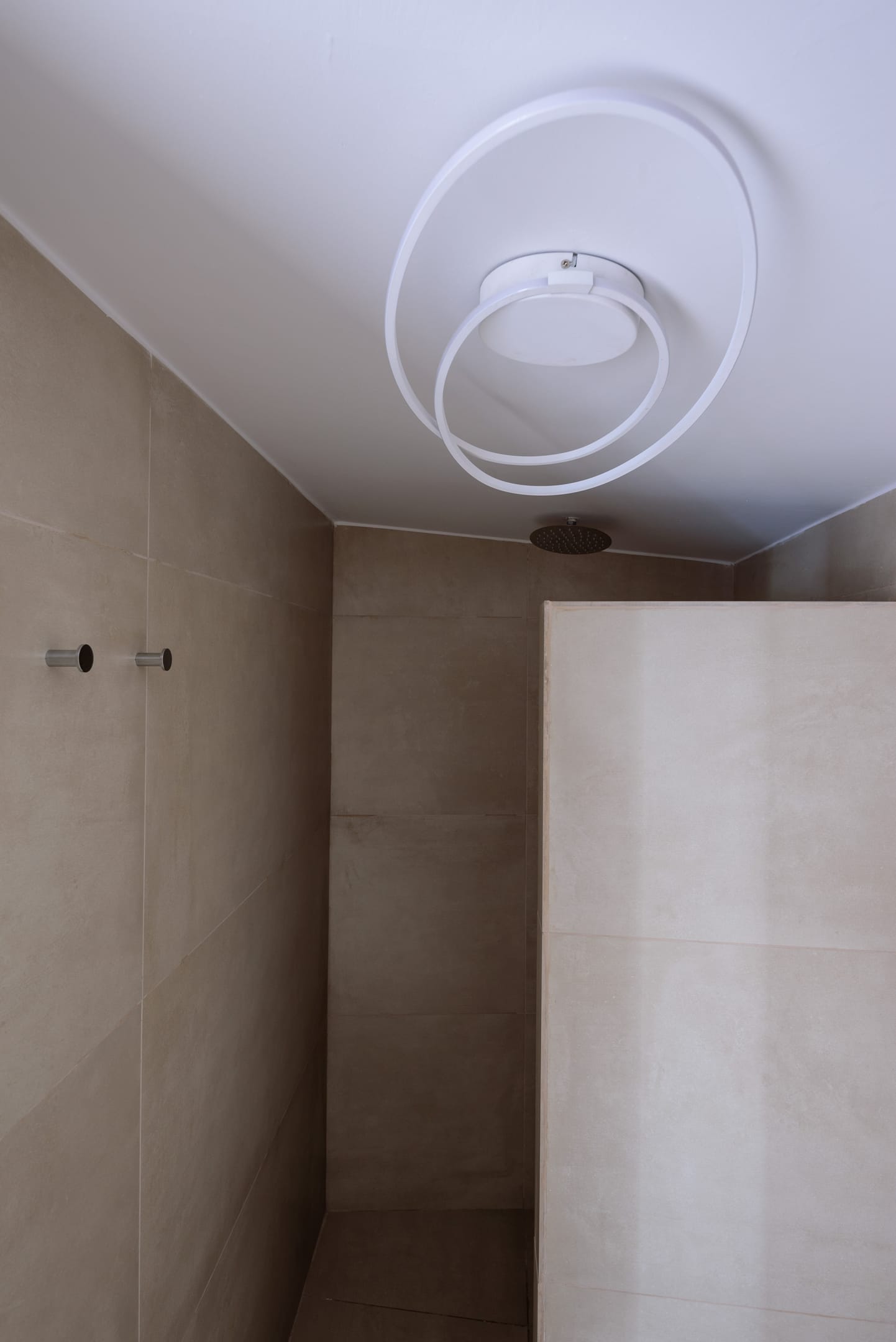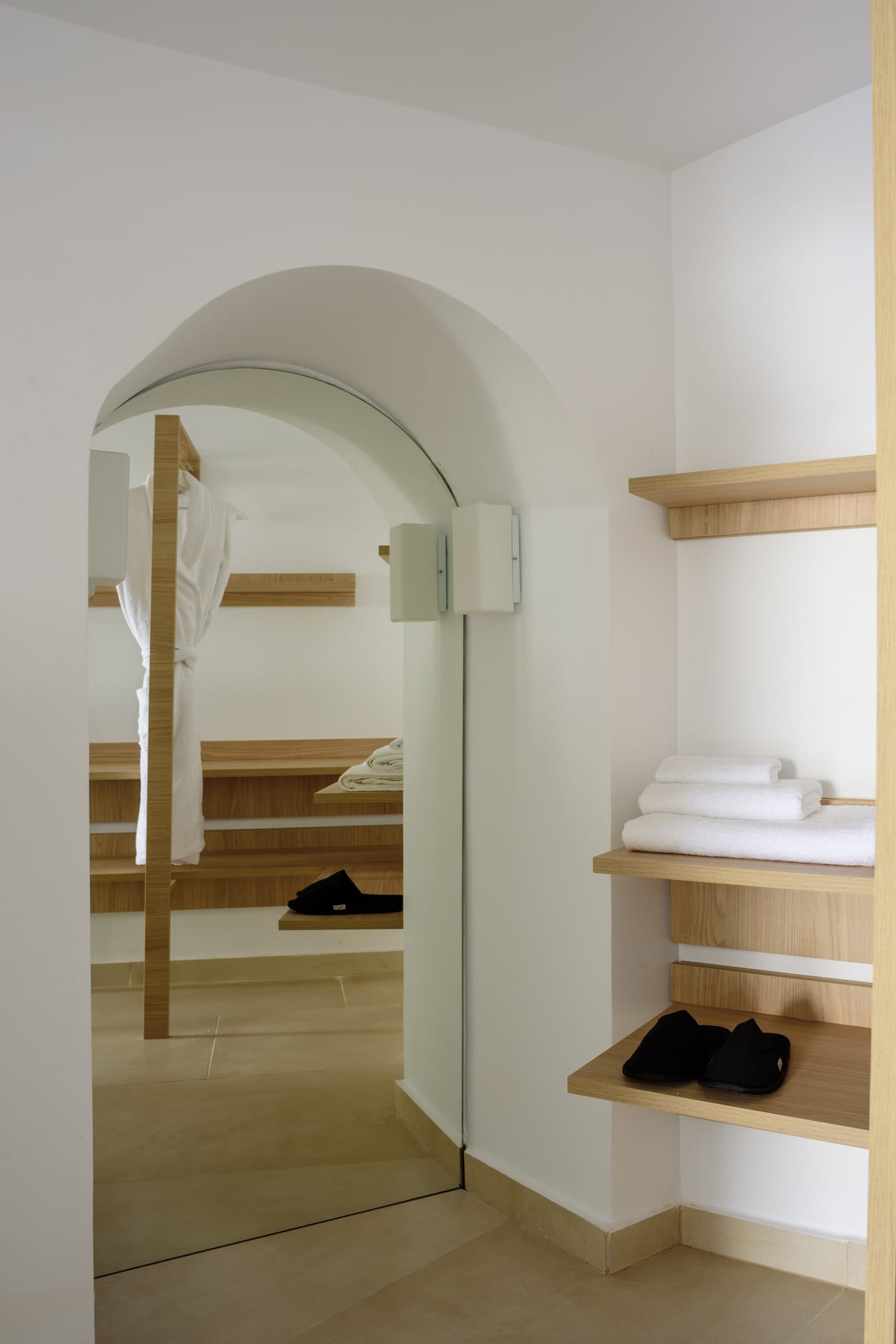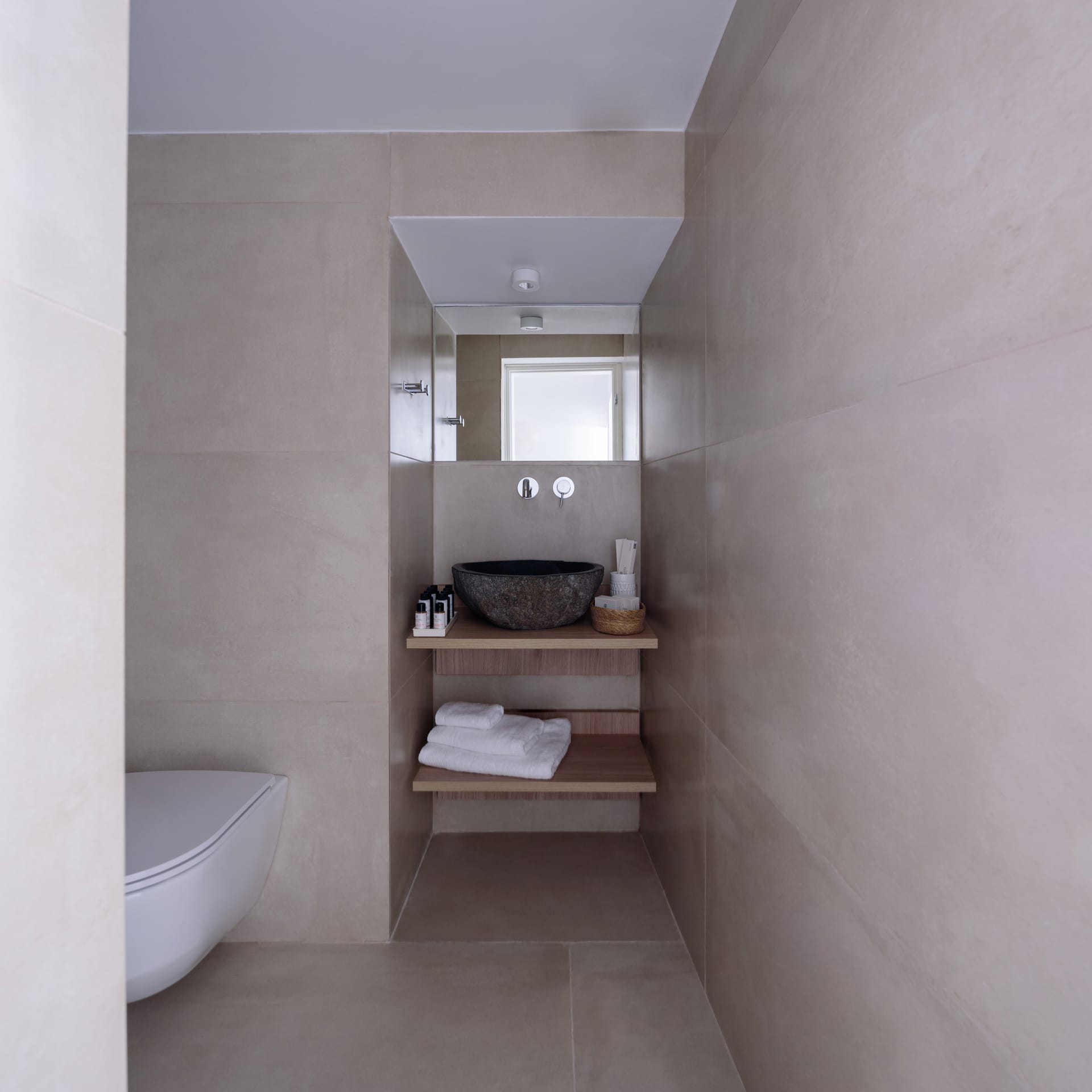 The deluxe suite can accommodate up to 2 guests, with a queen bed, shower and bathtub with a view to Caldera.
