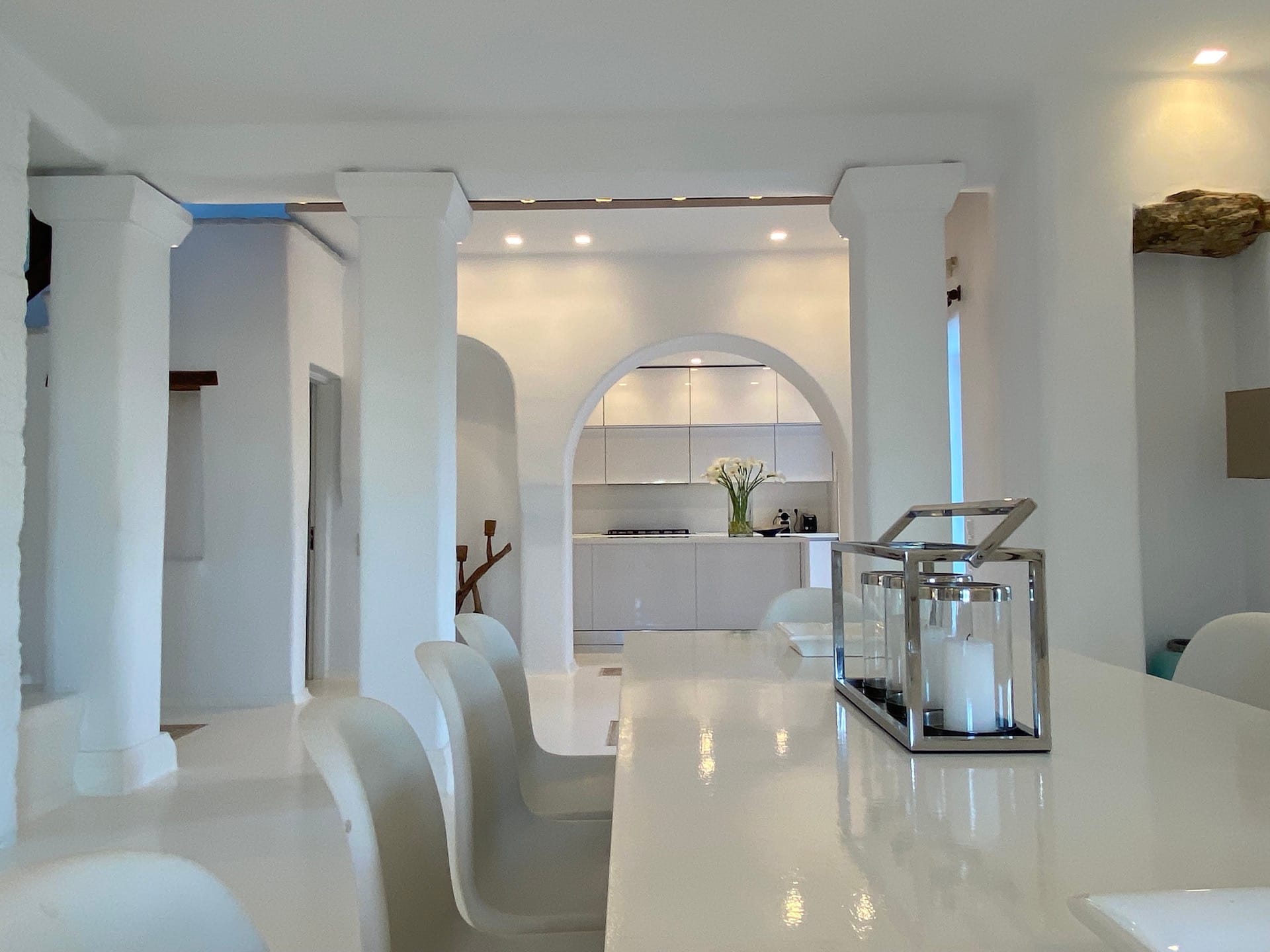 Villa Adele is a three-bedroom, two-bathroom home in Mykonos. With its whitewashed walls, beautiful beamed ceilings and pared-back furnishings, this home’s open-plan living area has a relaxed feel. The master bedroom – a white-on-white room with a simple king-size bed and long windows – shares the same laidback air. The third bedroom can only be accessed from the exterior of the home.