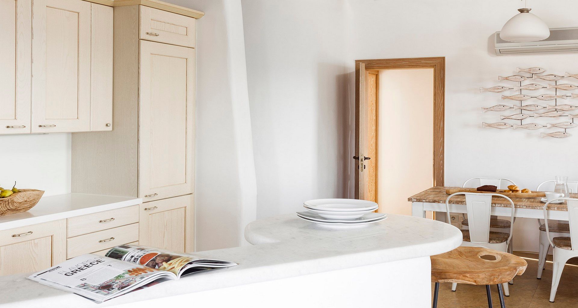 Villa Angelica is a three-bedroom, two-bathroom home in Mykonos. Decorated in soft greys and whites, this home’s open-plan living area has a contemporary kitchen, with a dining table, a breakfast bar and an elegant, pared-back sitting room. This home is spread over two floors with no internal elevator.