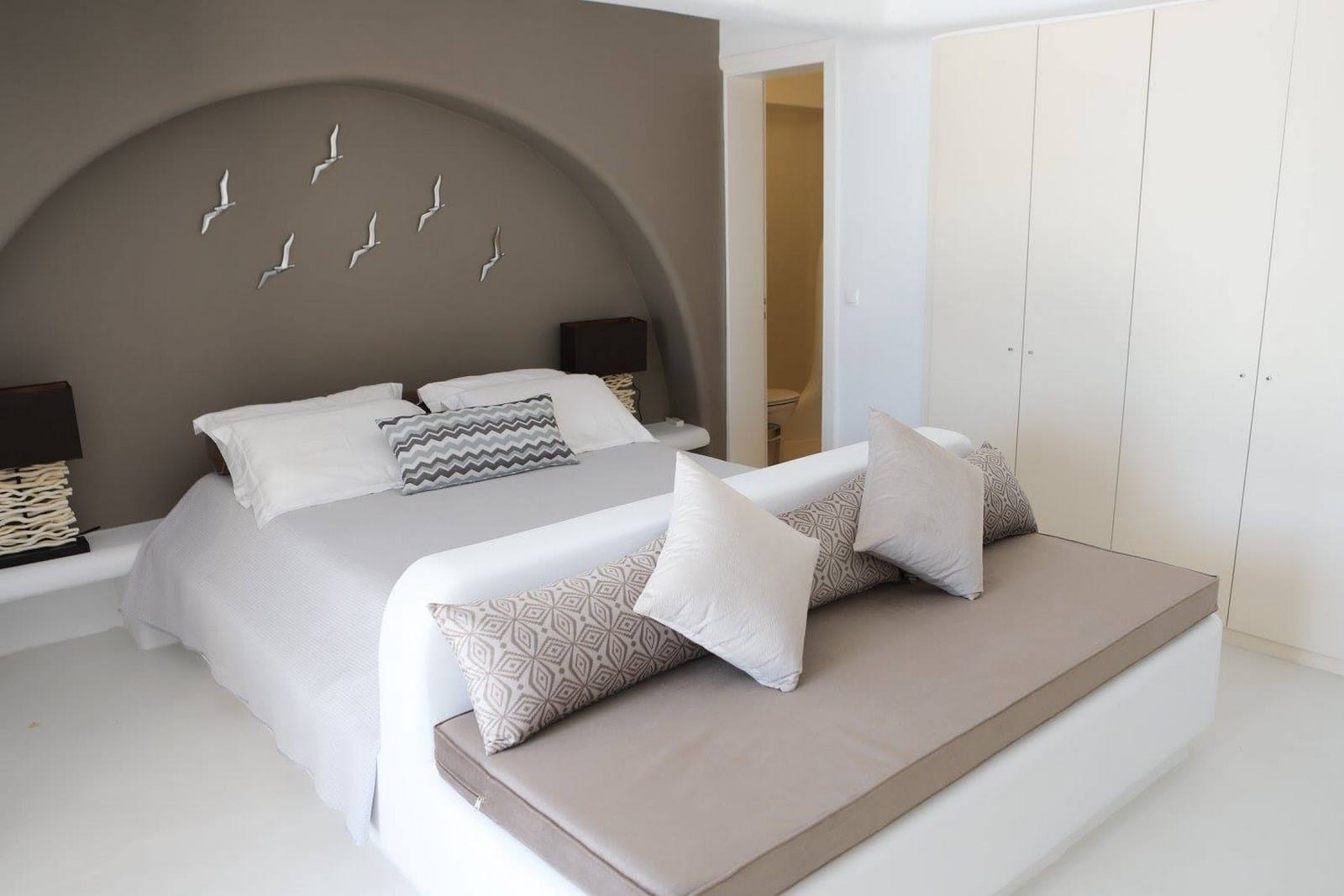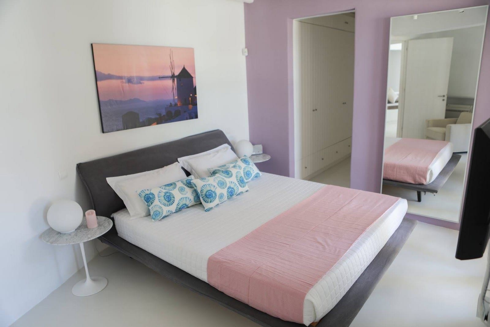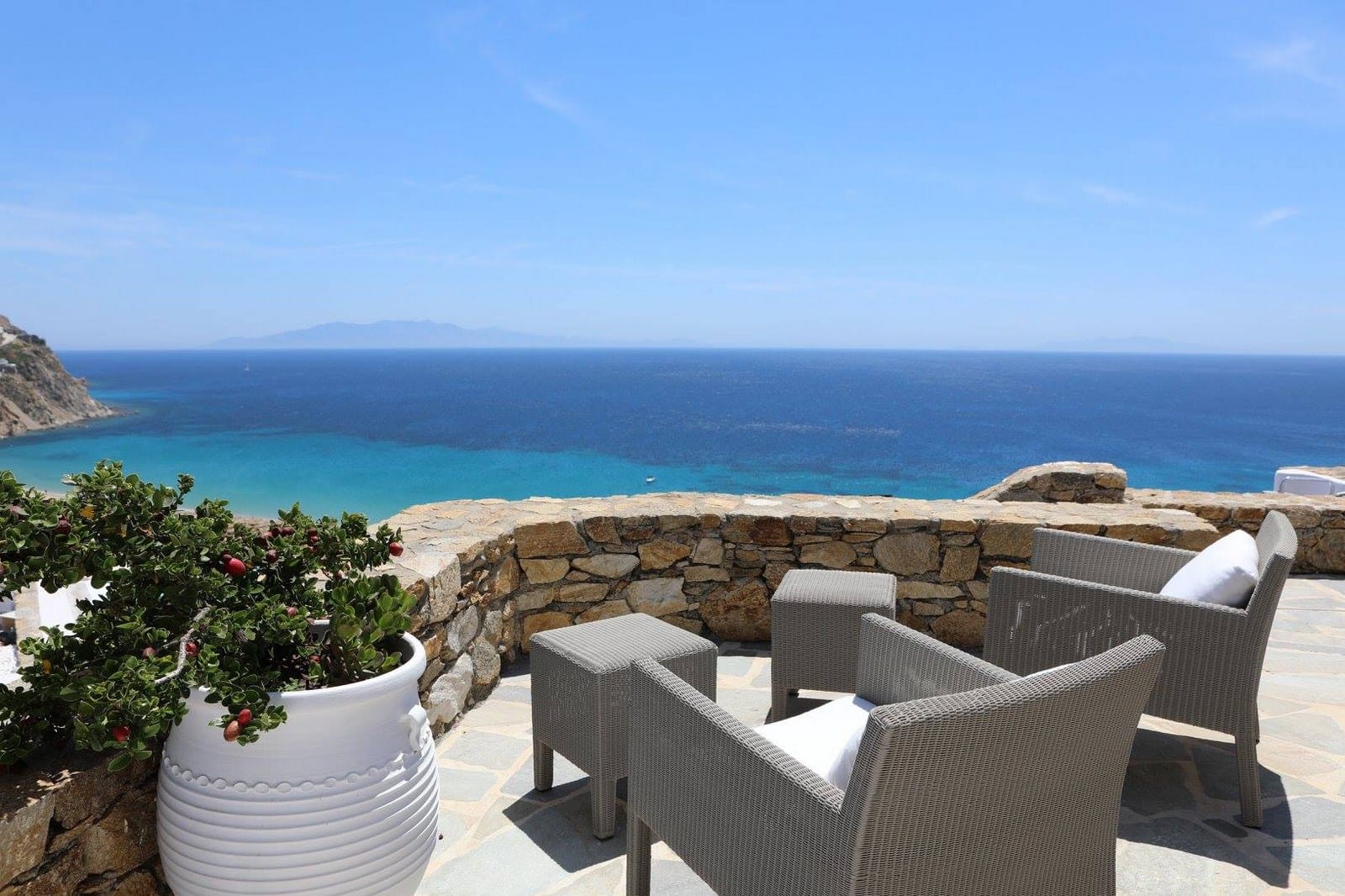 Outside you will discover the large aqua infinity pool overlooking the splendor of the sea. Beautiful pergolas afford protection from the sun and the balmy, Mykonian wind, with a table for 12, expansive lounging and barbecue area.