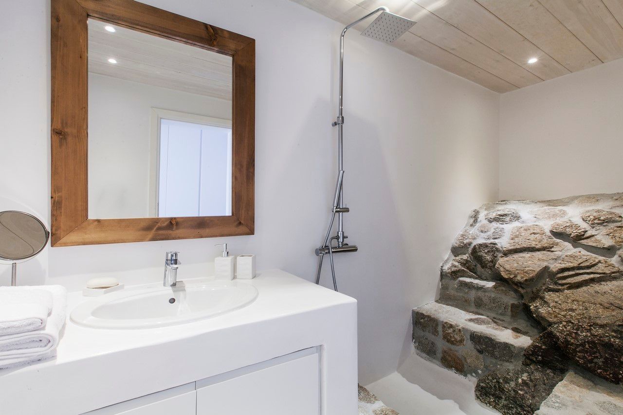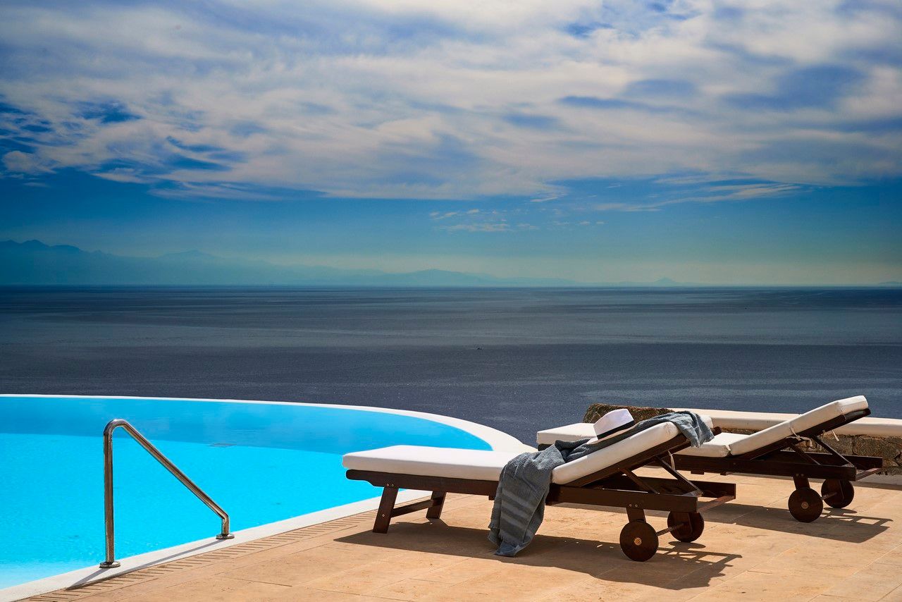 The interiors are the epitome of discreet luxury. White-washed, lavishly decorated, enriched with numerous authentic paintings, they skillfully mix contemporary design with art and connect the three levels in one and only atmosphere. The pool level contains the living and dining areas together with a fully-equipped modern kitchen, directly accessed to the outdoors. From white to creamy, soft beige and pale gray, the color palette emphasizes the natural light that deluges generously inside. The seven bedrooms, all with en-suite bathrooms, benefit from the slope of the cliff edge and provide magnificent view of the sea, even when somebody is lying in any one of the beds. Especially when stepping into the oversize master suite with the large windows and the private panoramic balcony, you will feel like flying over the Aegean sea.