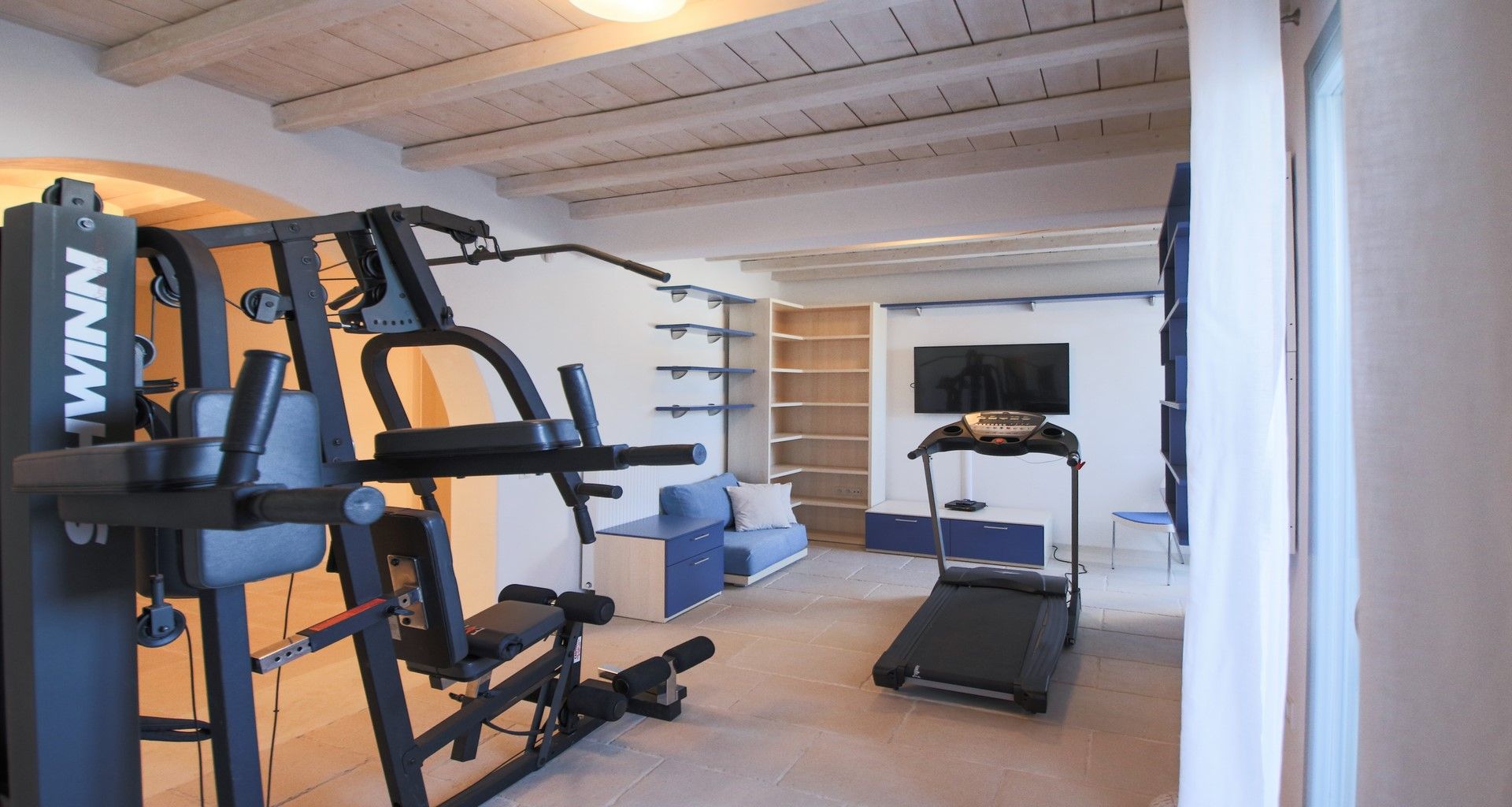 - Gym with TV, air condition, Wi-Fi system, refrigerator, equipped with treadmill and a multi-function machine for full body workout for strength and fitness, easy outdoor access via balcony doors