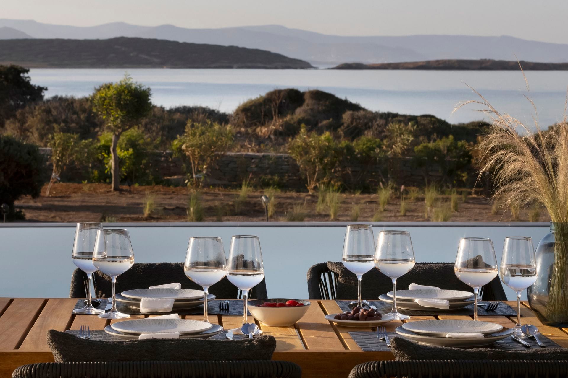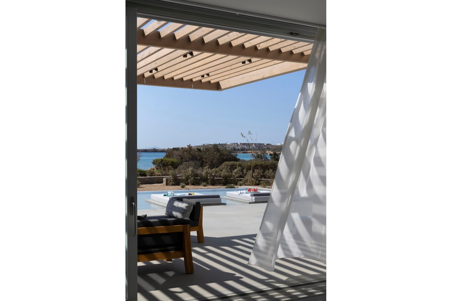 Ornos beach is only a five-minute drive from the villa…lovely! Lovelier so is the fact that after a fun-filled day out exploring the island, one can take an evening dip in the pool and rest on the inviting plush sun-beds. Villa Claire offers beautiful exterior landscaping complete with breathtaking pool resting at the crest of the Villa’s grounds, unobstructed sea views, shaded dining area as well as wooden deck with lounge areas. Yours to spoil your senses!
