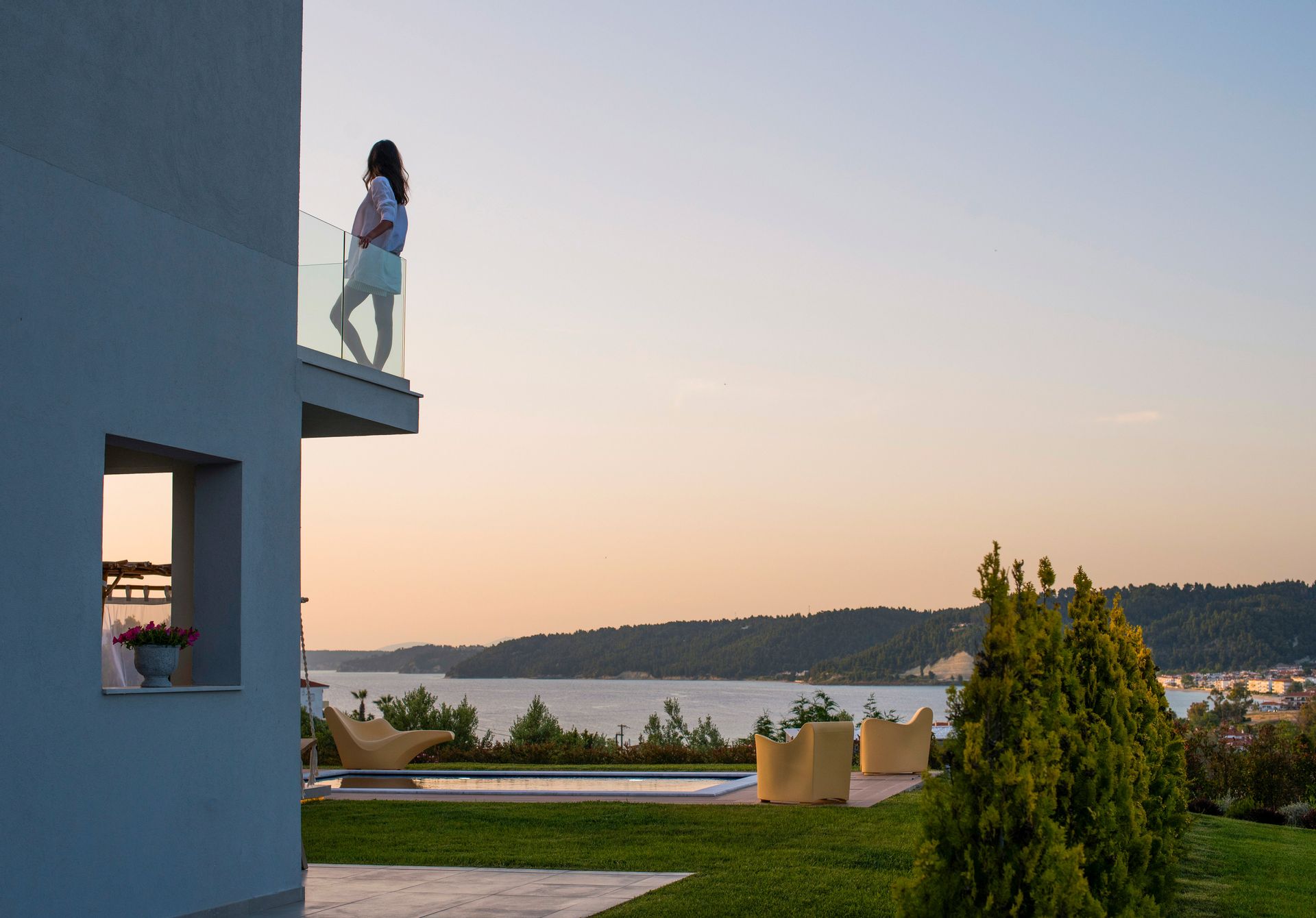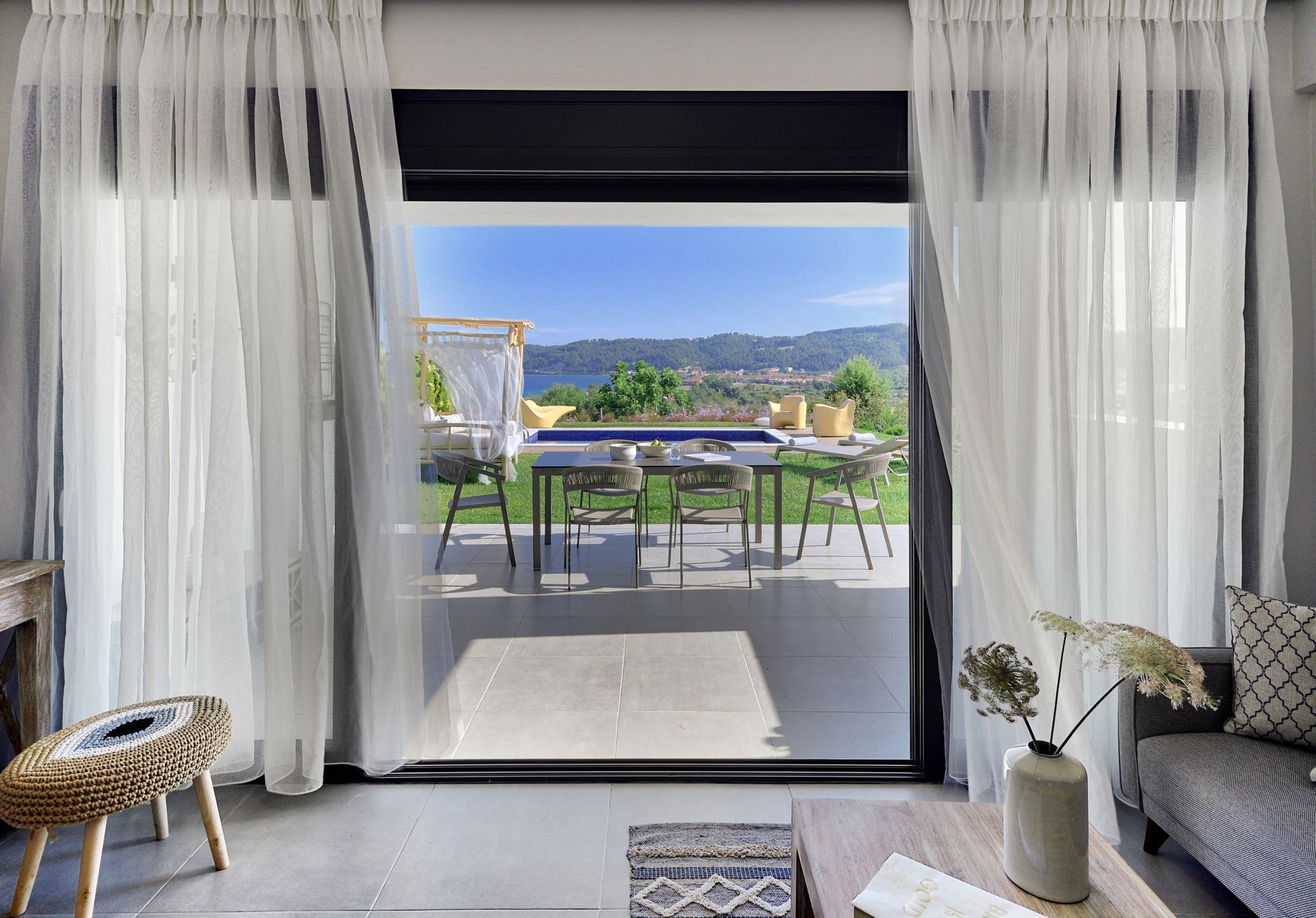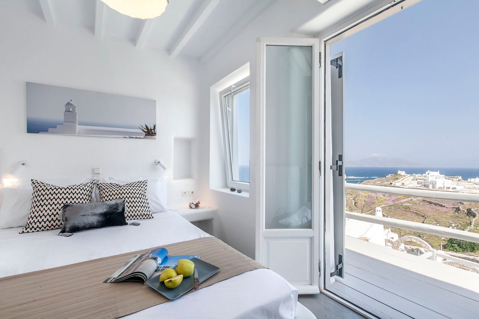 The flexible sleeping arrangements make it a breeze for parents with children, couples or friends. The purity of the white walls inside and out lends the structure a dream-like, ethereal feeling with modern yet minimalist furniture and finishes throughout. Arches and double-pane windows and patio doors grace the villa and let welcome sunshine in, while enjoying a warm awakening.