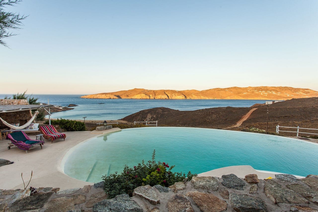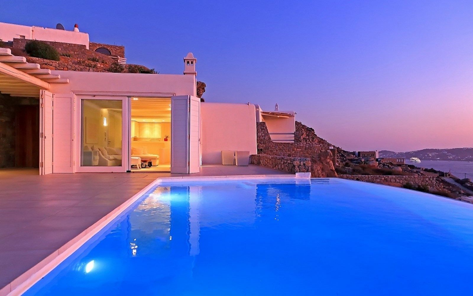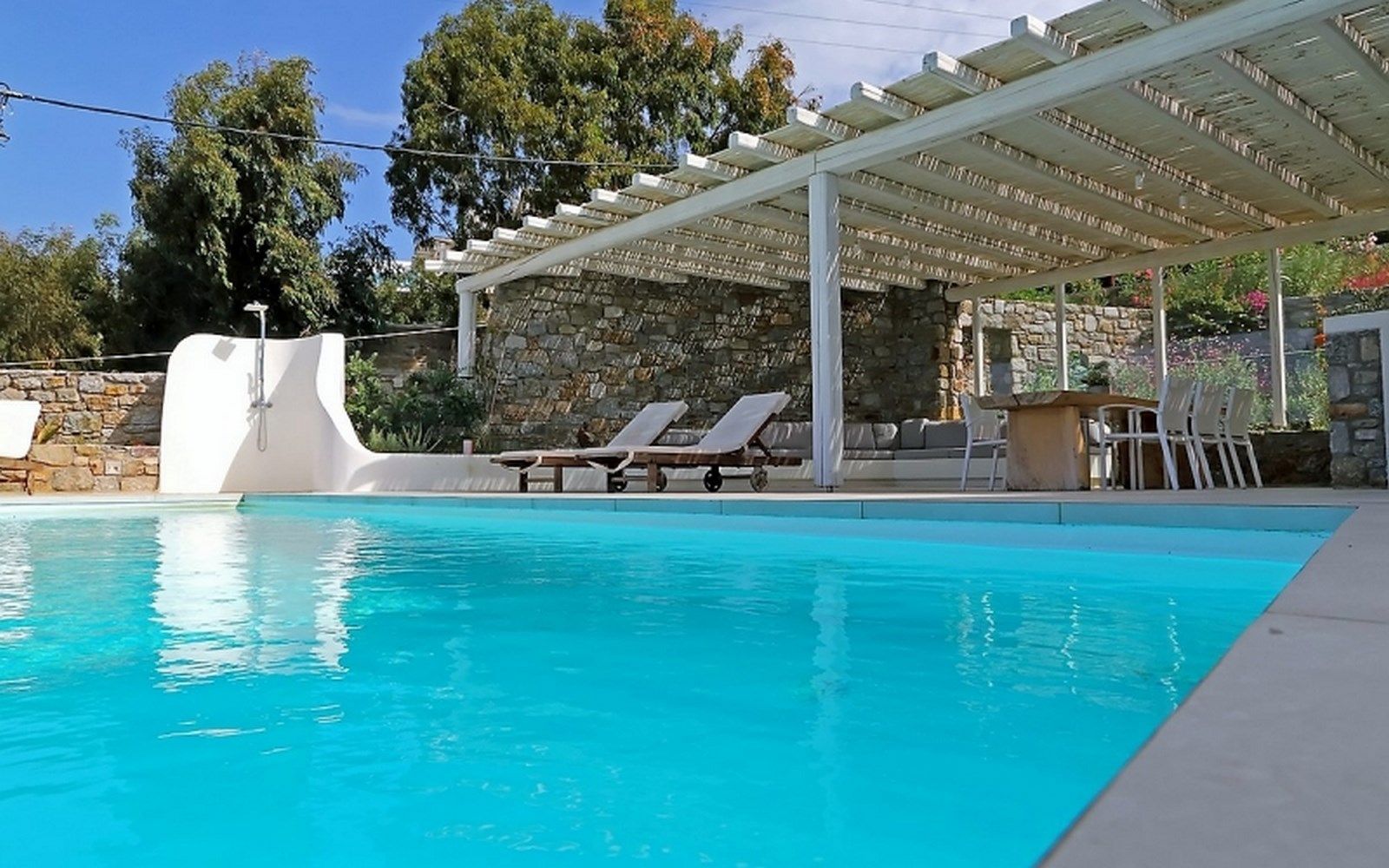 The villa is ideally located on a unique plot of 4,193 sqm, on a hill that oversees the famous golden beach of Kalo Livadi with a breathtaking view to the sea. The 645 m2 complex consists of 3 independent buildings and 2 swimming pools, with 7 bedrooms (accommodates 14 guests). The complex provides all the amenities that anyone could enjoy: Playroom, wine cellar, large external areas with pools, sheltered lounge, outdoor dining areas with pergolas and most of all an astonishing view.