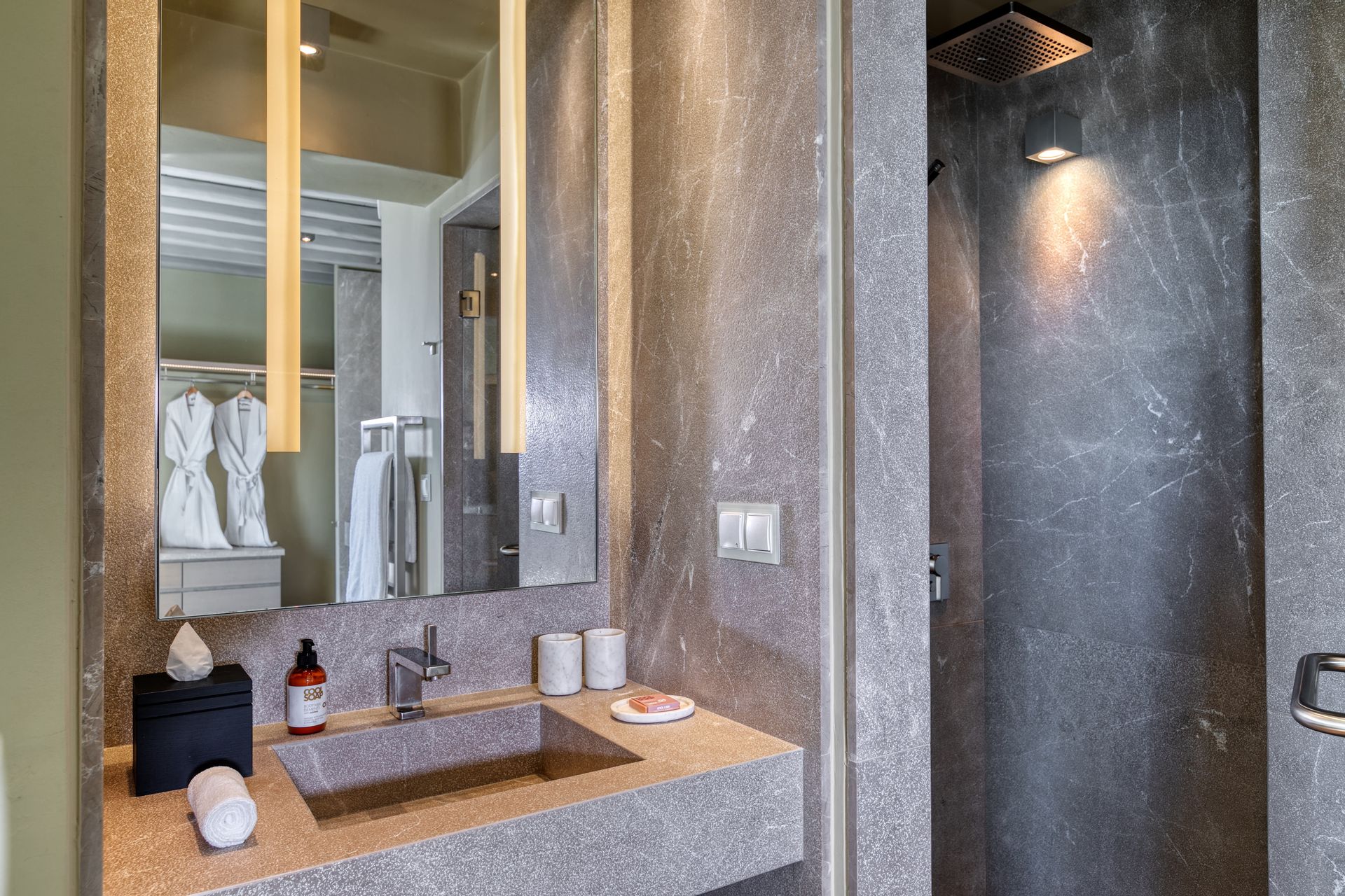 The Villa is split in two levels. The Pool level where the shared pool is, along with two outdoor dining areas and barbeque. As you enter inside the villa, you can find a beautiful spacious living room where you can enjoy unforgettable relaxation moments. Next to the living area is the dining table where comfortably sits 6 people. In this level there is also a fully equipped kitchen with all modern appliances as well as a guest WC.