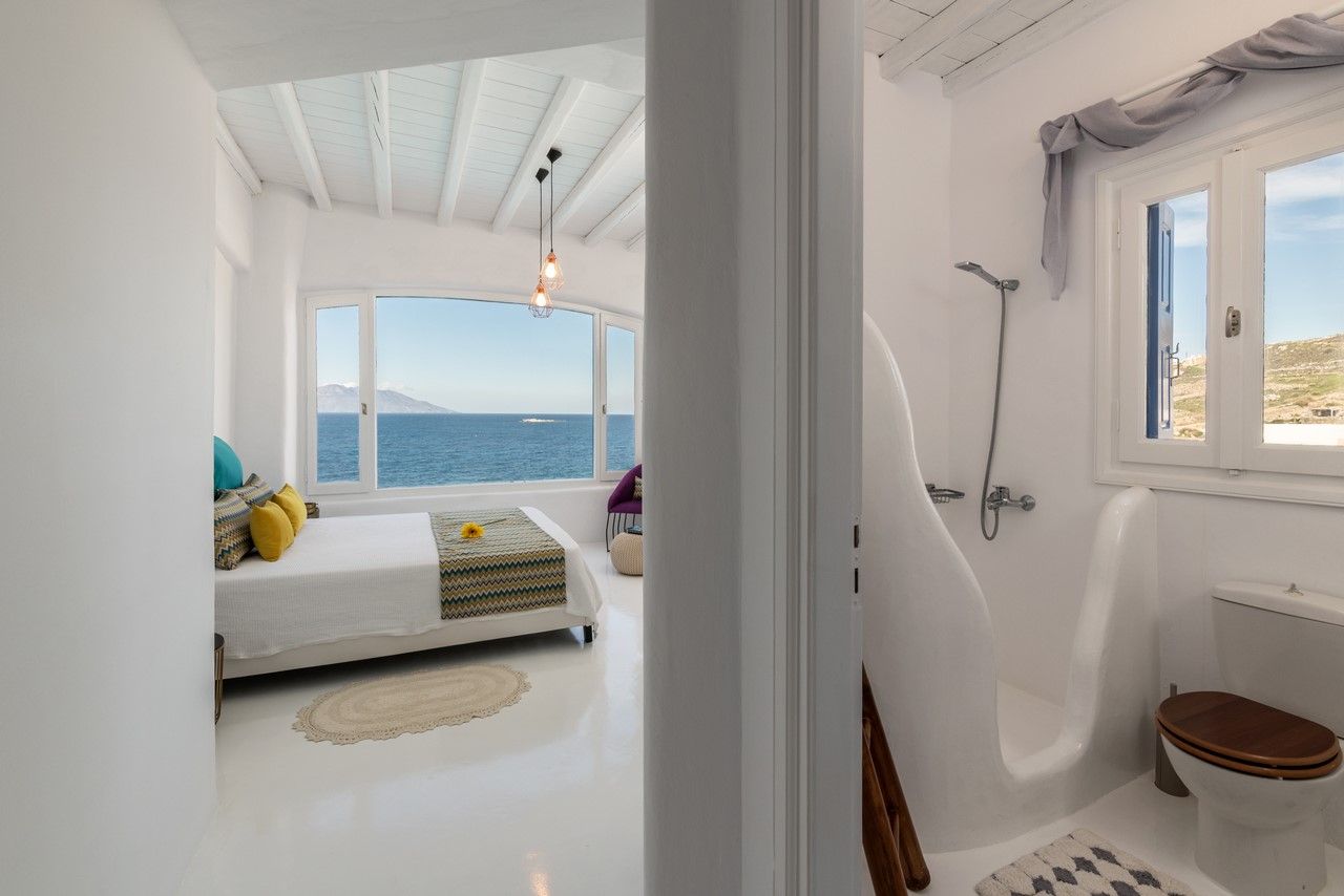 - Master bedroom with en-suite bathroom. There is a private balcony overlooking the pool, the sea and Mykonos Town
