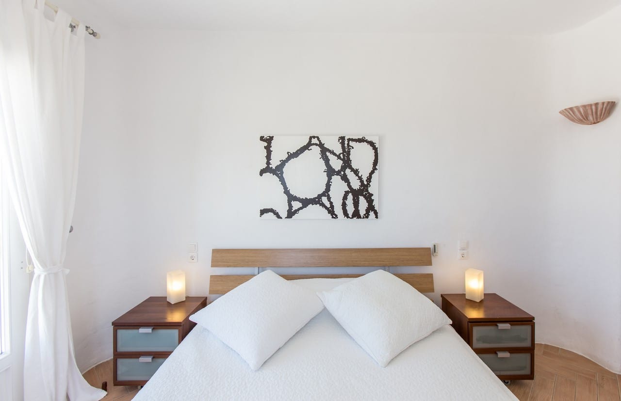 The first one, Villa Hannah has its own infinity pool with a built-in spa and amazing view in the Aegean Sea. The Villa has separate entrance and private outdoor area with a big dining table, a barbeque, a big bar and a state of the art sound system. Just a few steps away from the pool and the kitchen, in the area of the stone-built dining room, which is surrounded by huge rocks, you can enjoy wonderful meals, quick and refreshing snacks all day long and relax with your friends chatting or having a drink at night.
