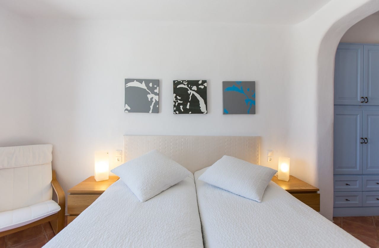 The internal of Villa Hannah is ergonomically designed with modern style and decoration. On the upper level there is a fully equipped kitchen along with the main dining room and living room which has view to the infinity blue. One level down you can find the five bedrooms of the villa. Each one of them has two twin beds or a double bed, en-suite bathroom and direct access to the terrace.