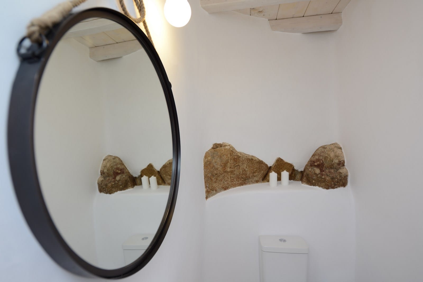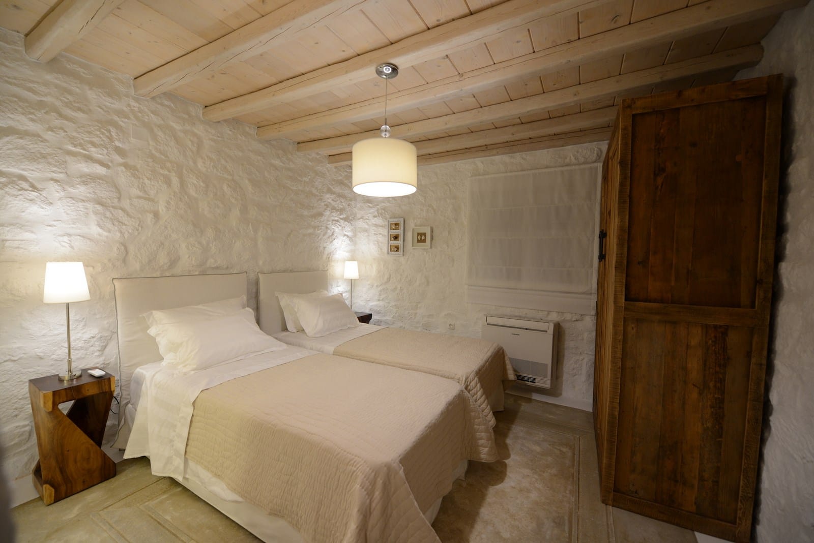 While the villa embraces the traditional materials of stone and white stucco, its open layout and contemporary interiors creates a modern and elegant concept of indoor-outdoor living. The villa occupies a total area of approximately 200 sq.m on three levels, comprising of a spacious living room with a fireplace, dining room, fully equipped kitchen, 3 master bedrooms inside the main villa, 1 WC for quests and 1 exterior double guest studio.