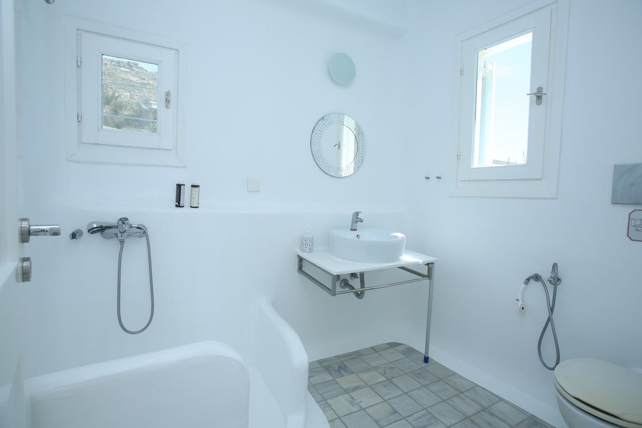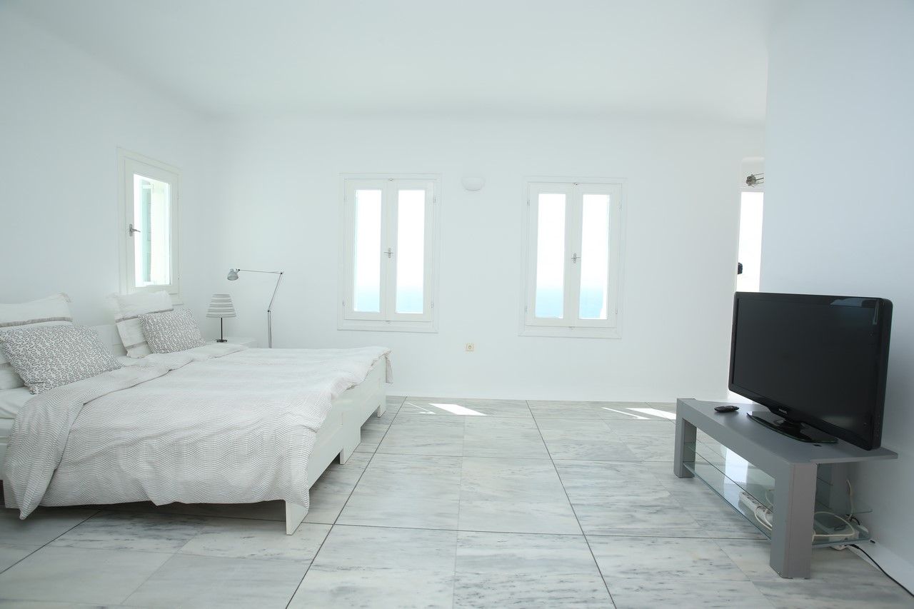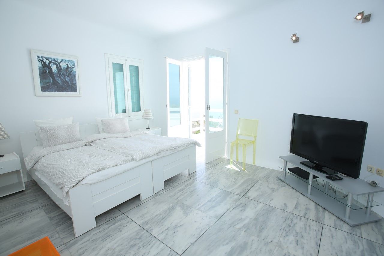The villa’s interior areas are characterized by the white of Cycladic Islands, with a minimalistic style combined with modern fittings. There is a fully equipped with modern appliances kitchen, with direct access to the side terrace and the spacious dinning-living room area. Guests have also direct access to the front terrace with amazing sea and pool view.