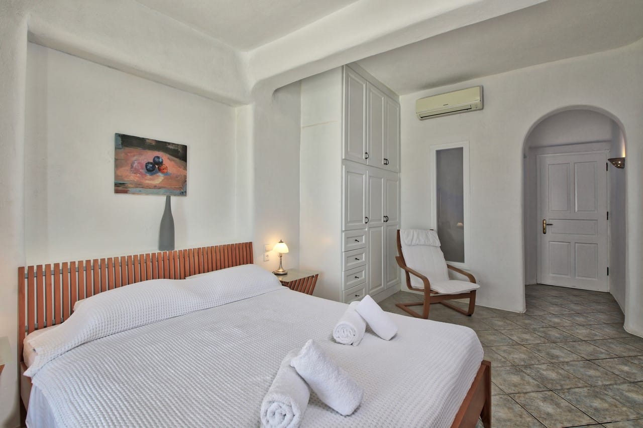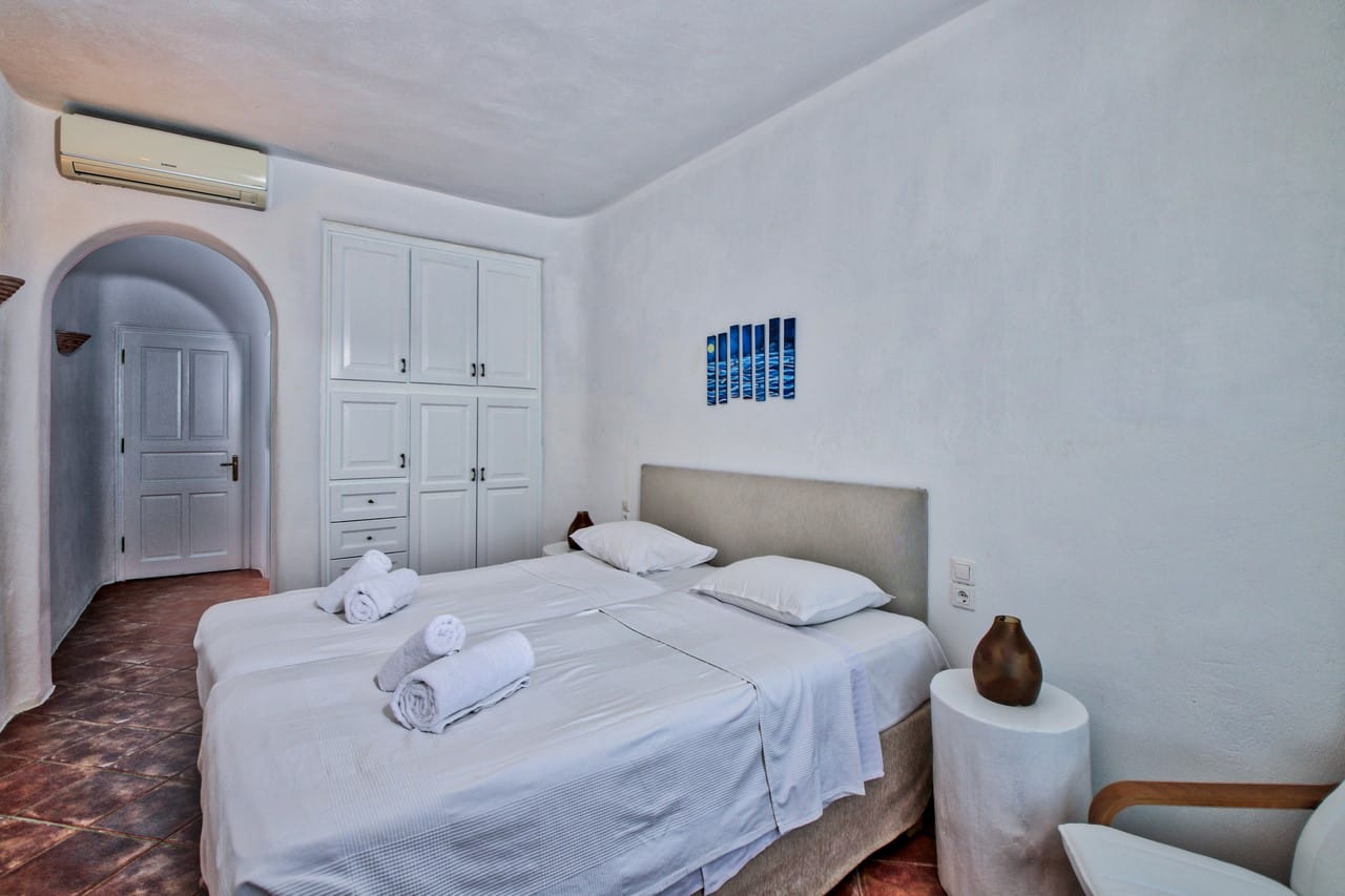 The private pool by the villa and the teak furnished pergola, dominate in the space. The barbeque, the mini bar with the sound system and the stone-built lounge create the ideal space for the guests to relish and relax. The villa in its interior is specially designed in order to keep separated the bedrooms from the other parts of the property. Hence, the level of the entrance consists of an ergonomically designed kitchen, along with a spacious living room. The whole decoration and furnishing is a combination of minimal and traditional Cycladic style with the excessive presence of stone. All three bedrooms with en-suite bathrooms are arranged on the lower level with access to the terrace through the staircase that leads to the pool. Each bedroom is equipped with all the modern amenities, including air-conditioning and TV set.