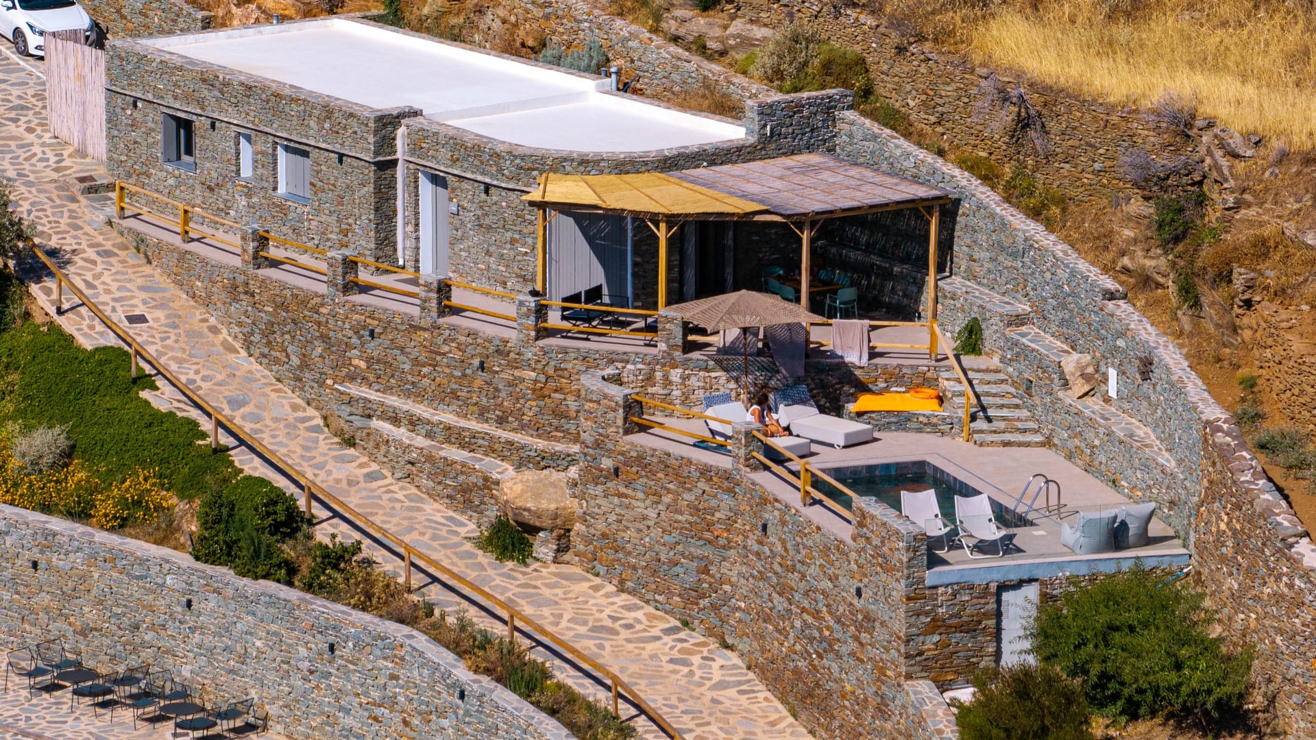 These two-stories Cycladic design villas will accommodate 20 guests comfortably. Welcome to Villa Maggie located in Kalafatis Mykonos.