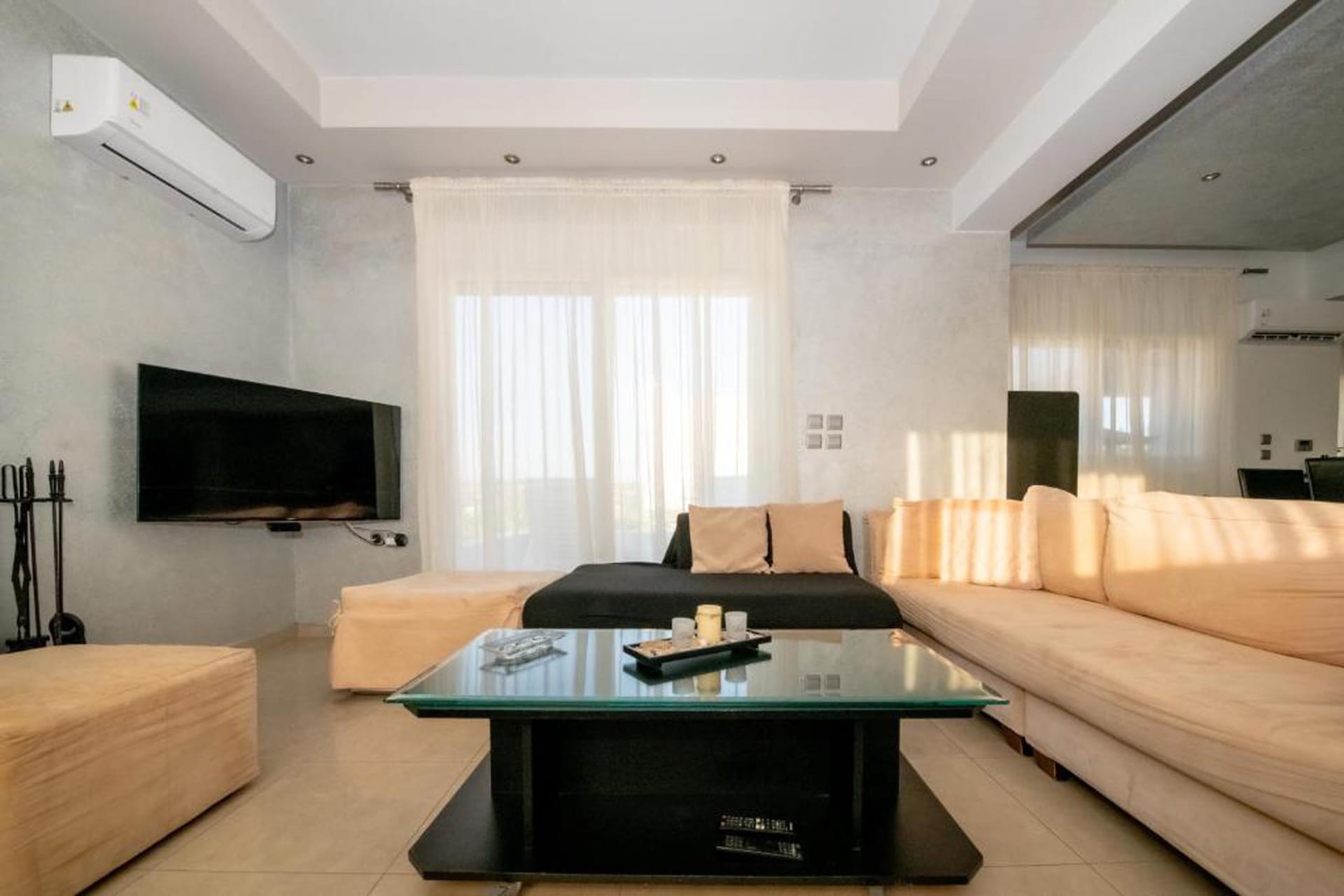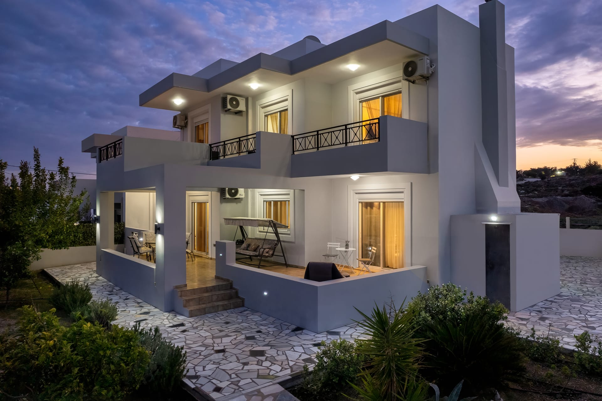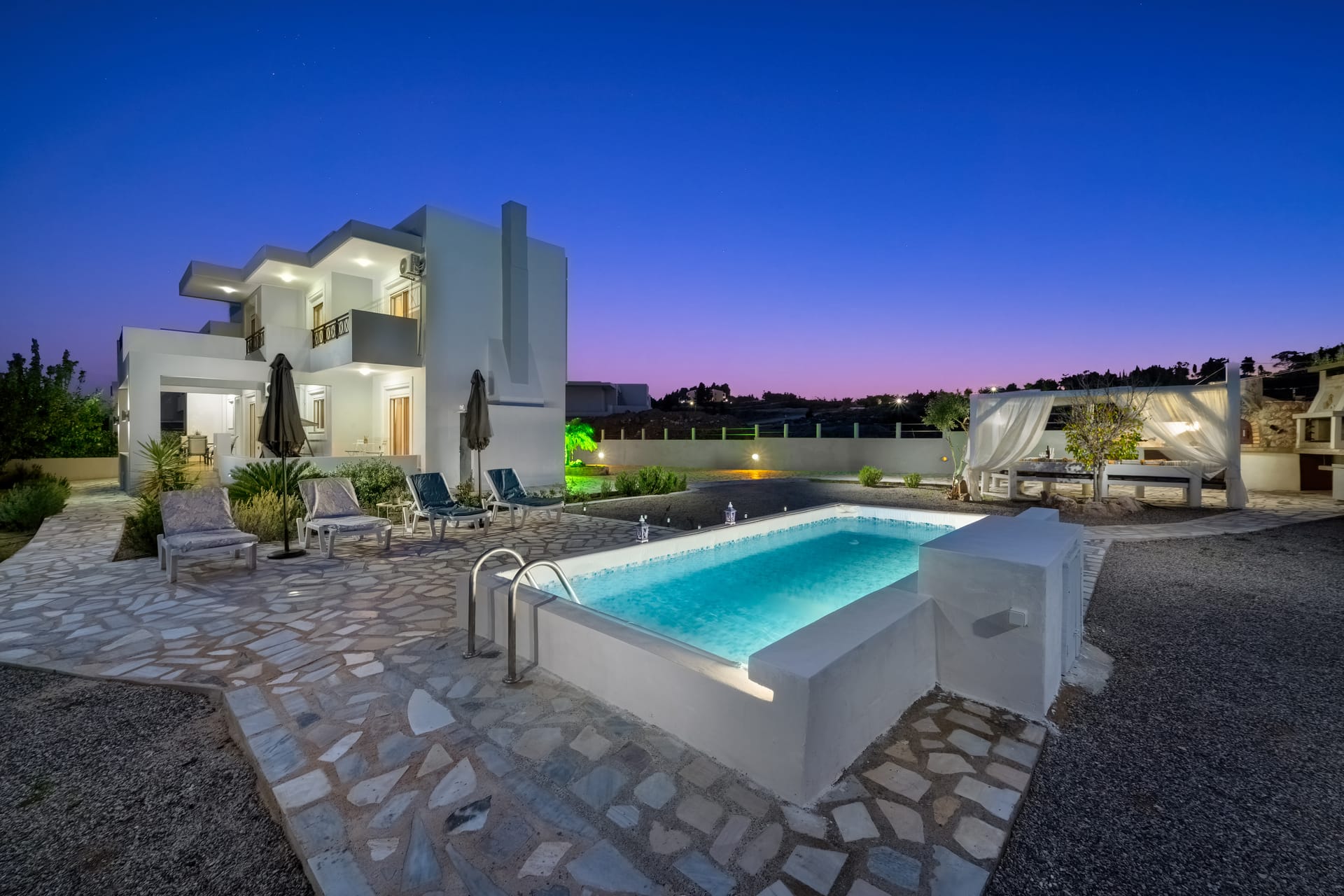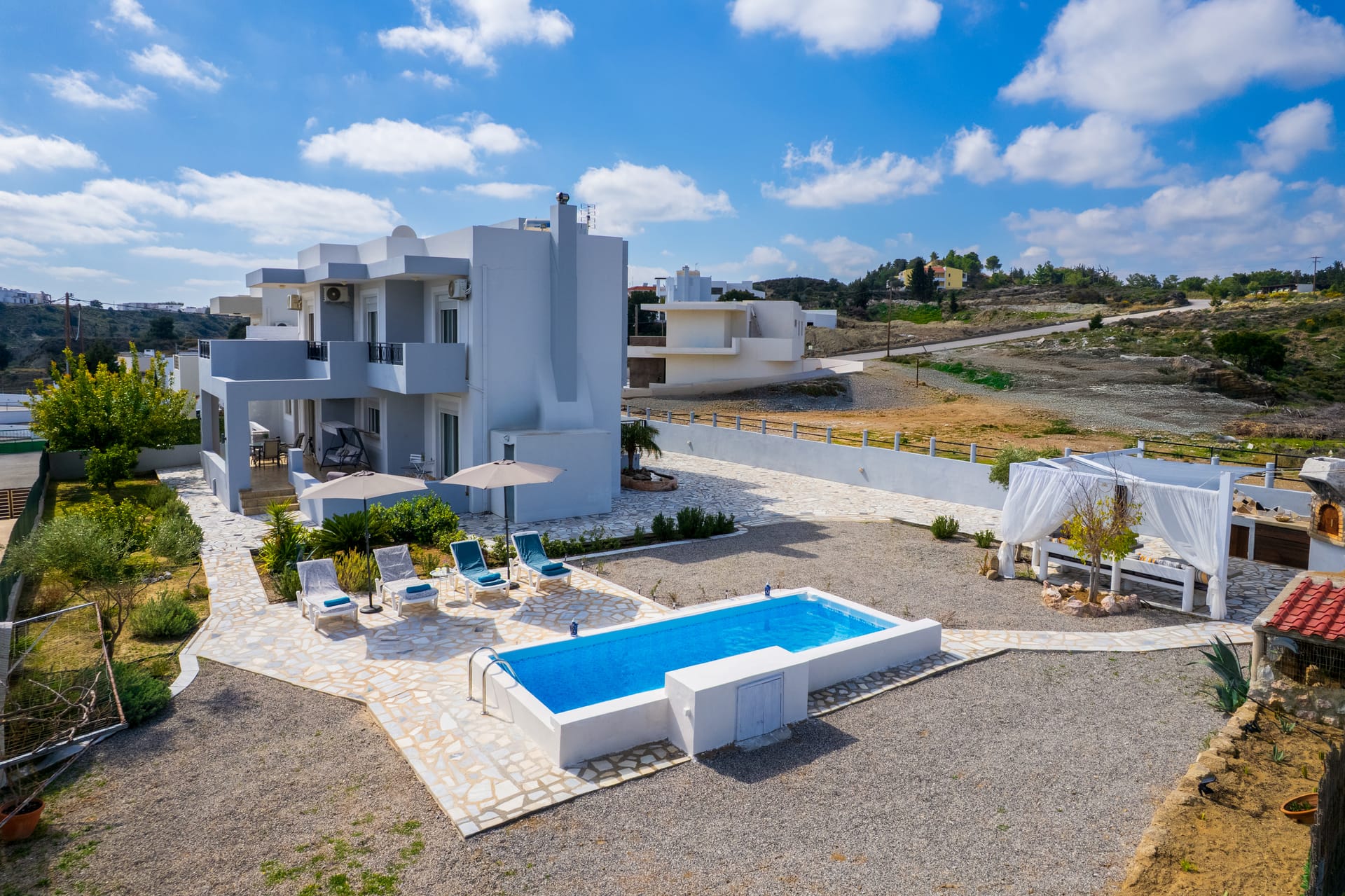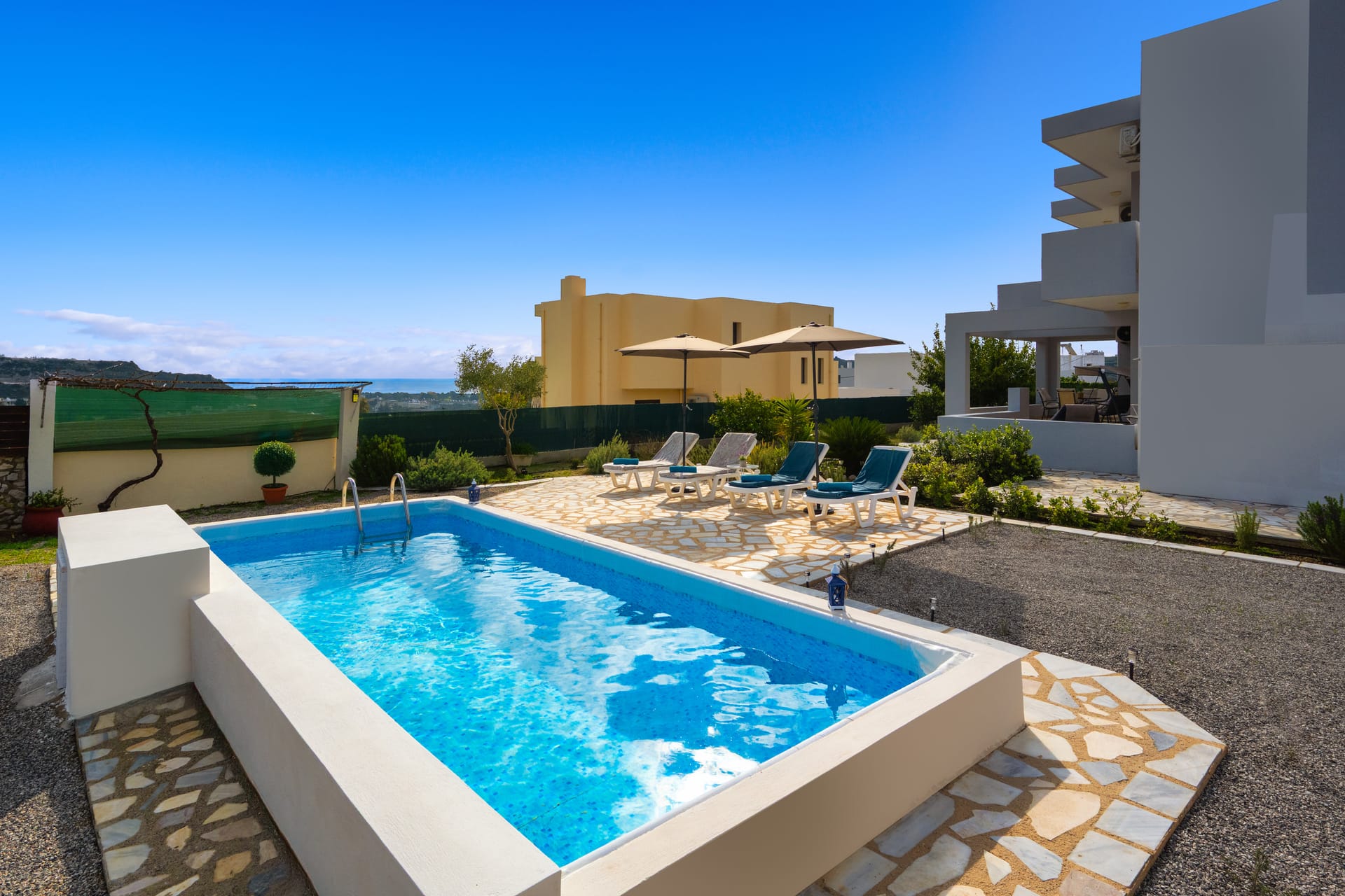 The villa is modernly furnished and has a large swimming pool. There are 4 bedrooms in total, 3 in the first floor and one in the ground floor with its own entrance by the pool. All bedrooms have en-suite bathrooms, digital HDTV, silent refrigerators with glass doors (mini-bars), high quality safes both well hidden inside the closets and air-conditioning. The villa has wi-fi internet support. There are plenty of open spaces and verandas with pergolas and at the pool side there are umbrellas and deck-chairs. The villa has also 2 parking spaces.