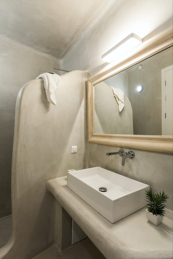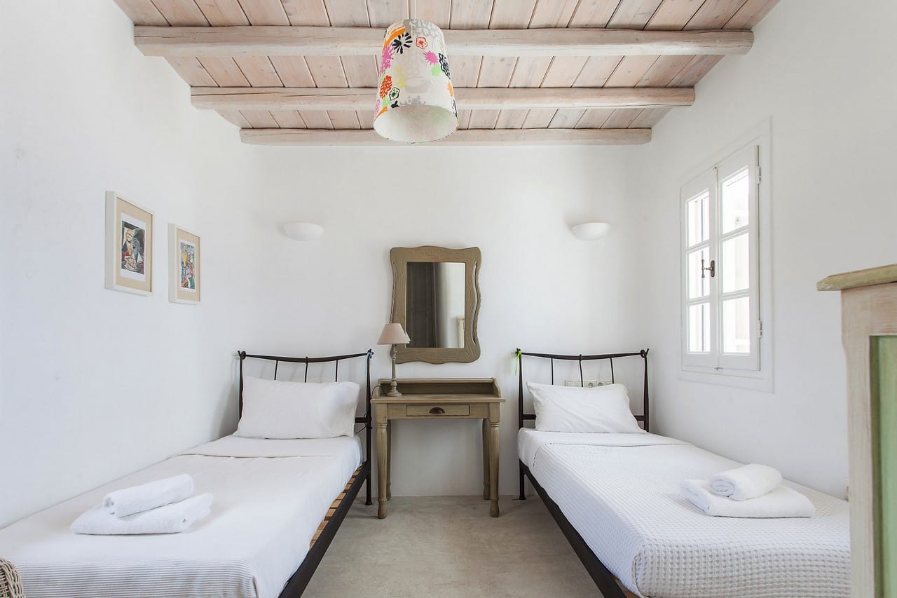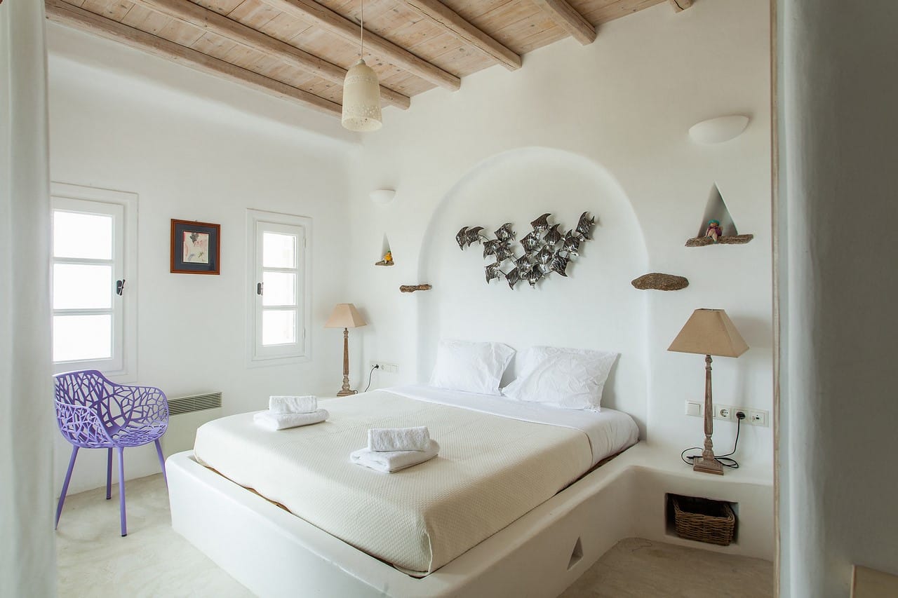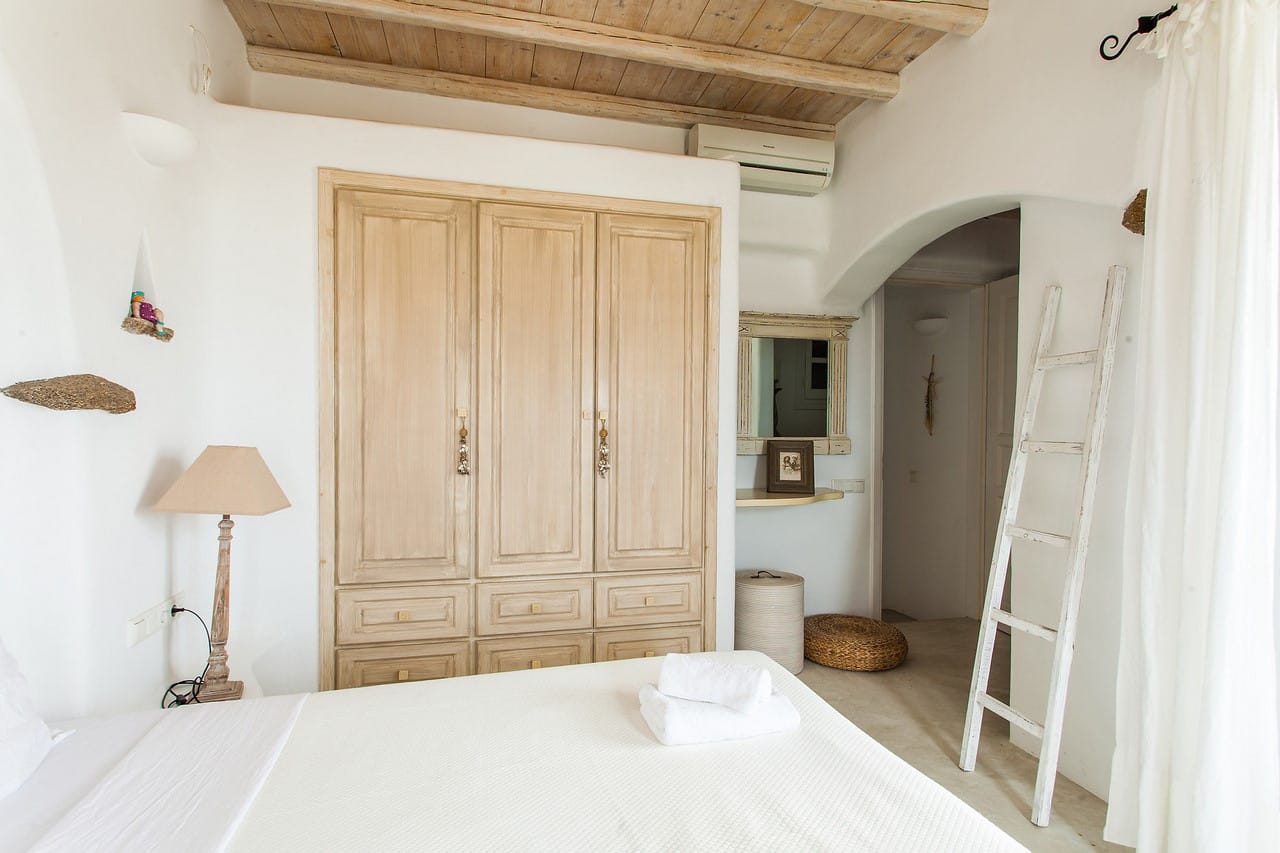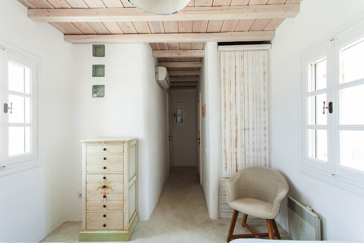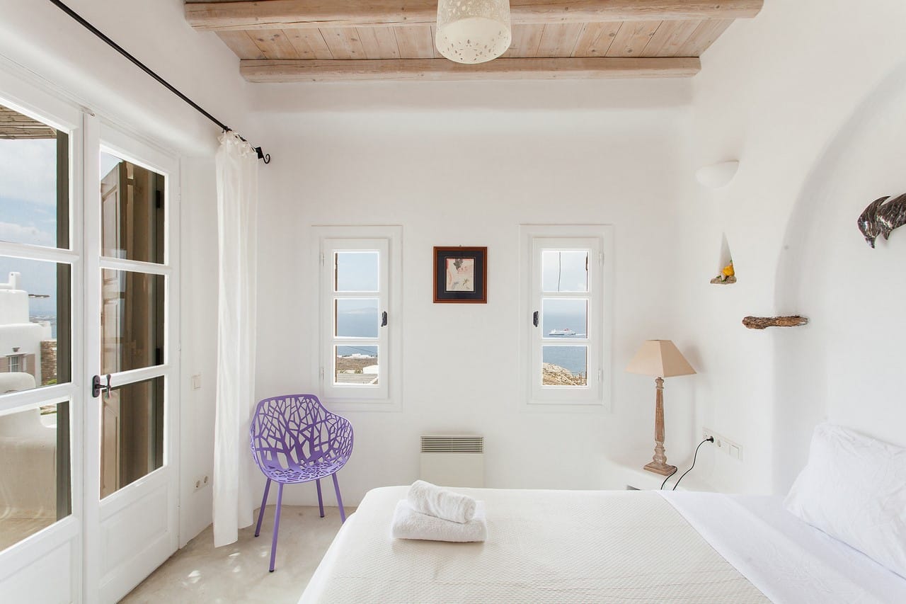 Tasteful furnishings and fabrics dress the villa in a simple yet elegant décor, rendering it relaxing on the eyes and the senses alike. The cozy living room, with a dining table and an open-plan fully equipped kitchen, leads to a majestic shaded dining area with views to the pool and the sea. A shared swimming pool, sunbeds and shaded dining space are found in the villa’s exterior.