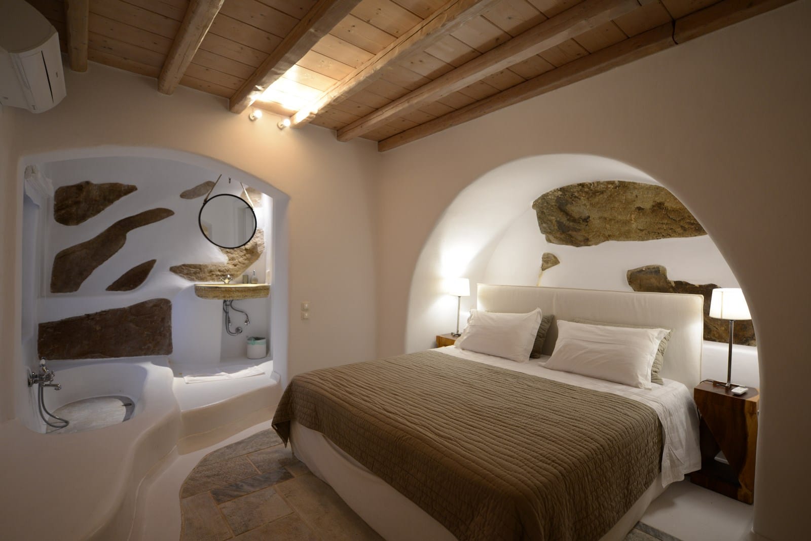 Villa Matilda has been developed through the bold rupture of old and new, by preserving the natural rock at some interior areas as a distinctive decorative element, that manages to create a unique sense of communication between the past and modern age. The spacious living room (with a fireplace) and dining room adjacent to the kitchen, is equipped with all modern appliances. The villa features full air conditioning, WIFI, flat screen tv and alarm system.