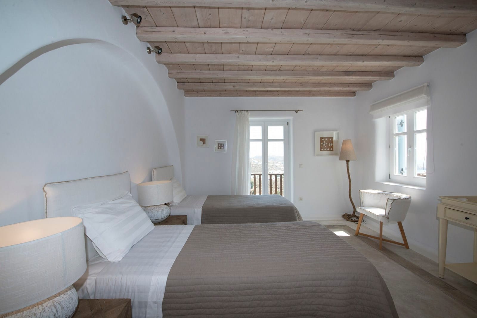 The 3-bedroom Villa Matilda is located in Agios Lazaros area of Mykonos island overlooking the renowned Psarou Bay. The Villa in Psarou is built on a plot of about 3,5 acres, in amphitheater location, close to its sister Henrietta Villa in Psarou also, occupying a total area of approximately 200 sq.m on two levels, comprising of an open space living room, dining room, fully equipped kitchen, 3 master bedrooms, 1 WC for quests and 1 exterior studio ideal for service staff or guests.