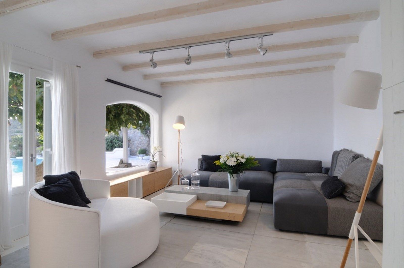 Outside, the room has its own pergola with an outdoor siting area where the magnificent sea view can also be enjoyed. The villa has wi-fi internet support. It has large verandas and at the pool side there is another out-door living area with a very large sofa covered by a pergola. The villa has 2 parking spaces. The nearest beaches are Nammos, Ai-Yiannis, Glyfadi, and Ornos beach. The distance from the town centre and airport is between 4 and 5 kilometres.