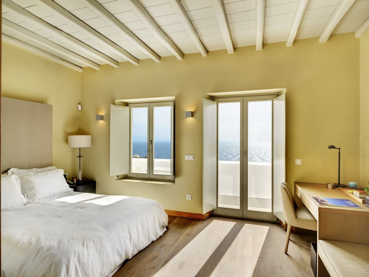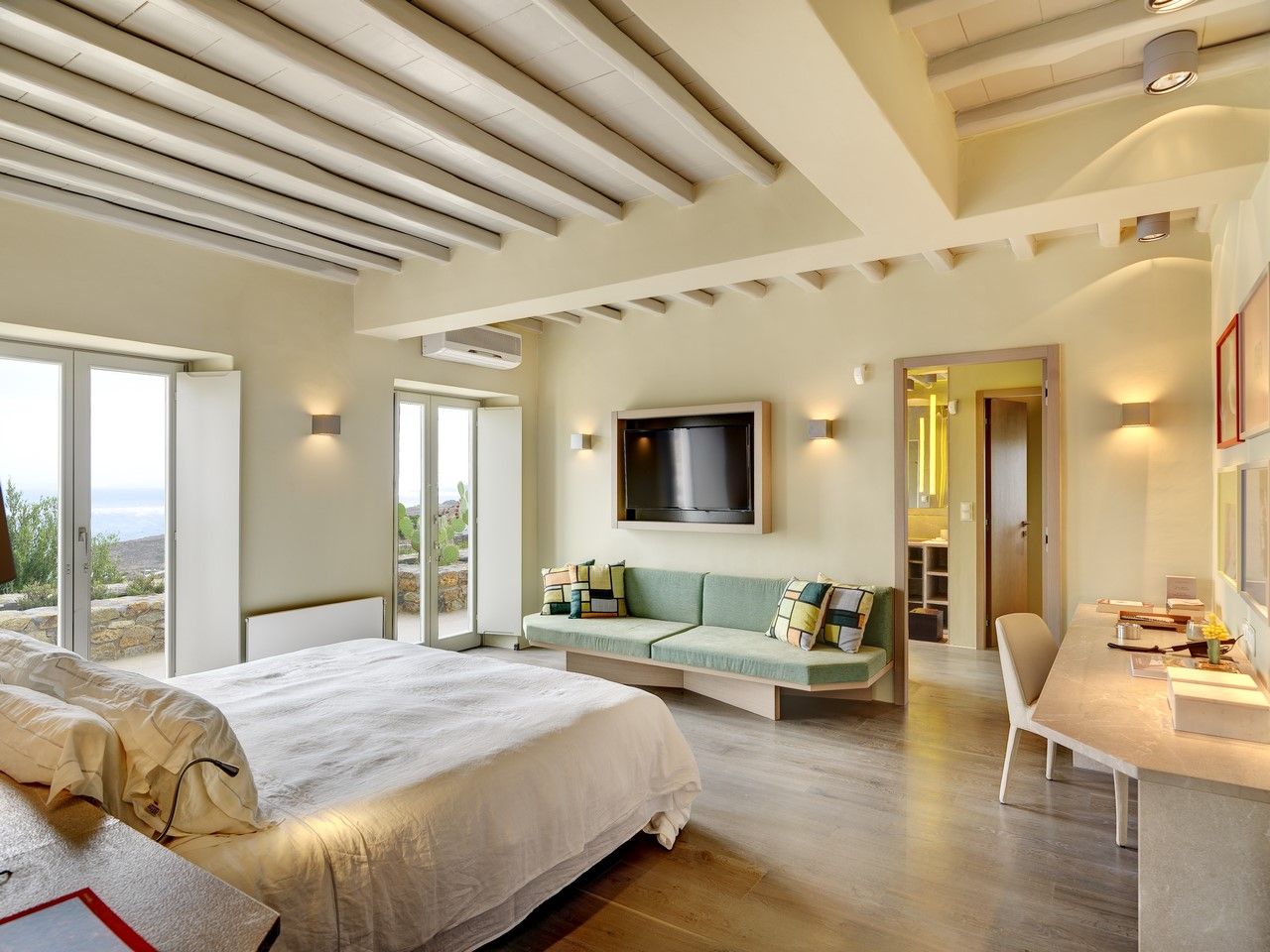 A short distance away, the remainder of the suites are housed in a typical Mykonian building, again with dramatic views. Suite 1 is on the first floor. On the left as you enter is the ensuite bathroom with limestone shower stall. Straight ahead is the sundrenched double bedroom with a desk and a small sofa. To the right up 3 steps with its own door is the second single bedroom with separate bathroom plus a large walk in closet area. Suite 1 has a total area of 56 m2 and has a small balcony with a breakfast table and sleeps three.