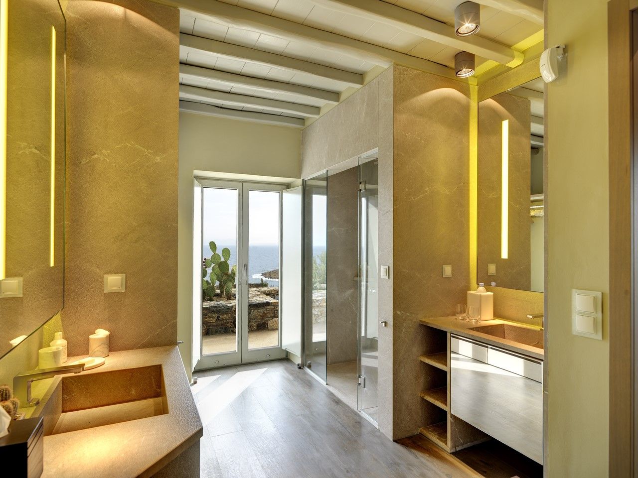 Suite 2 is underneath and is very large at 75 m2. It includes a large double bedroom with bookcases and a desk. To the right up 3 steps is an impressive bathroom with twin vanities and sinks, marble shower and WC stalls and a huge bathtub. Suite 2 also has a spacious terrace for sun bathing and a dining table and sleeps two.