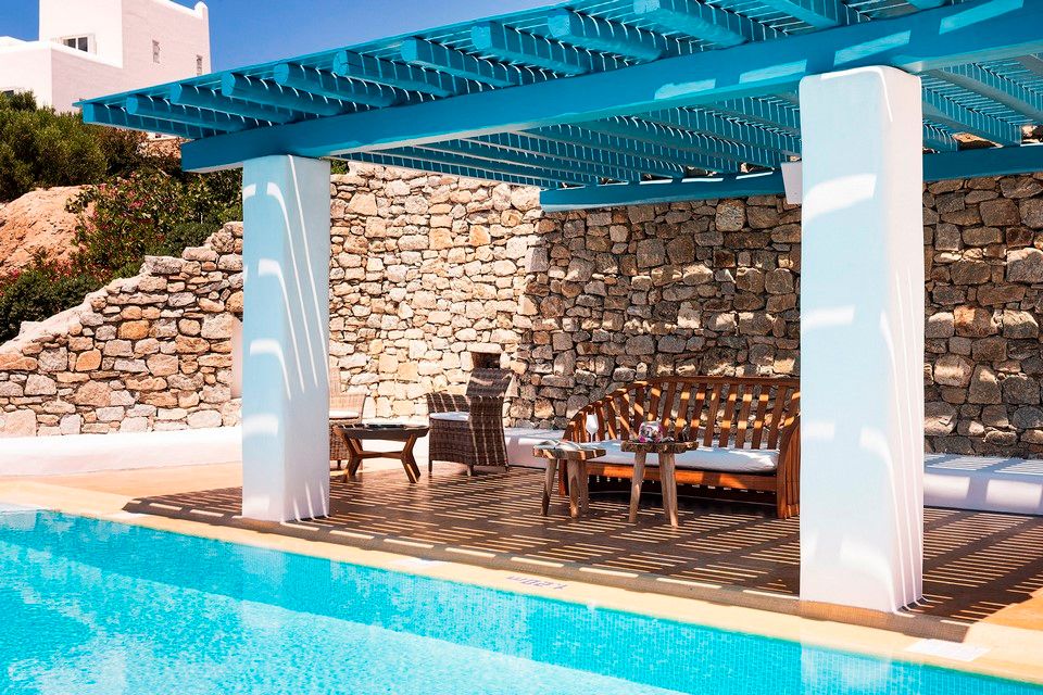 Villa Sante is uniquely ideal for 3 couples or families with children as it is on two level. The brilliant white interiors and exteriors and the subtle, tasteful decorations reflect the Mykonian elegance the island is known for, so you can totally immerse yourself in the spirit of the island.