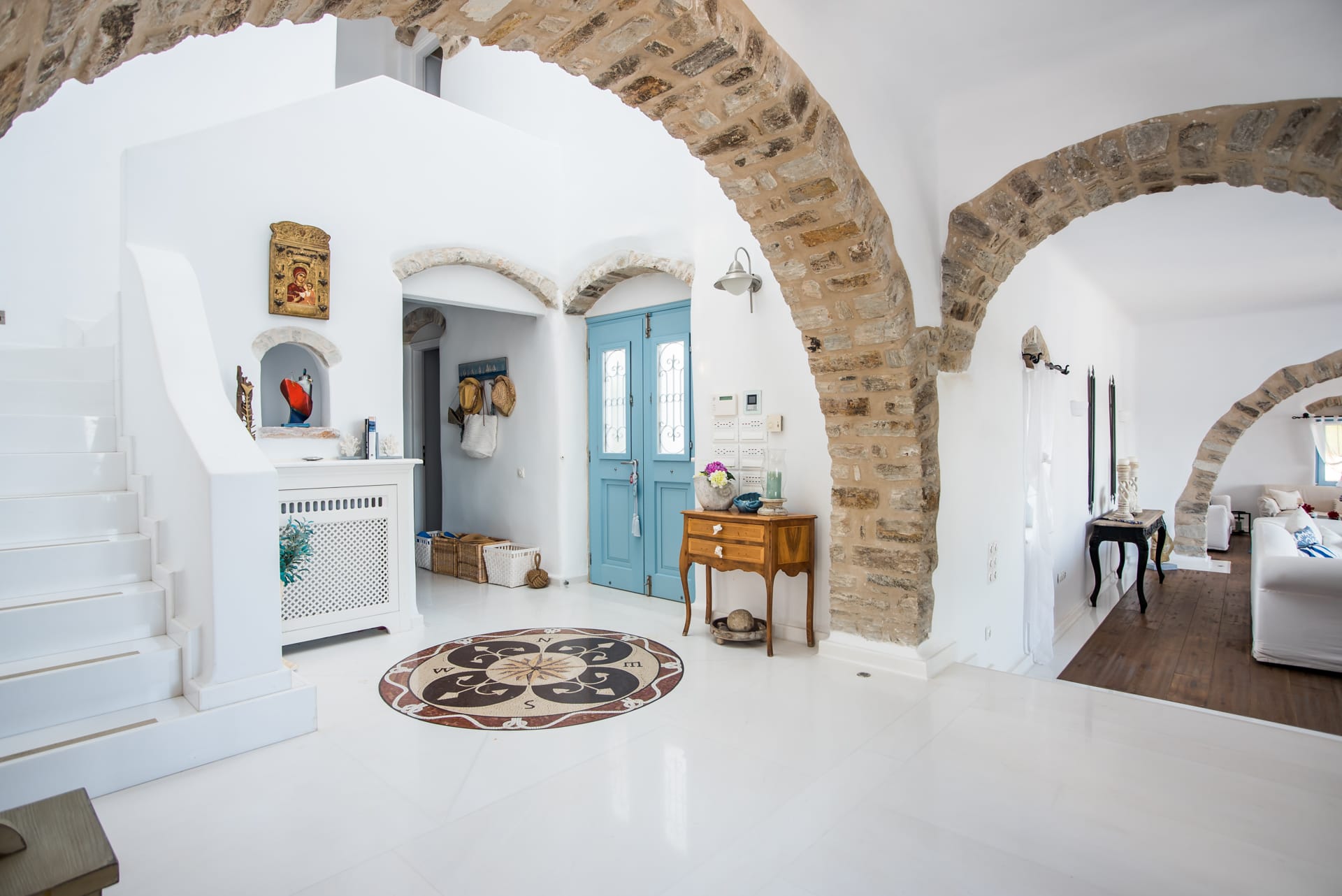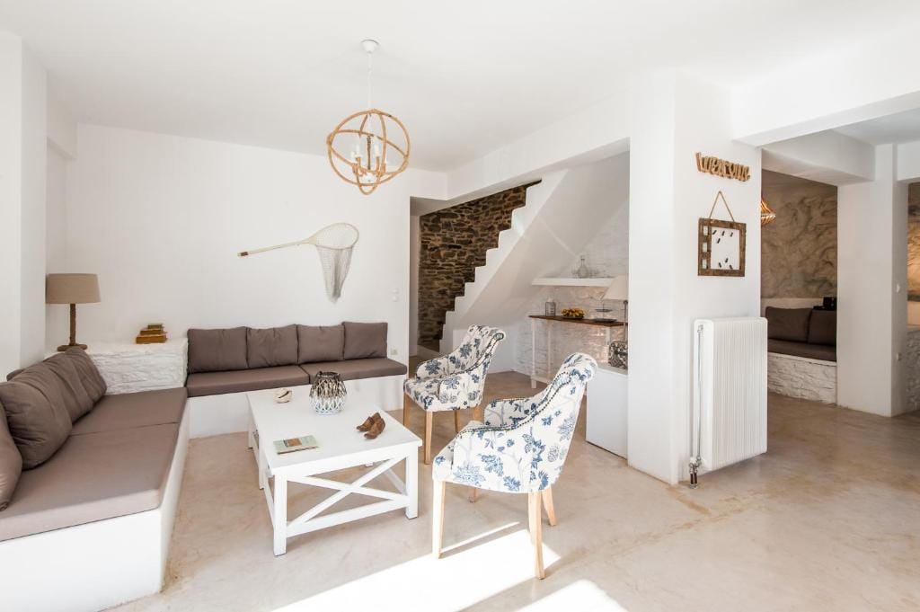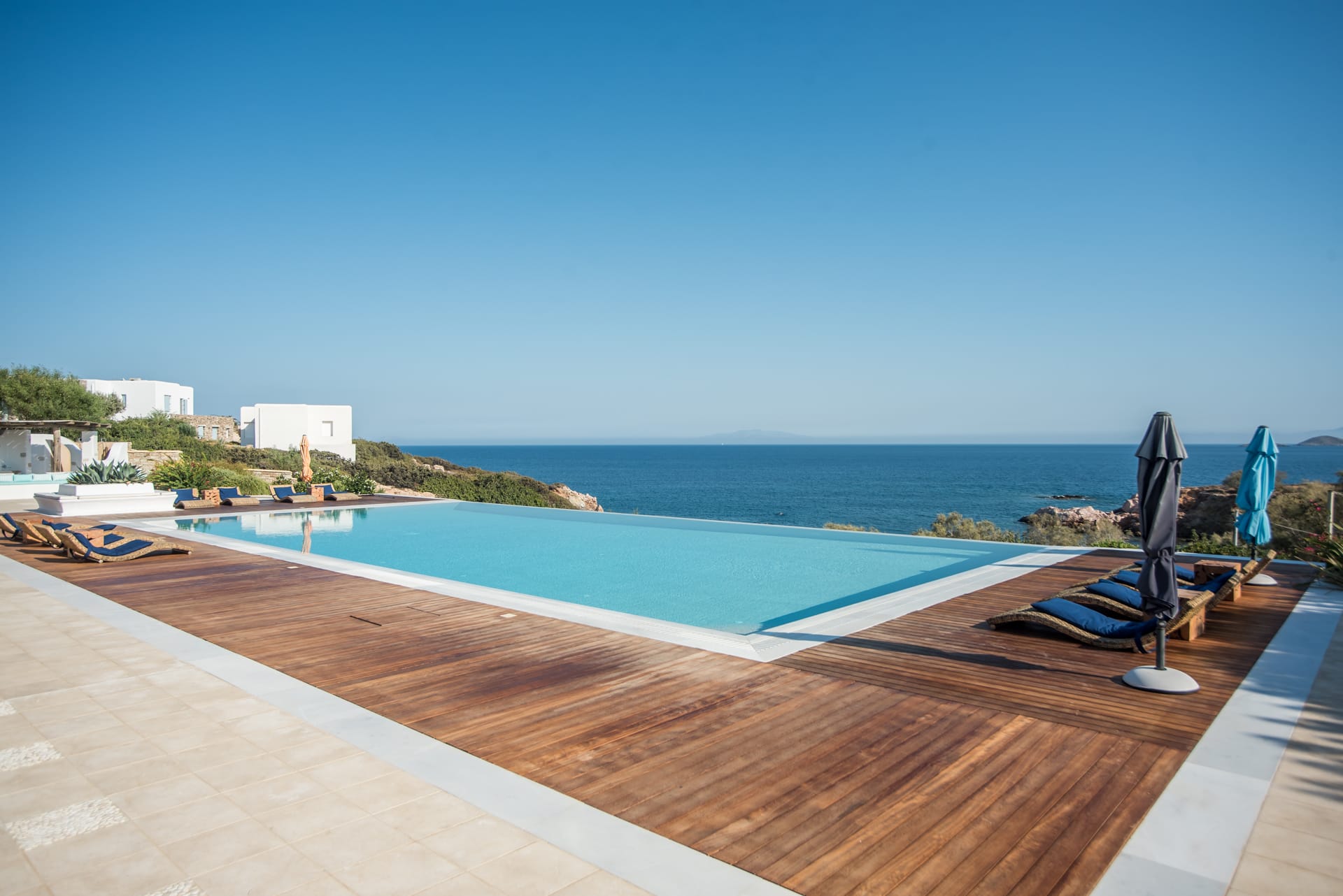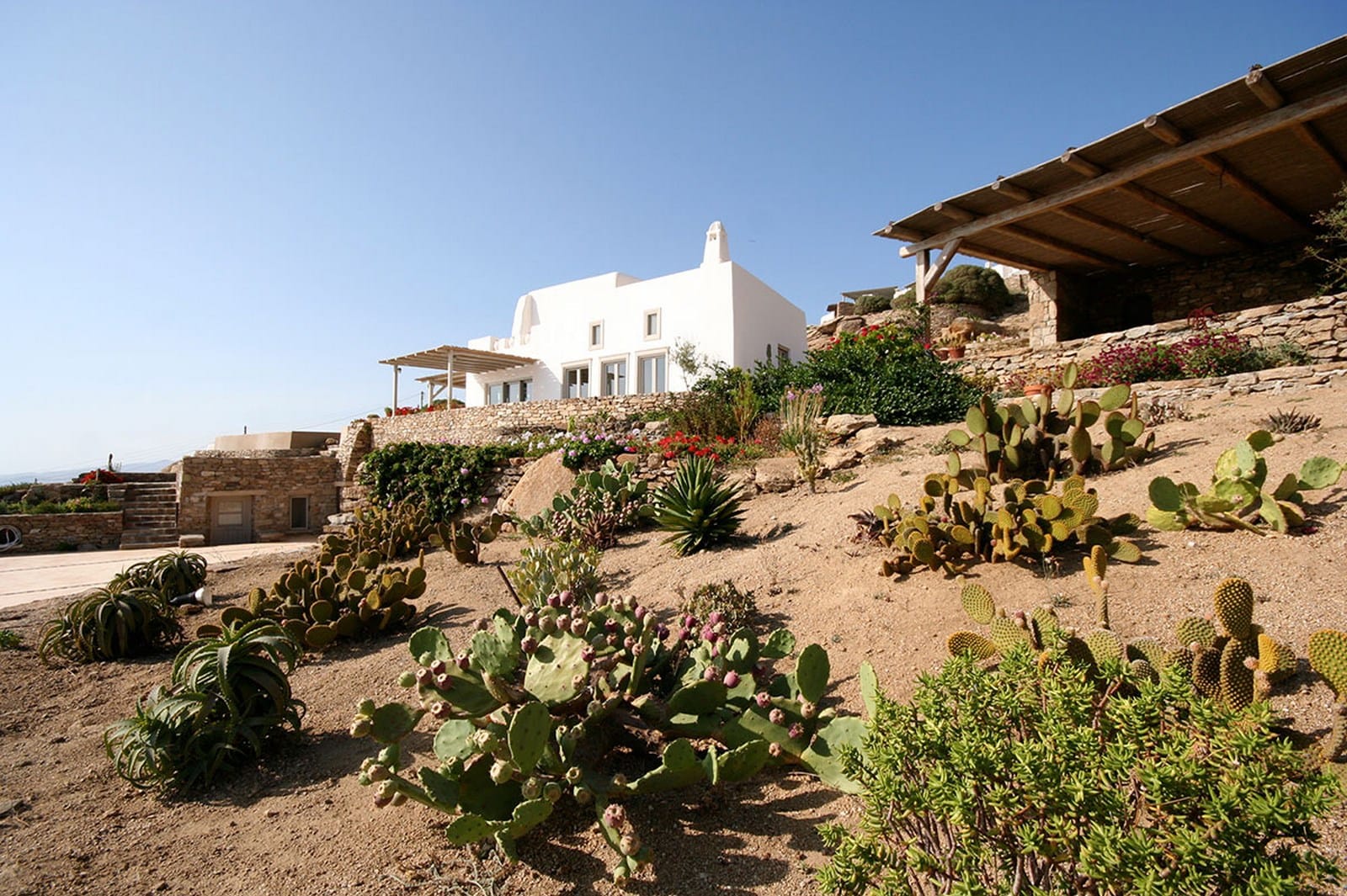 The property combines typical Cycladic architecture with elements of Provencal country style giving this property a special charm and remarkable appeal. The main house features a beautiful open plan kitchen, while the living room is bright and cozy. One of the two guesthouses is located below the pool and main patio, while the second, with kitchenette, is located above the main villa, next to a tiny private chapel.
