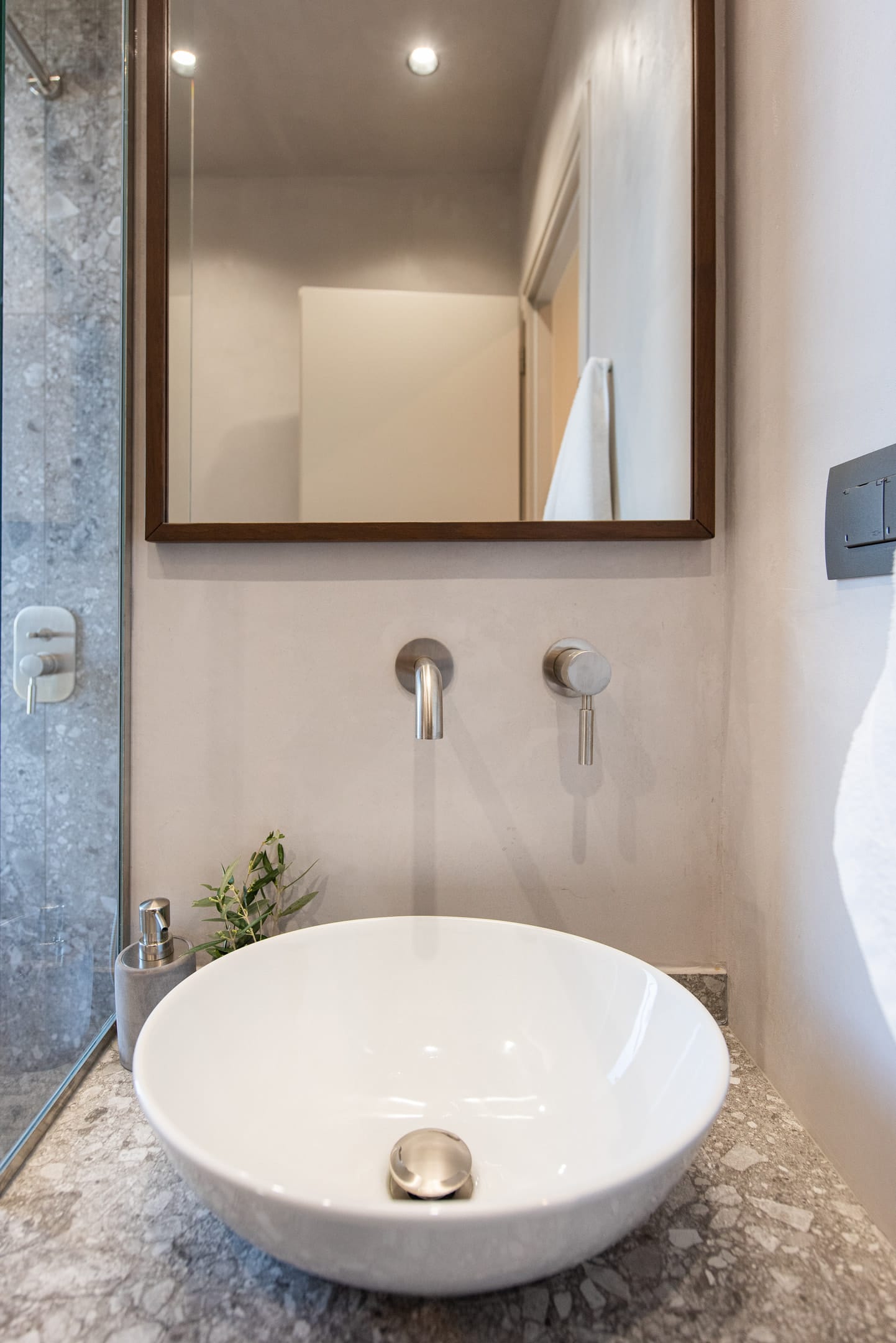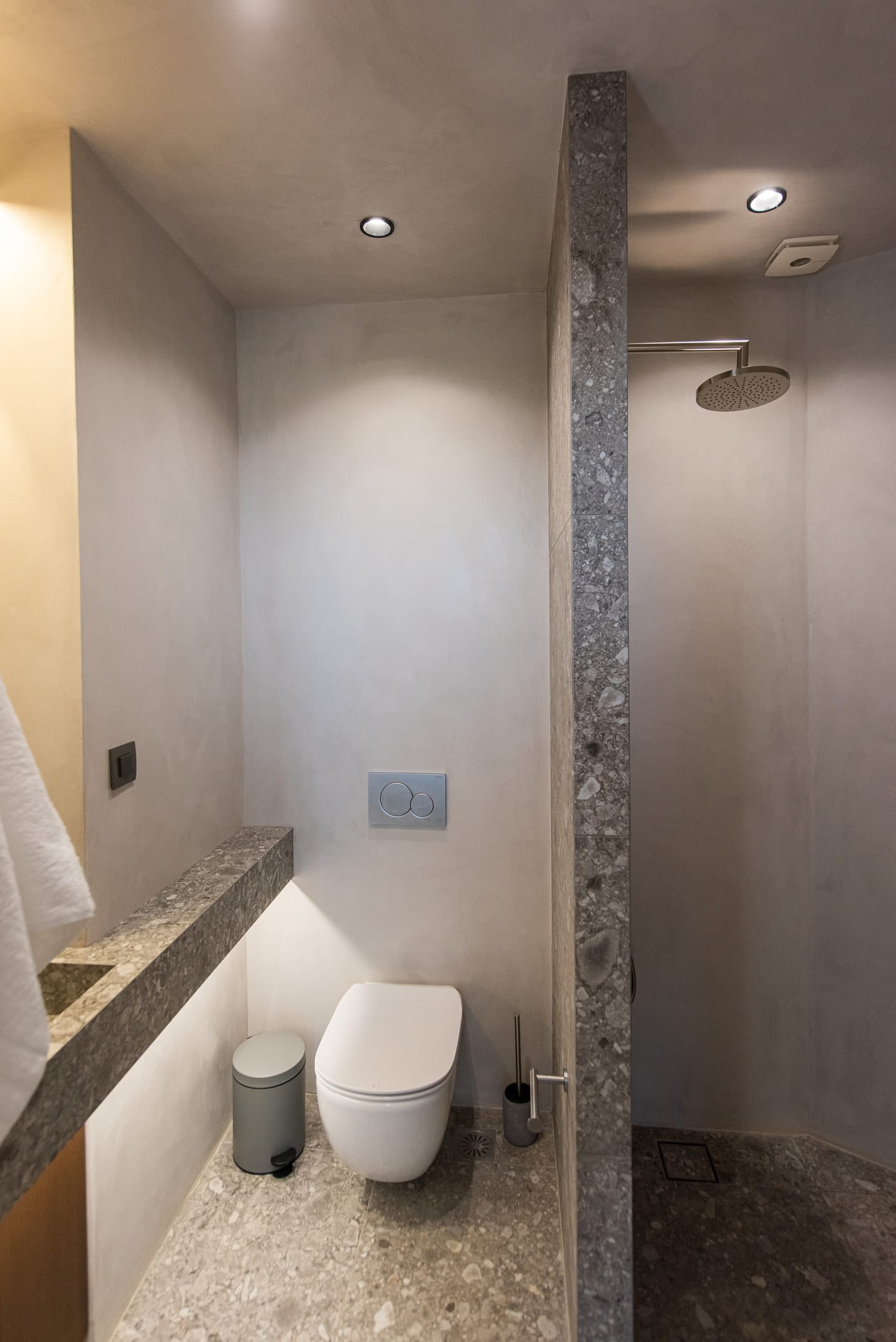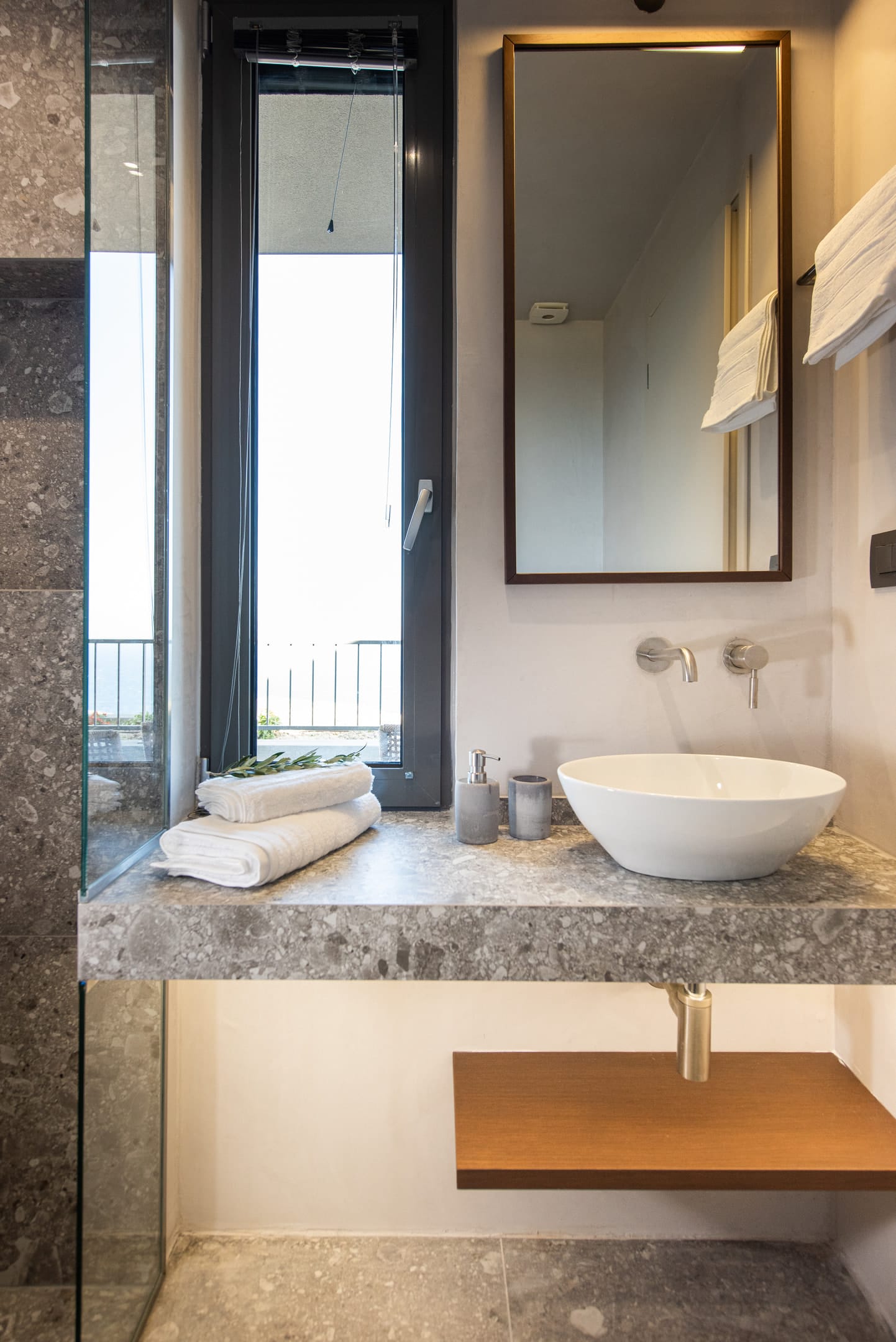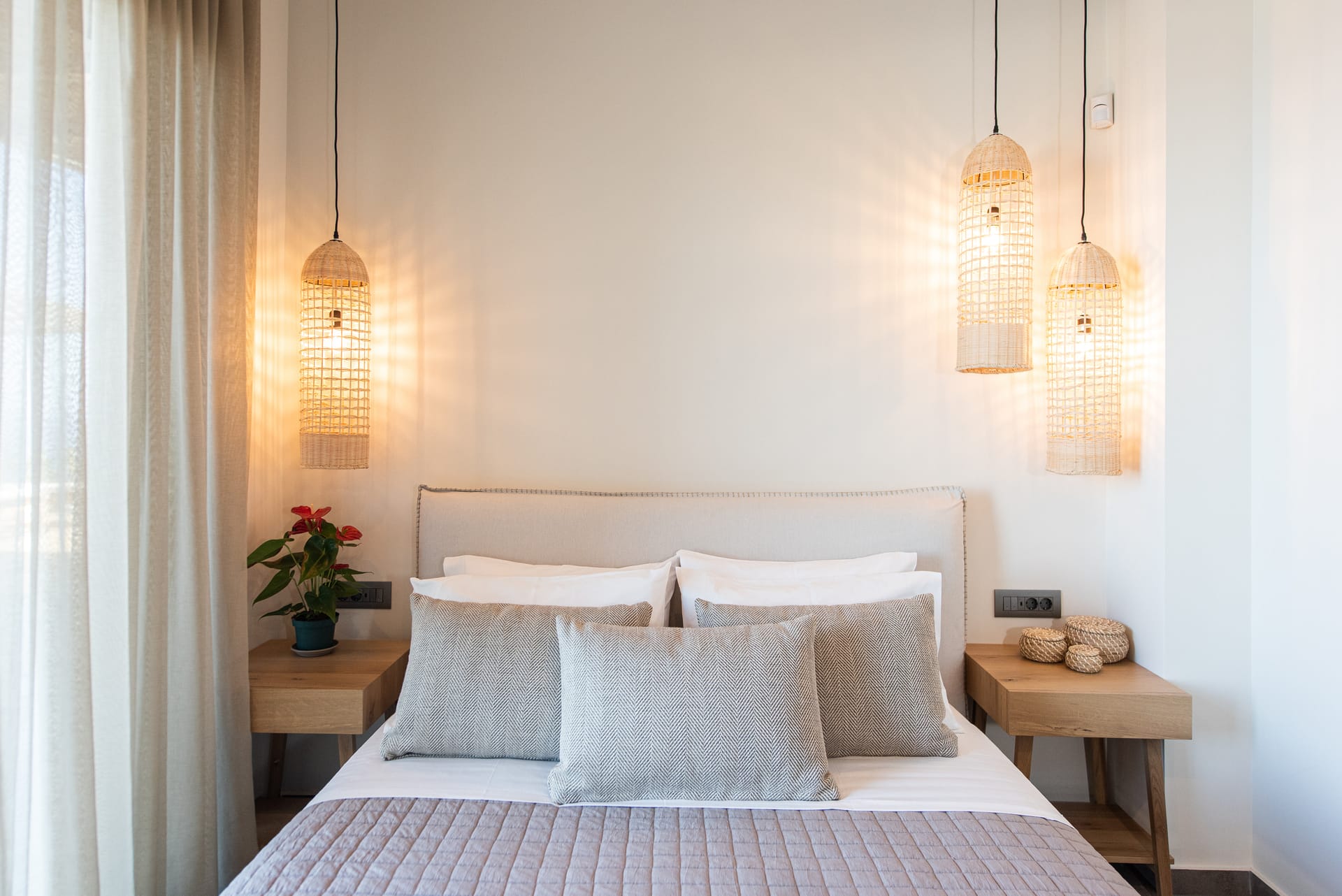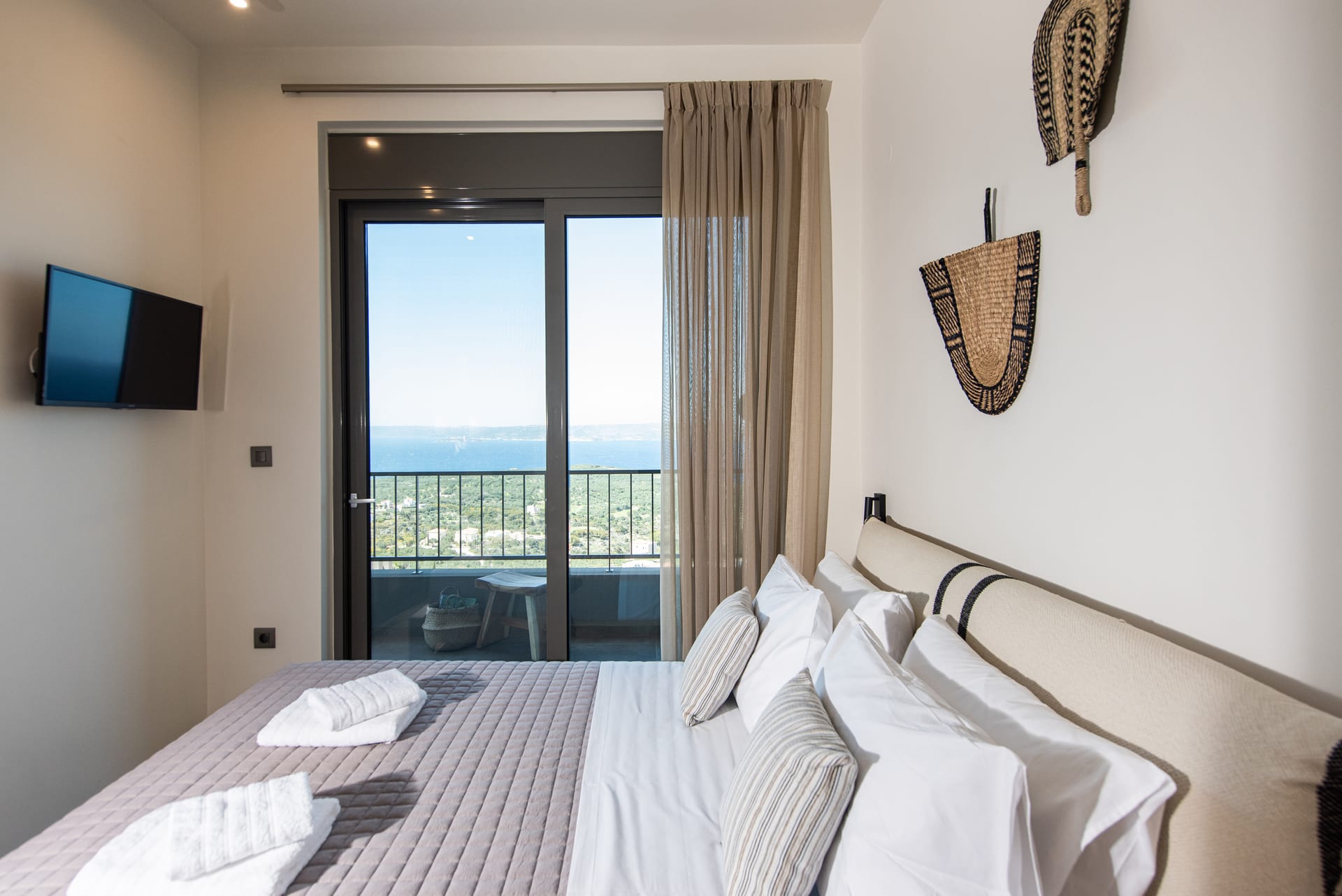 A master bedroom with a king-size bed, en suite shower room, has access to both shared and private balconies through large sliding terrace windows.