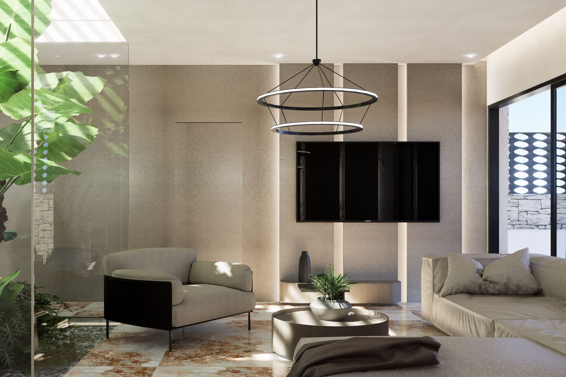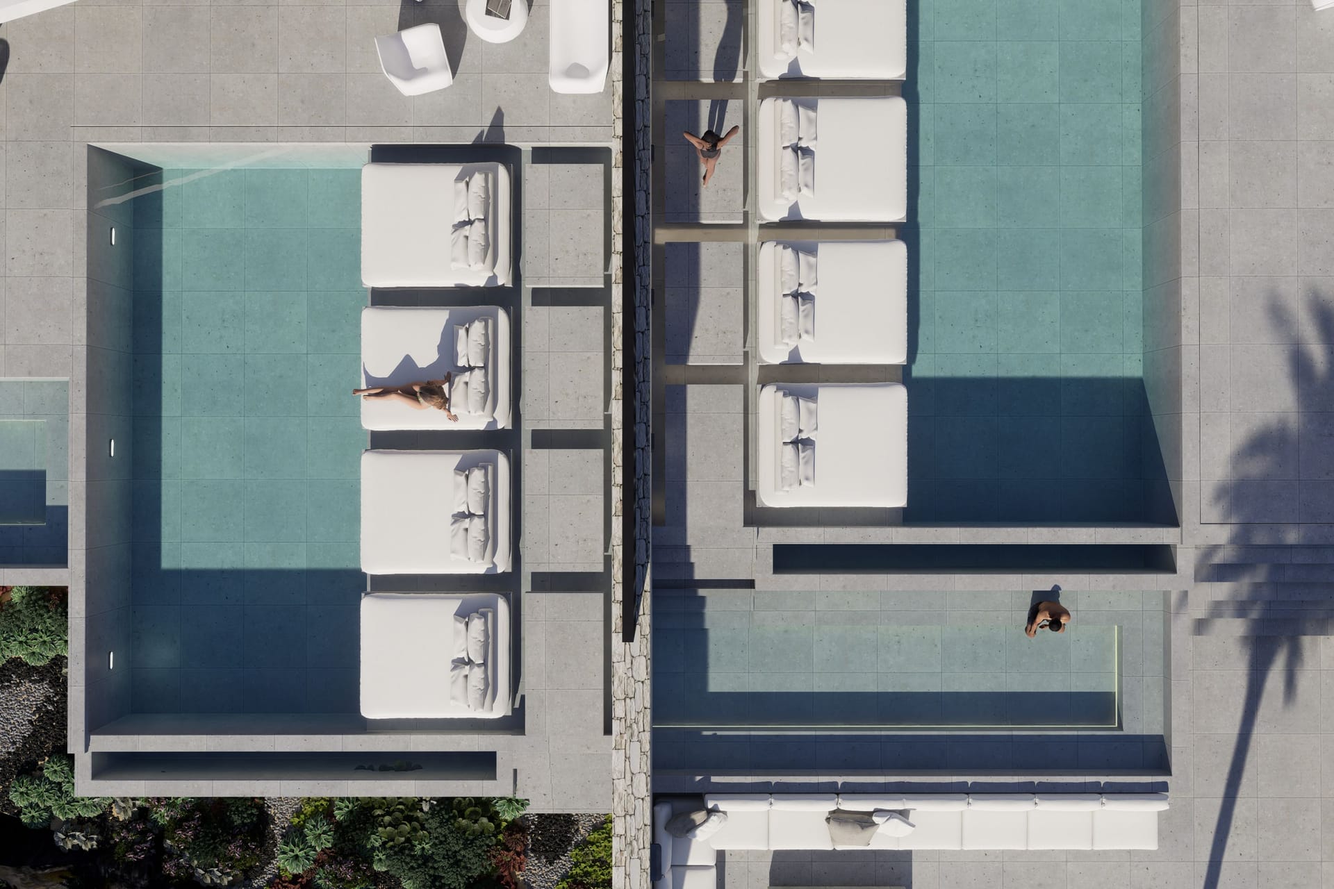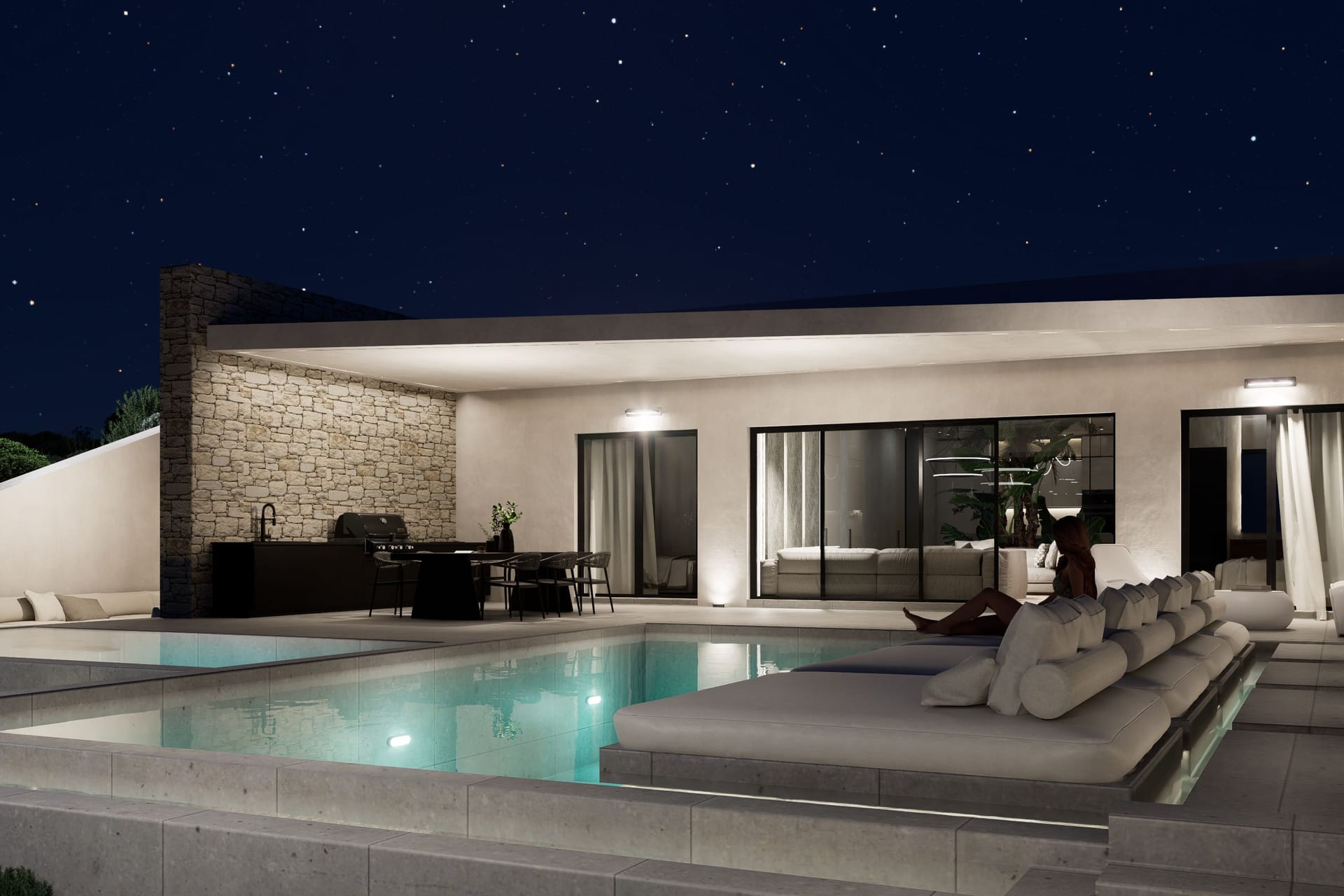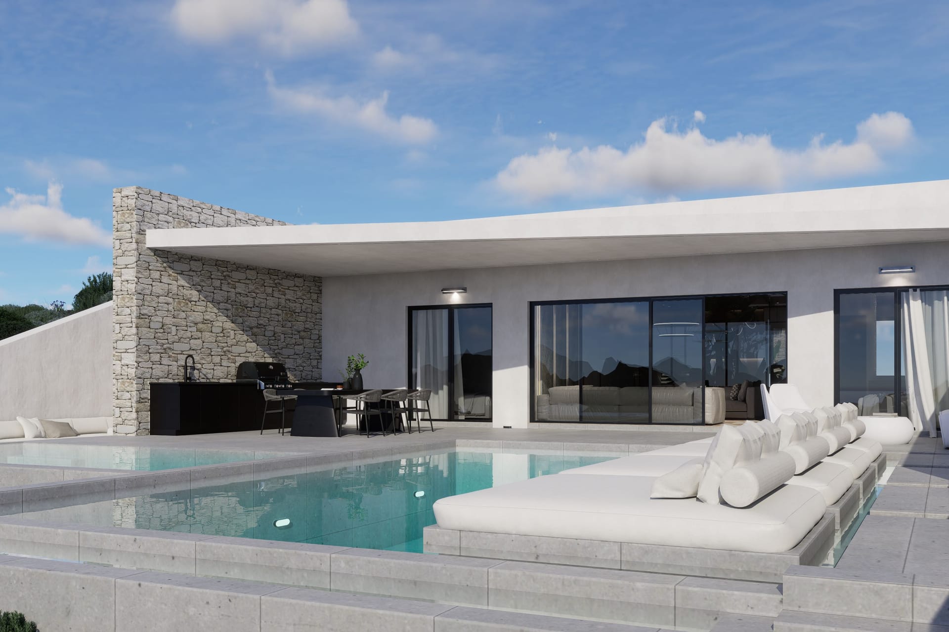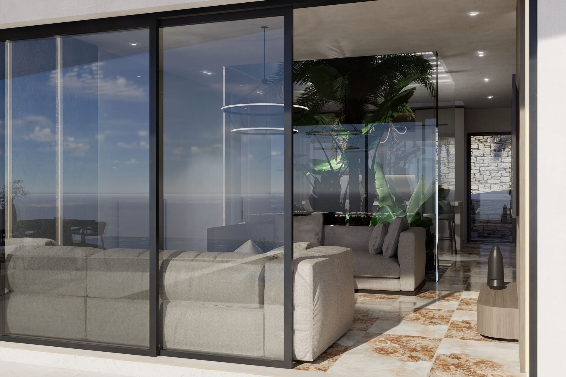 With three double bedrooms, a cinema room with a sofa-bed, a large private infinity heated swimming pool, and an outdoor dining and BBQ area, KOKOBLUE comfortably accommodates up to 8 guests. The villa’s design emphasizes both privacy and panoramic views with multiple balconies and terraces.