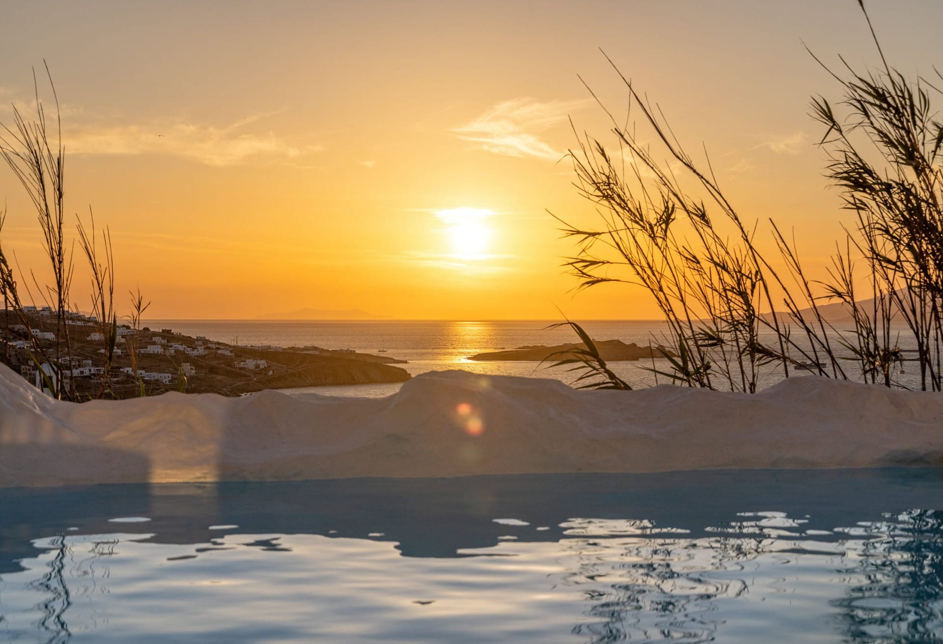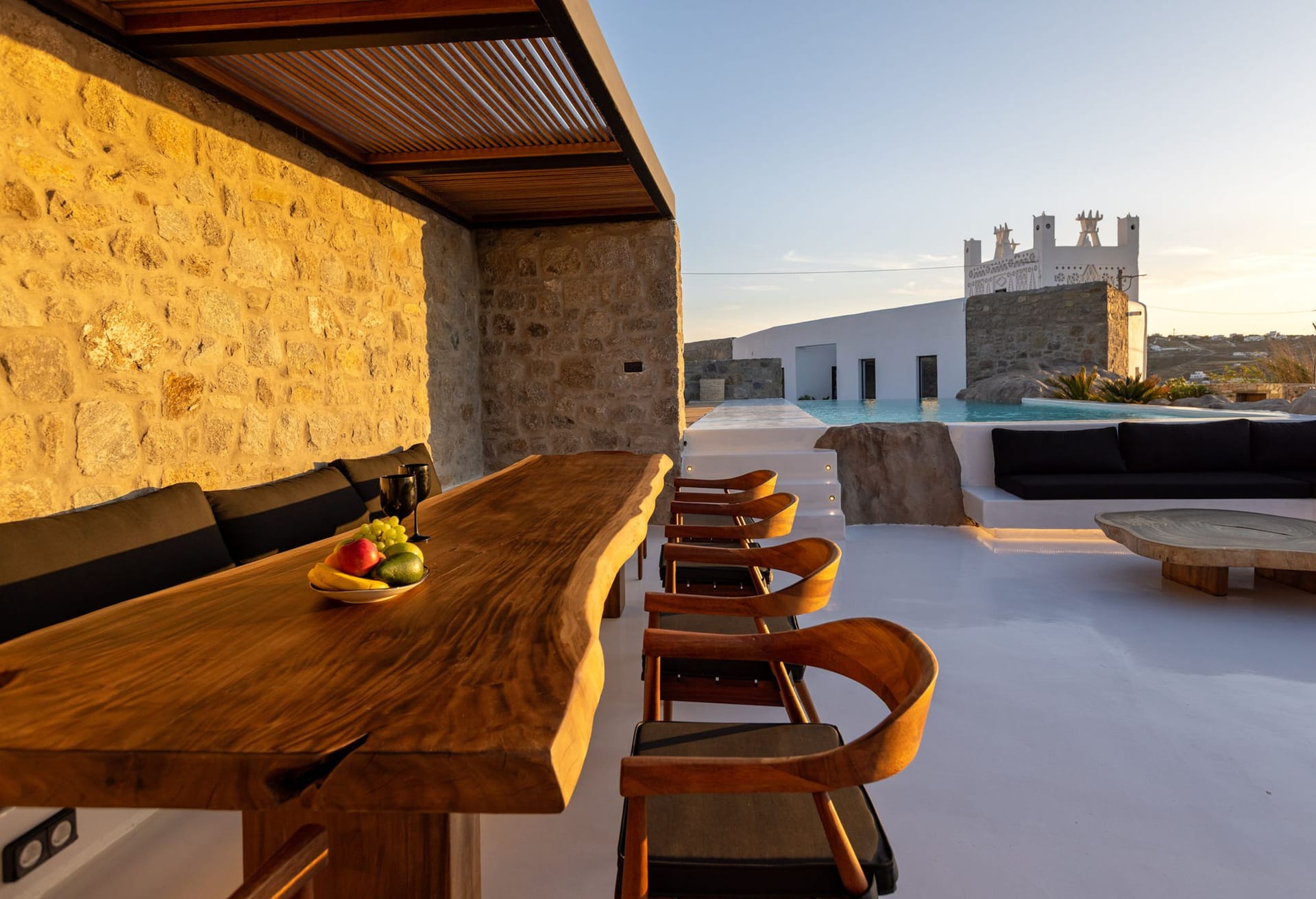 Designed in high aesthetics and offering relaxation and lounging areas, they will be your own paradise in Mykonos to enjoy private moments of comfort, dine under the stars at the pergola-protected areas, enjoy intimate jacuzzi moments and soak the bright Greek sun in the large infinity pool. Lie on the in-pool sun beds and let go in the calming moments Villa Downtown offers.