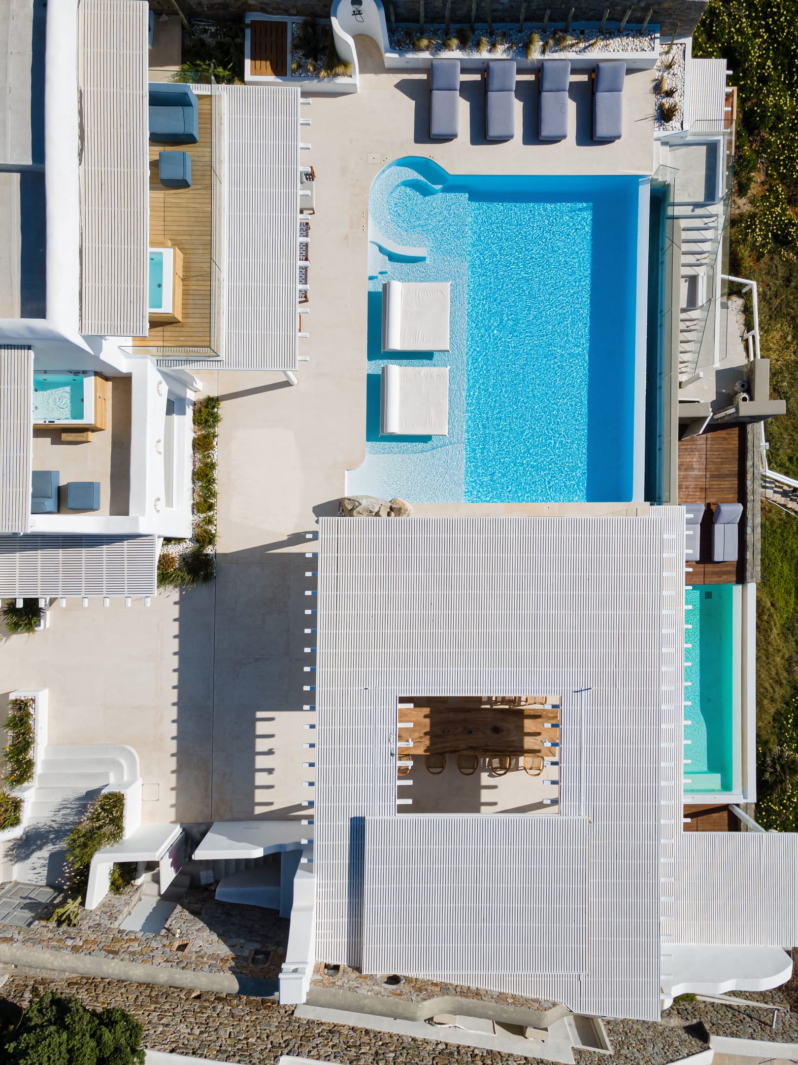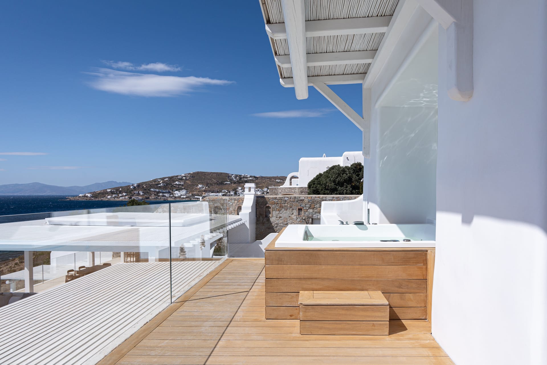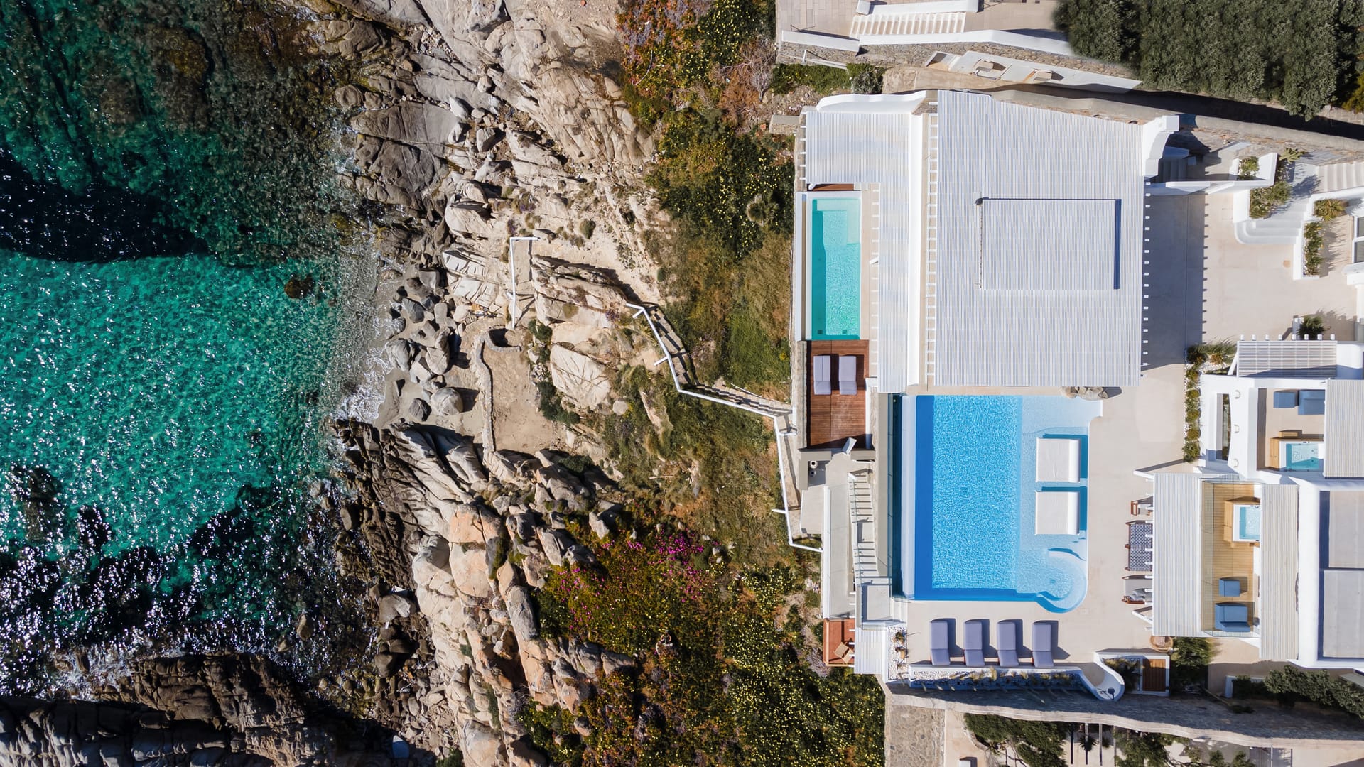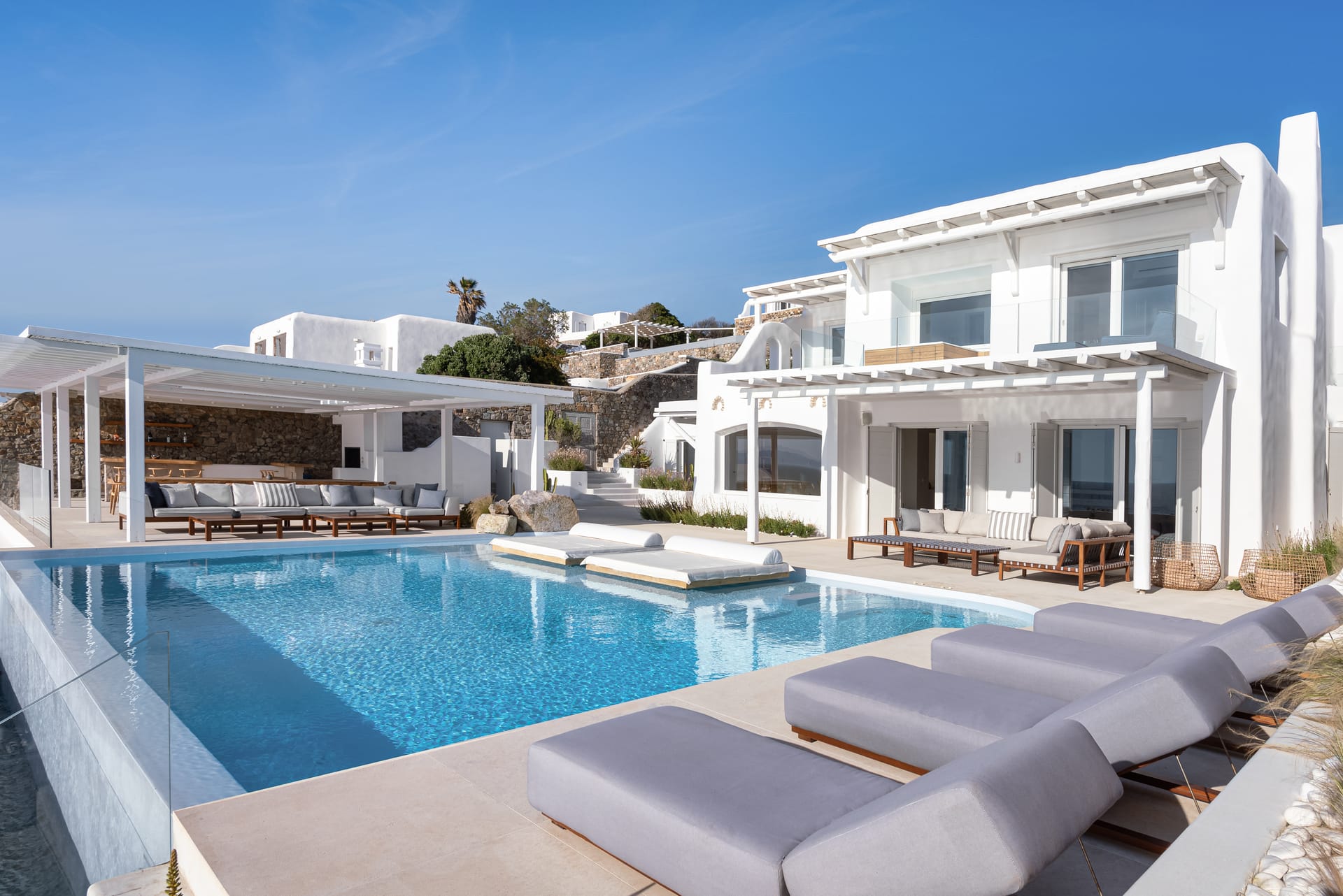 The top-floor suites include private jacuzzis, with one boasting an exclusive terrace, offering breathtaking views of the endless Aegean. Thelower level provides additional privacy with four bedrooms, each with an ensuite and kitchen, as well as another pool. This level also features a spacious outdoor living area for guests seeking a tranquil retreat.