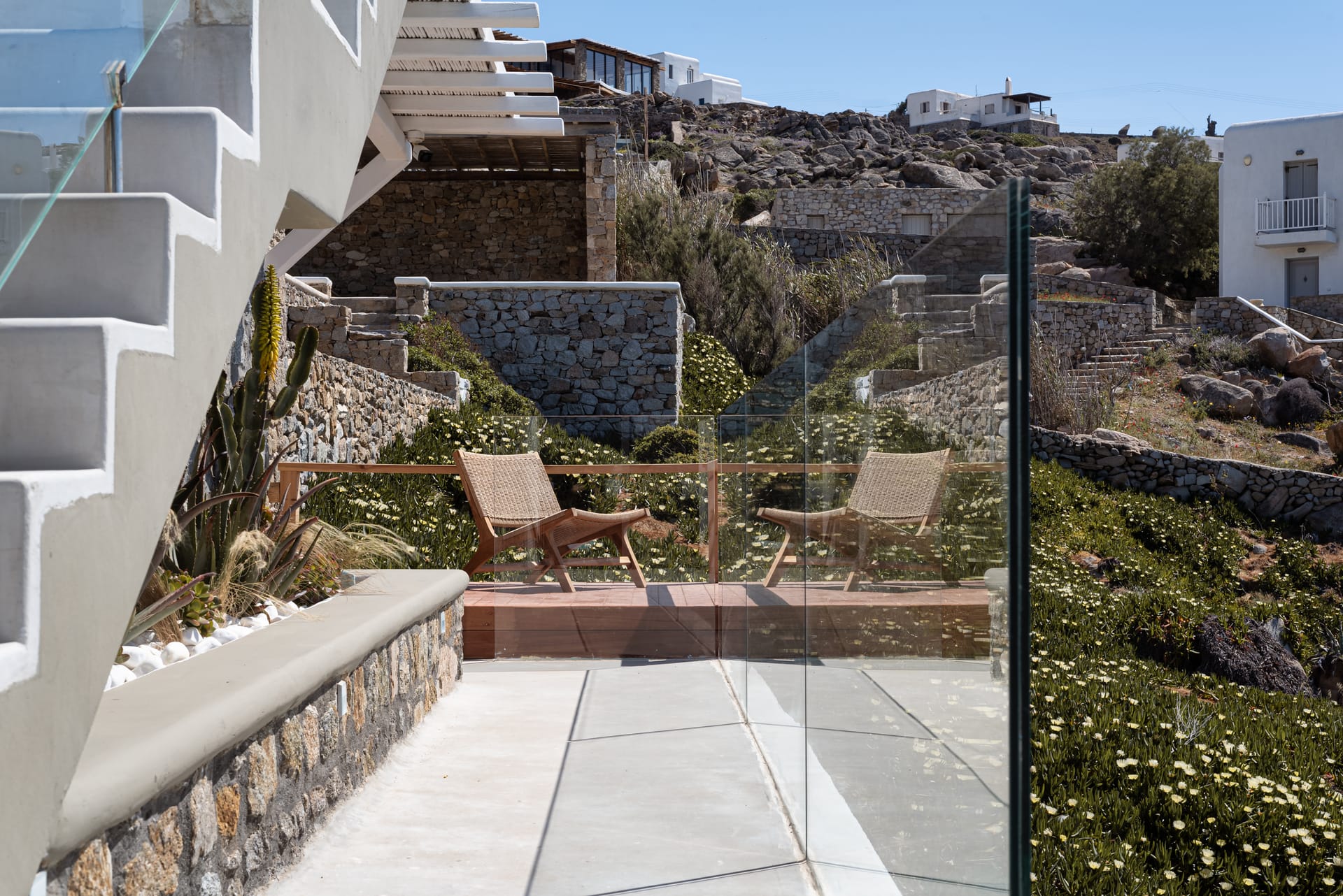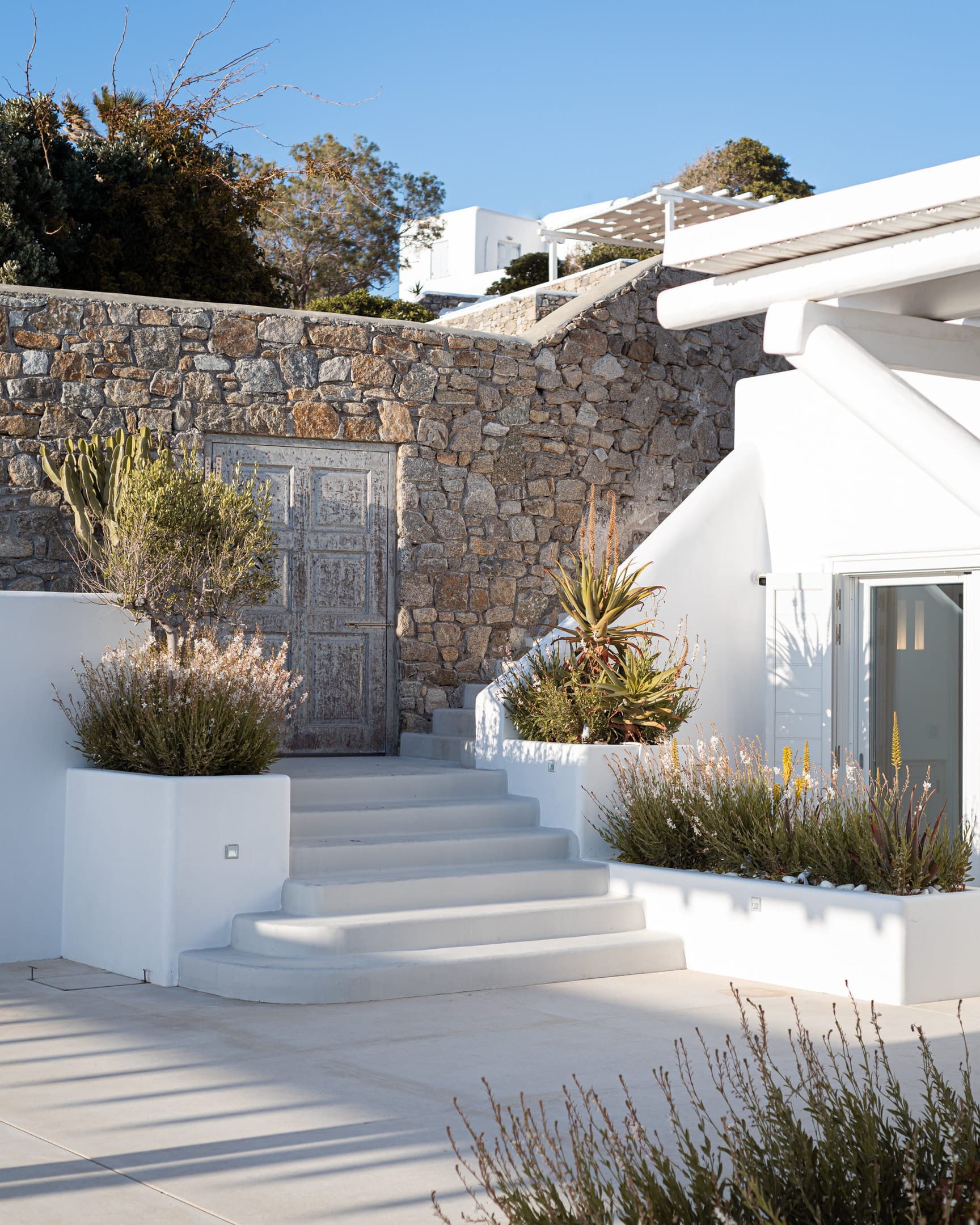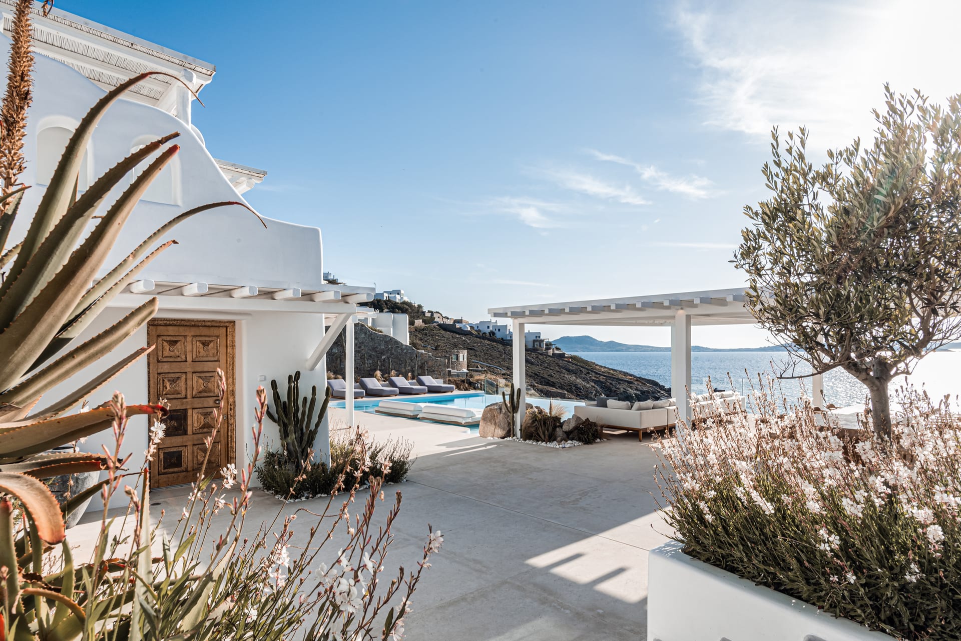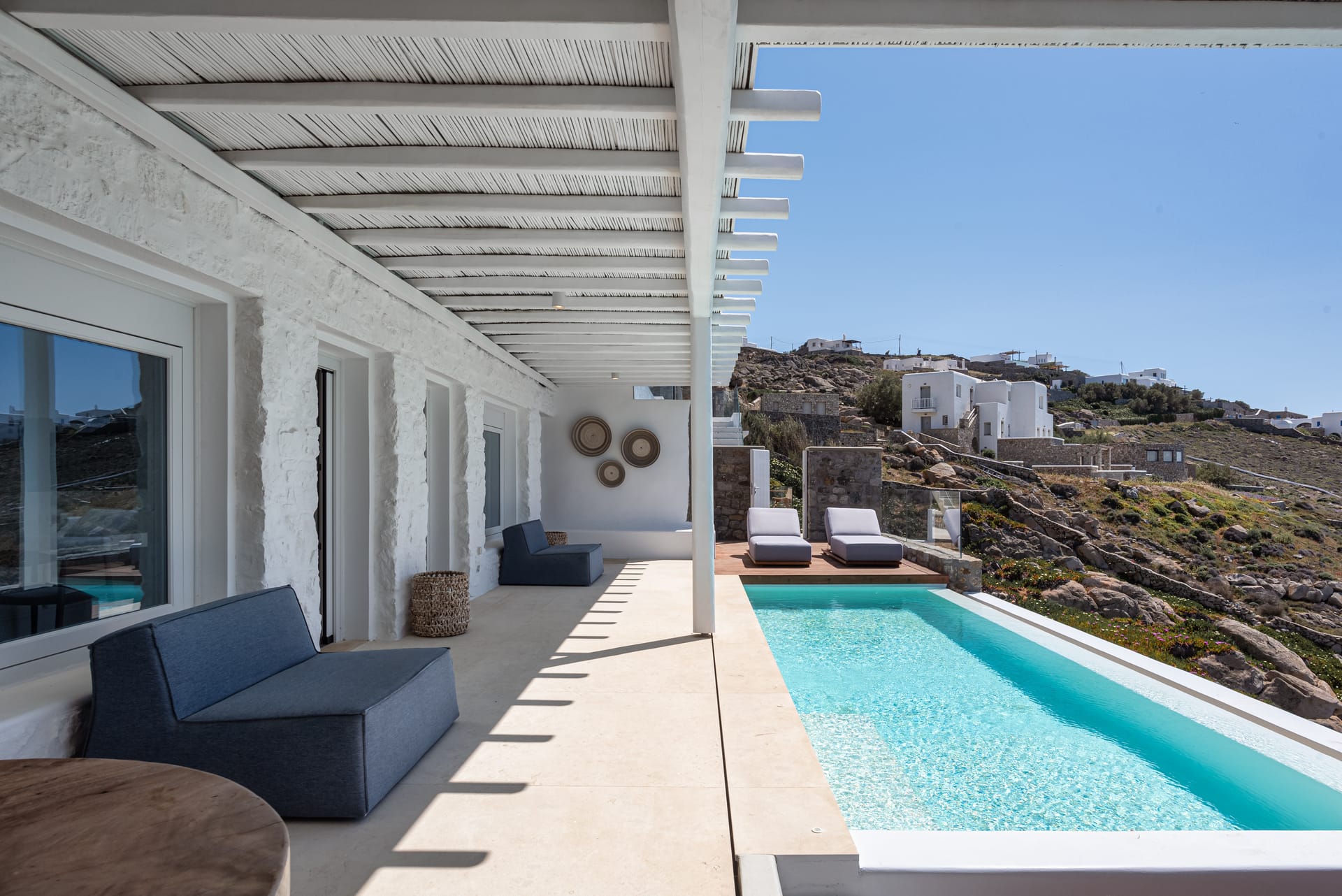 The top-floor suites include private jacuzzis, with one boasting an exclusive terrace, offering breathtaking views of the endless Aegean. Thelower level provides additional privacy with four bedrooms, each with an ensuite and kitchen, as well as another pool. This level also features a spacious outdoor living area for guests seeking a tranquil retreat.