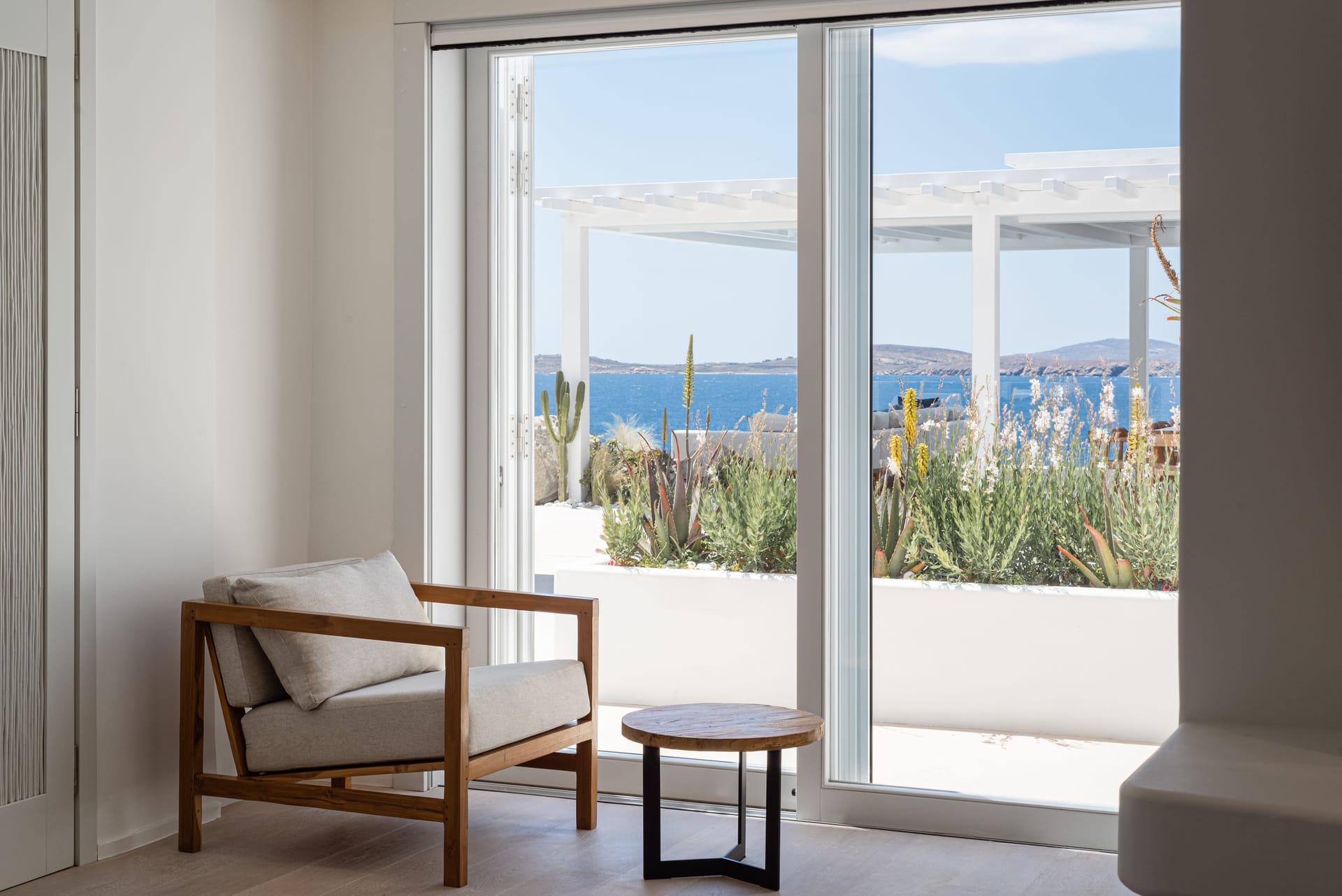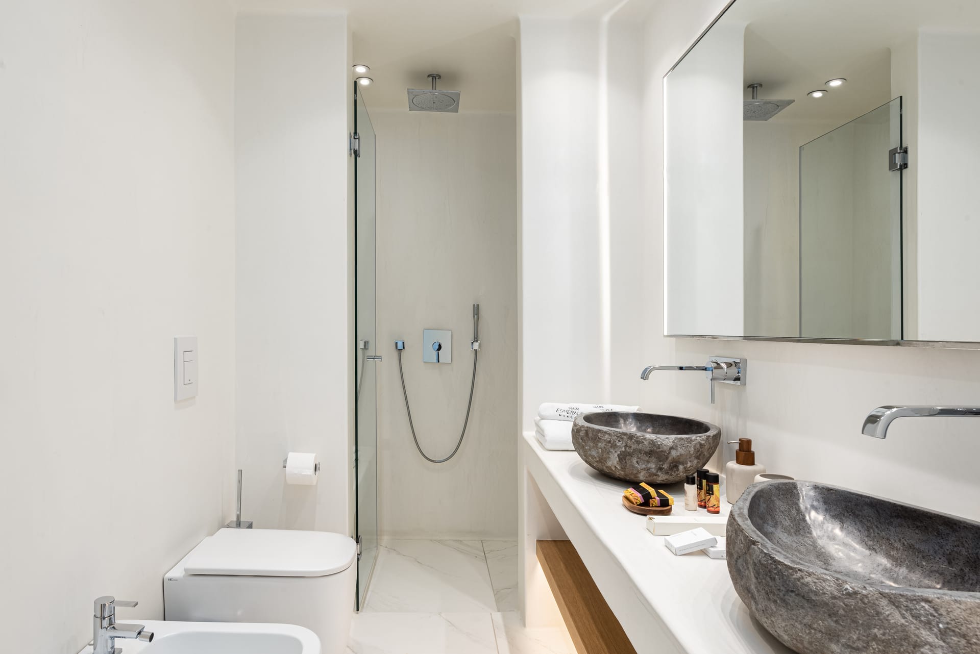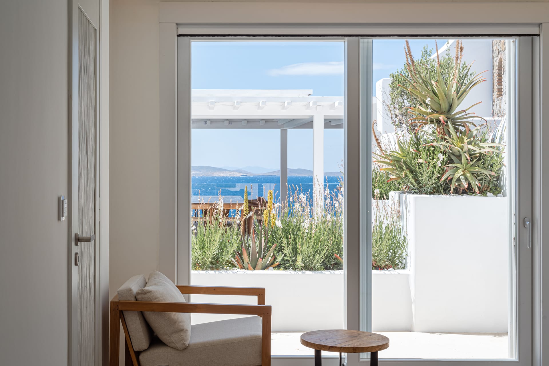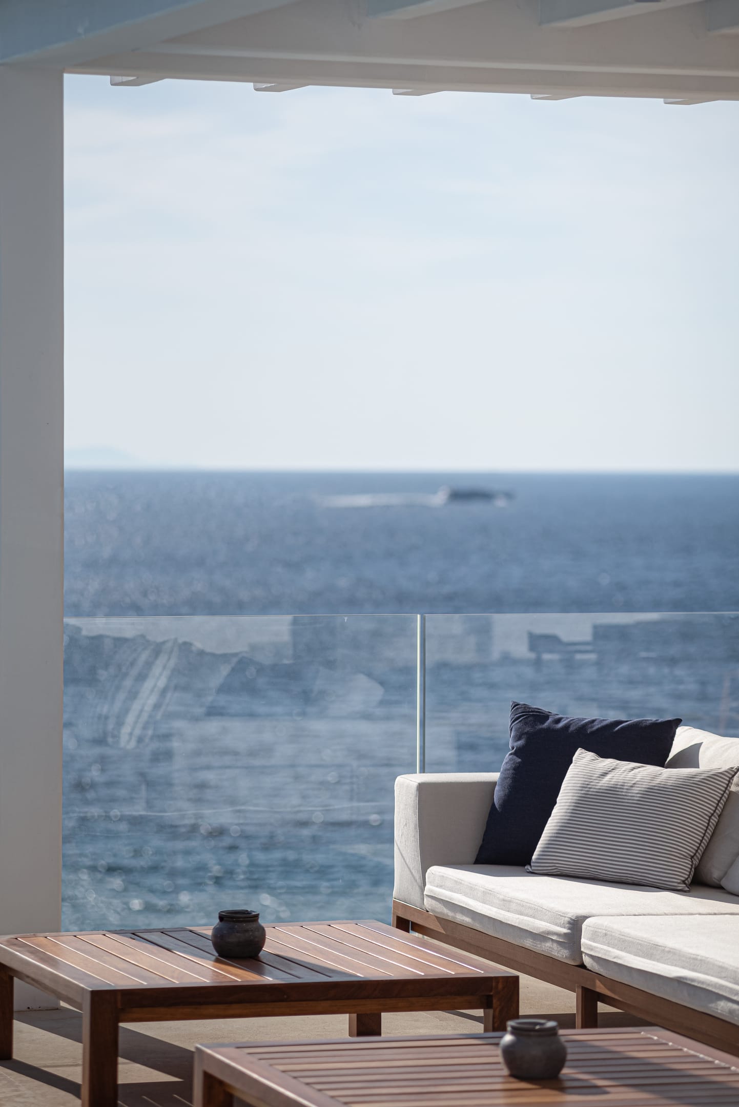 The top-floor suites include private jacuzzis, with one boasting an exclusive terrace, offering breathtaking views of the endless Aegean. Thelower level provides additional privacy with four bedrooms, each with an ensuite and kitchen, as well as another pool. This level also features a spacious outdoor living area for guests seeking a tranquil retreat.