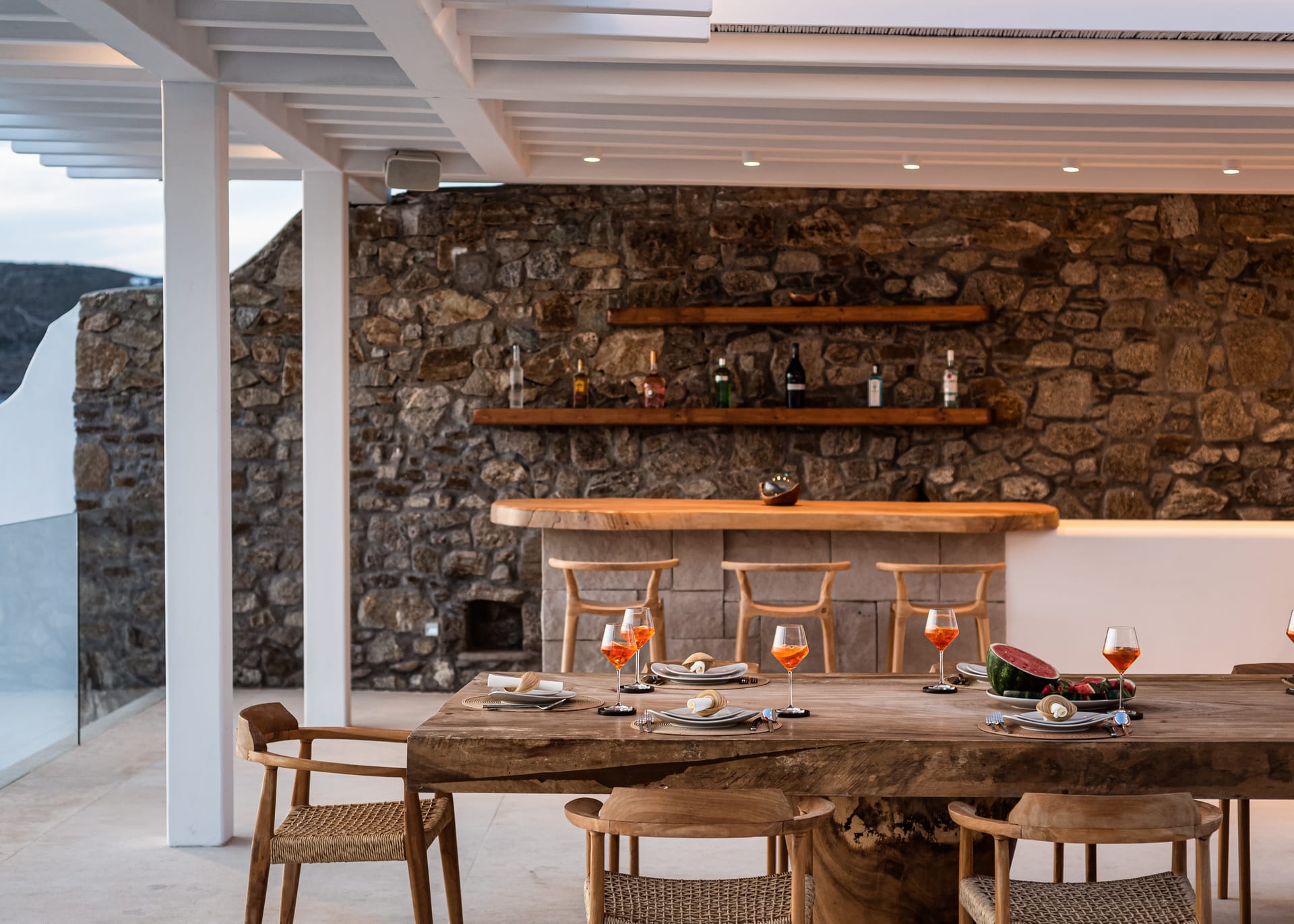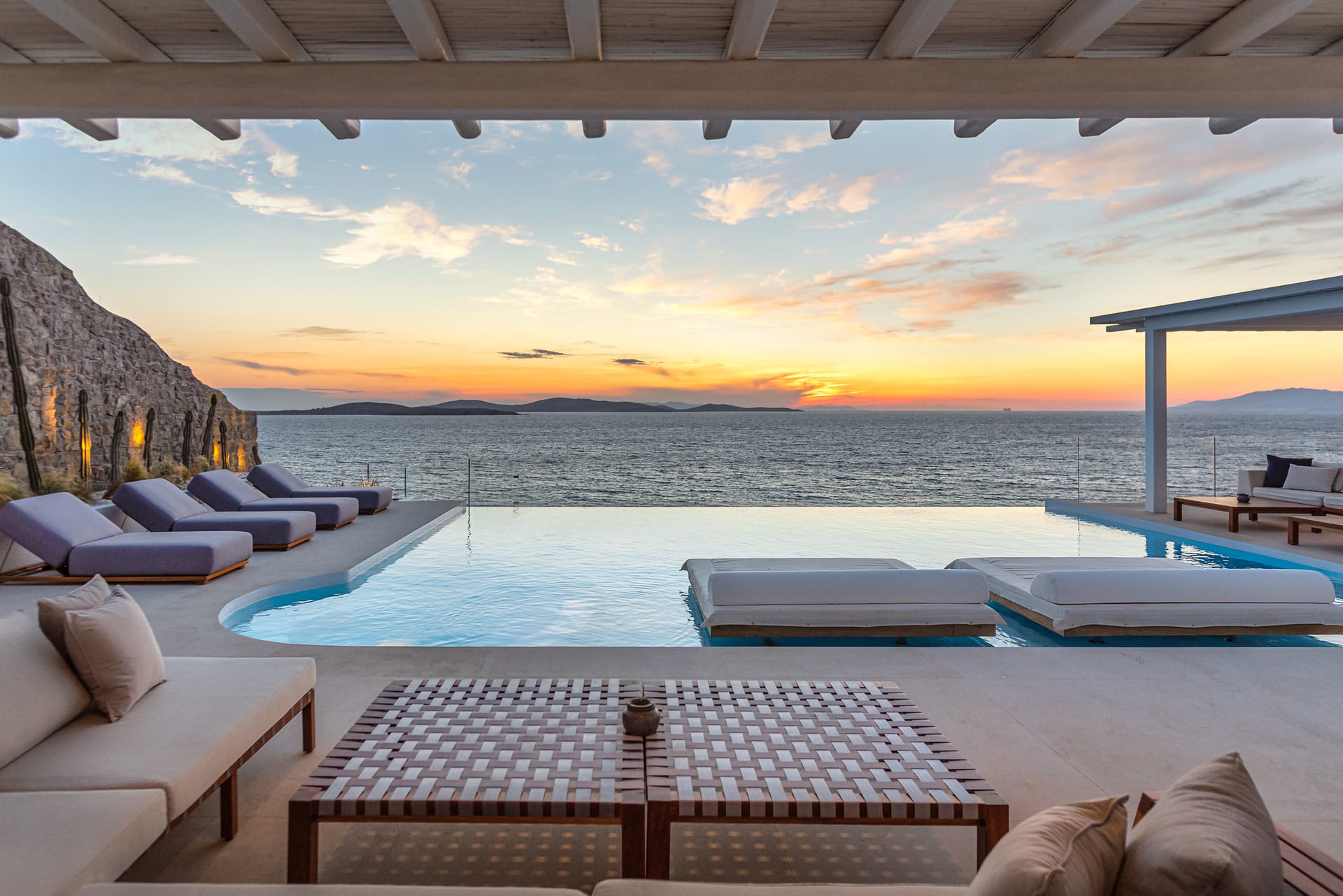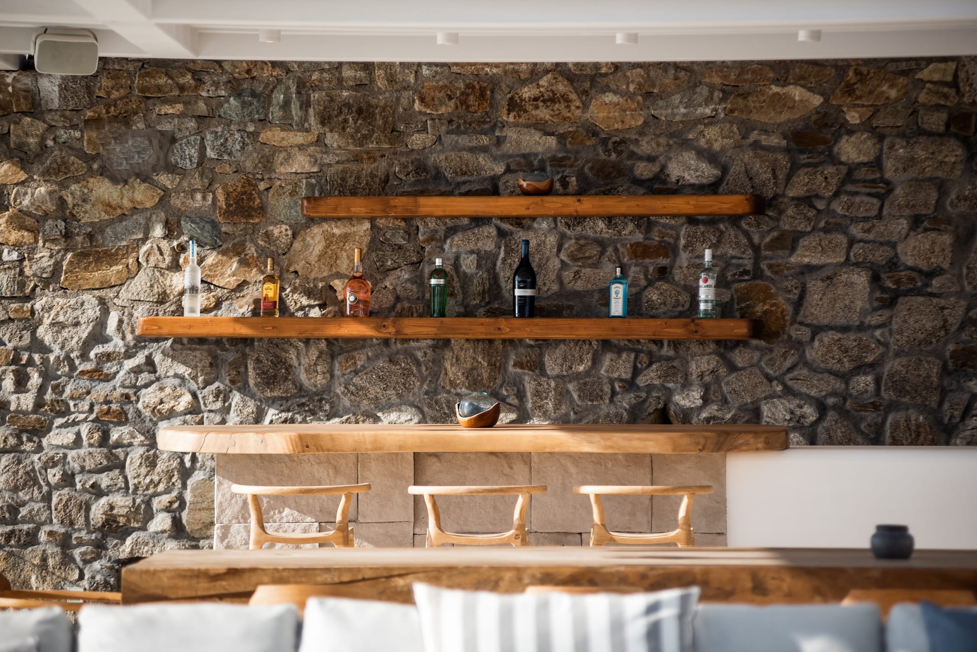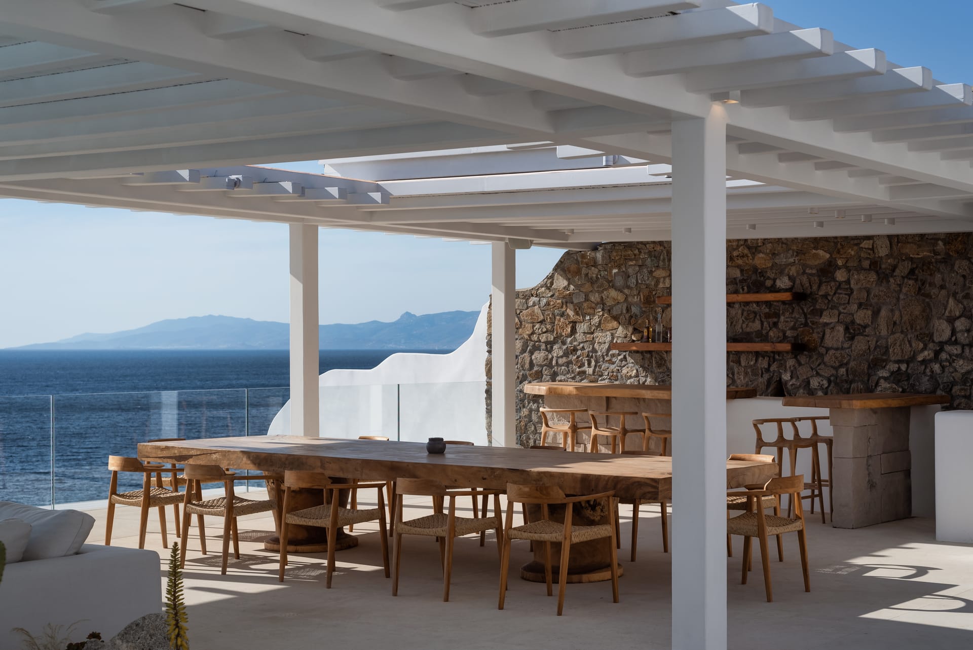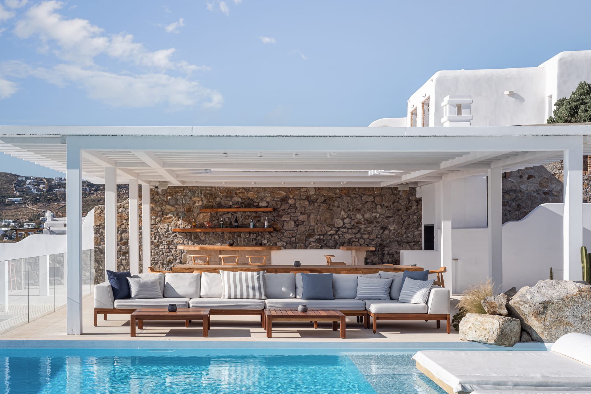 Spanning three levels, the villa comfortably accommodates up to 20 guests across 10 elegant ensuite bedrooms, many of which feature stunning sea views. The interiors exude warmth and refinement, with natural materials, handcrafted decor, and bespoke furnishings creating a serene ambiance.