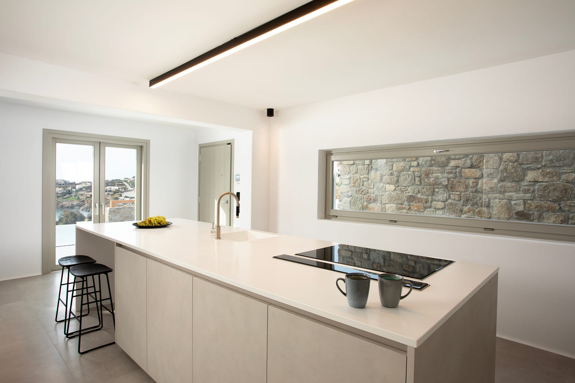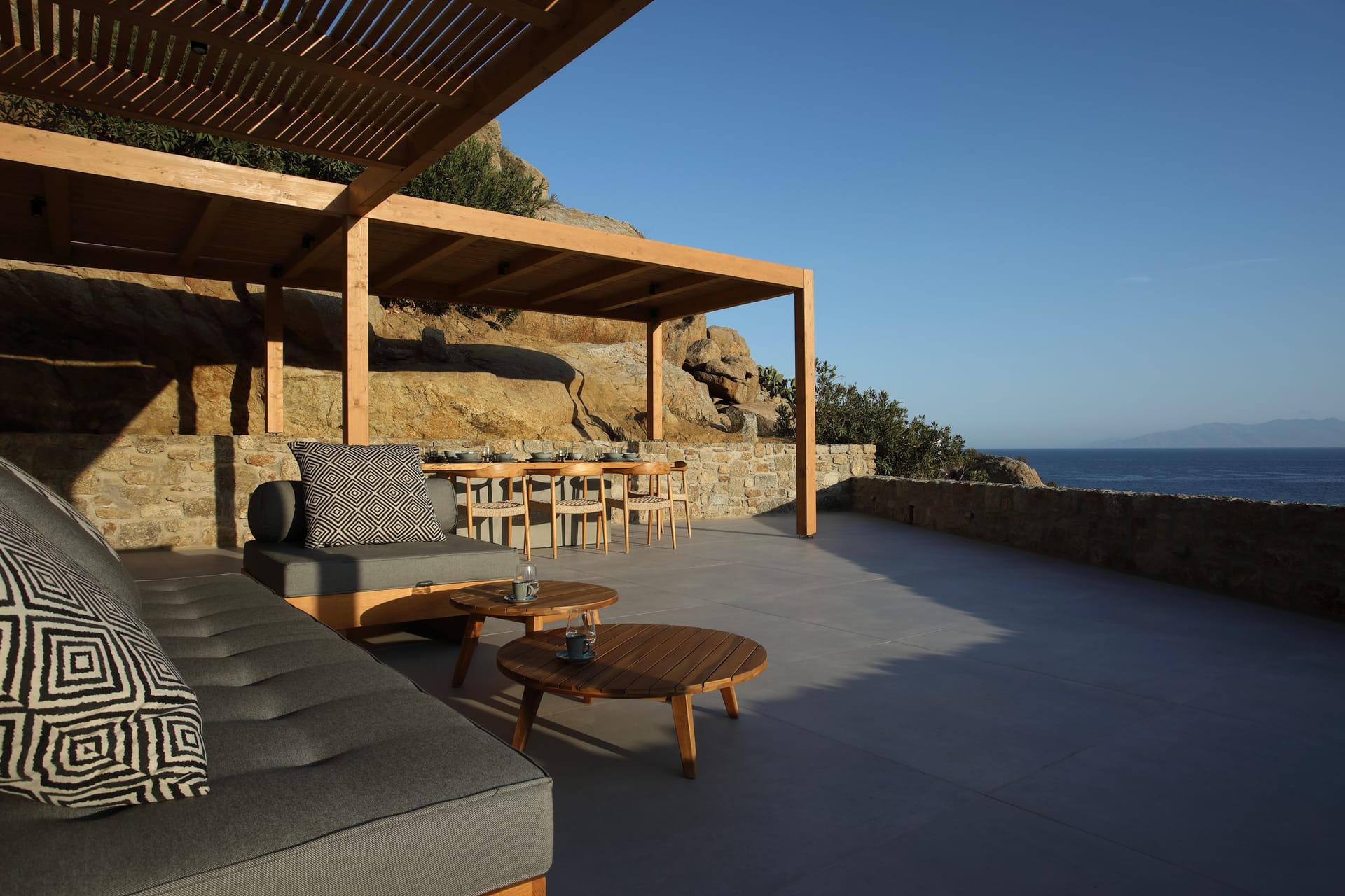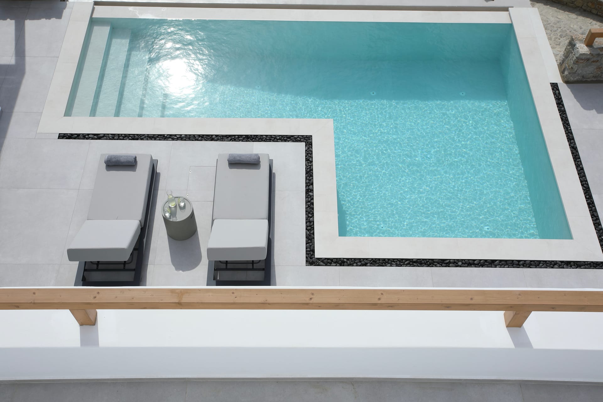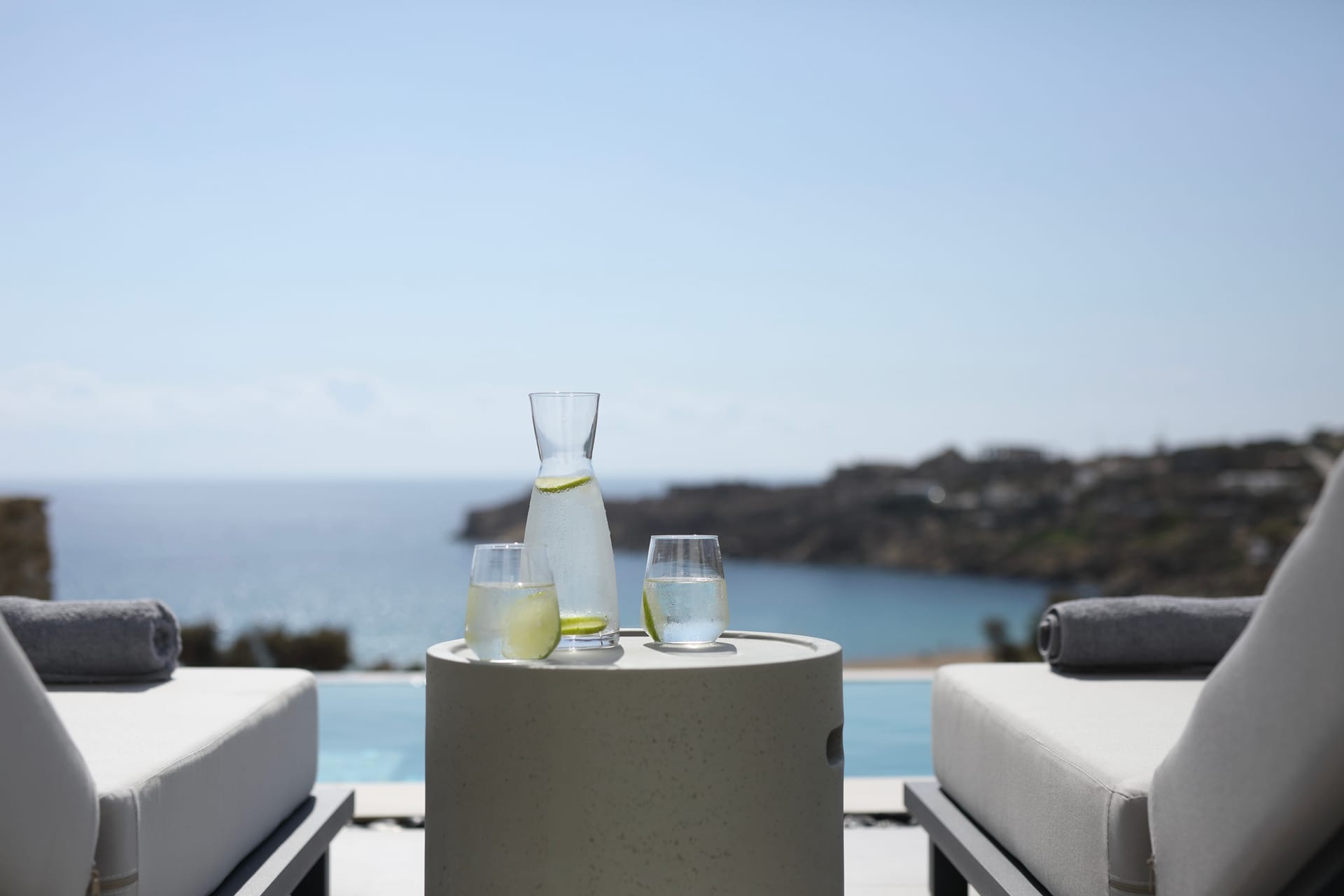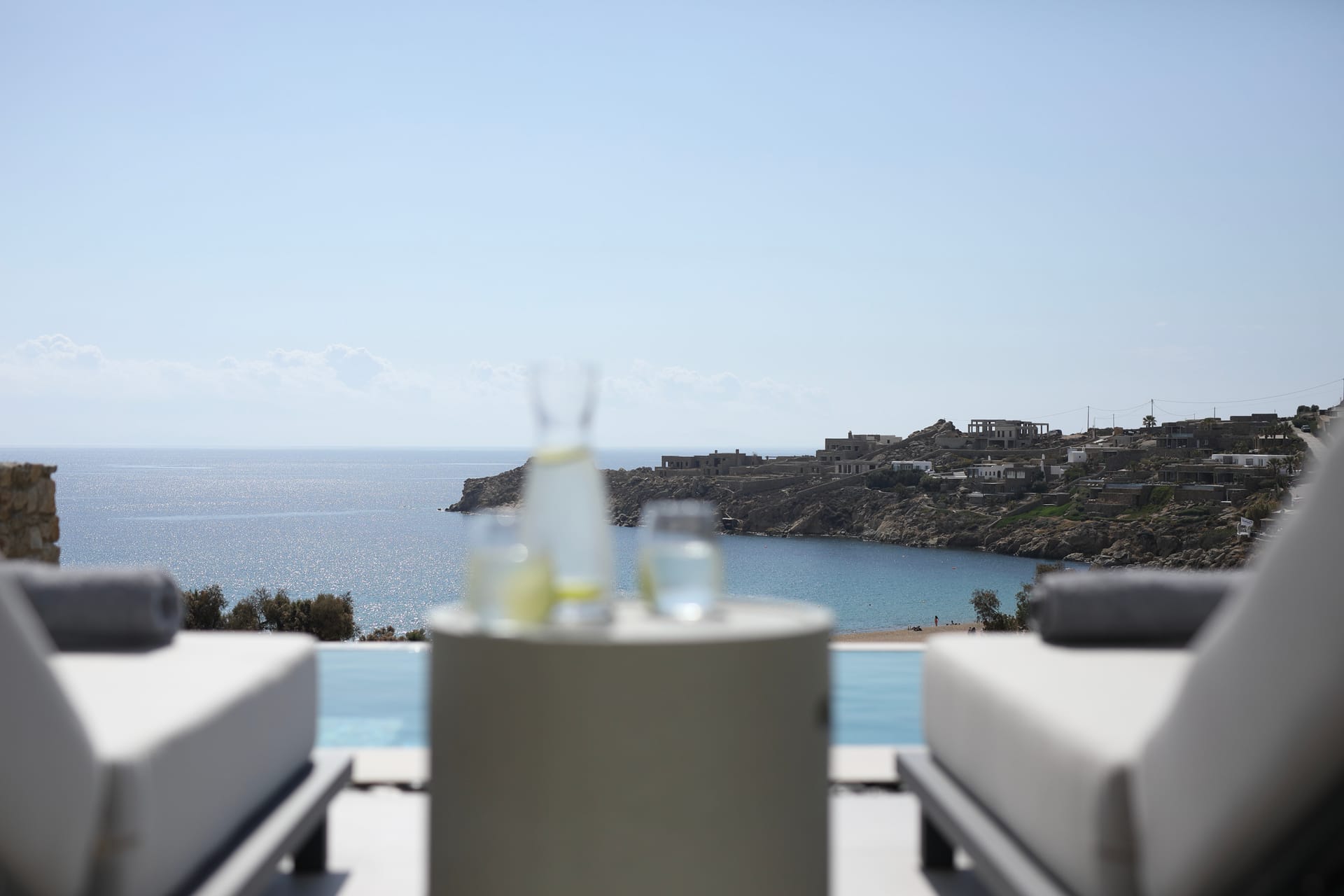 An open-plan living and dining area with a fully equipped kitchen and breakfast island creates an inviting social space, while the outdoor lounge and dining areas center around an infinity pool that seems to blend seamlessly with the sea. Sheltered from the island’s gentle ‘meltemi’ winds, Villa Paradise offers the ultimate Mykonos experience — steps from the beach, yet blissfully calm and secluded above it all.