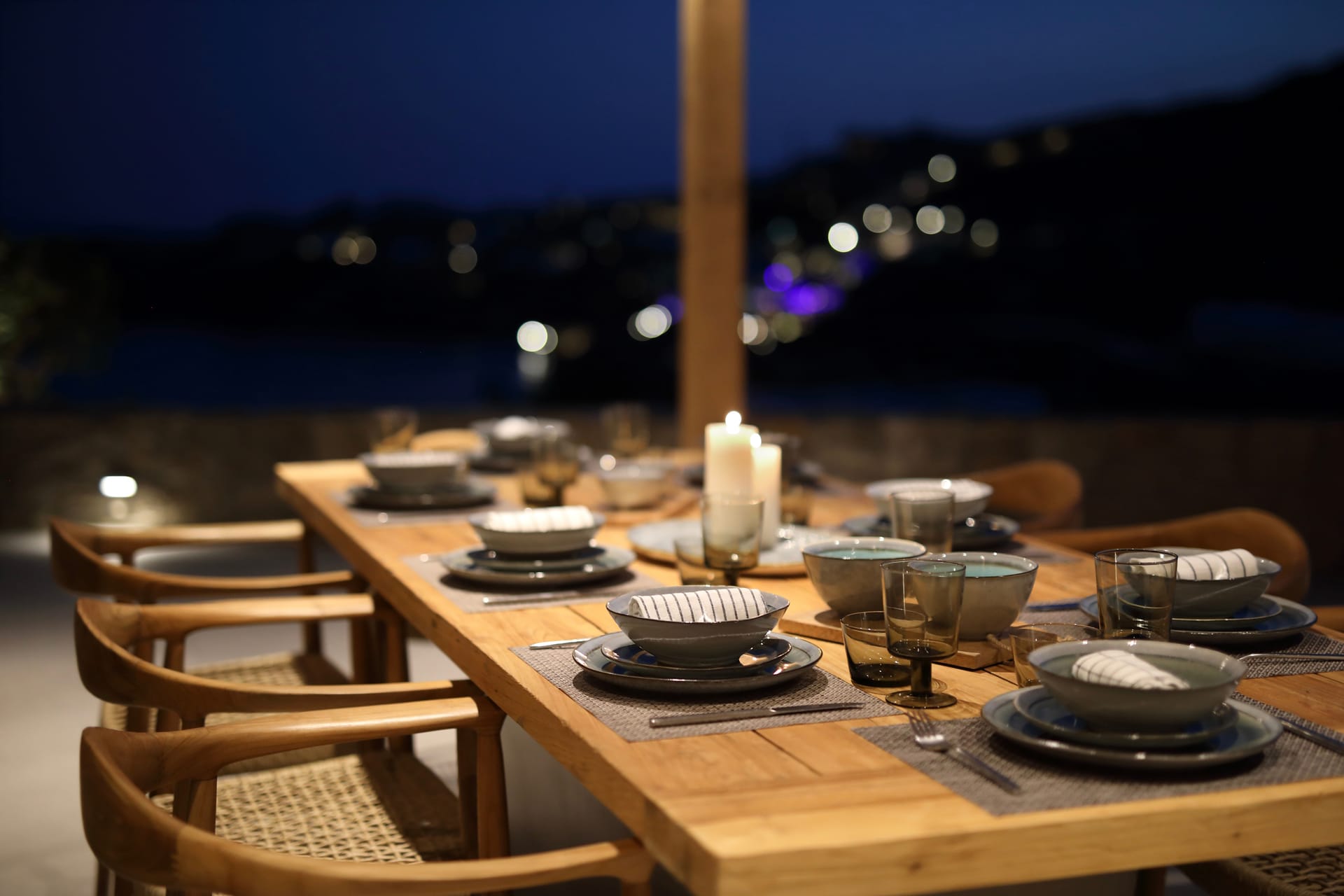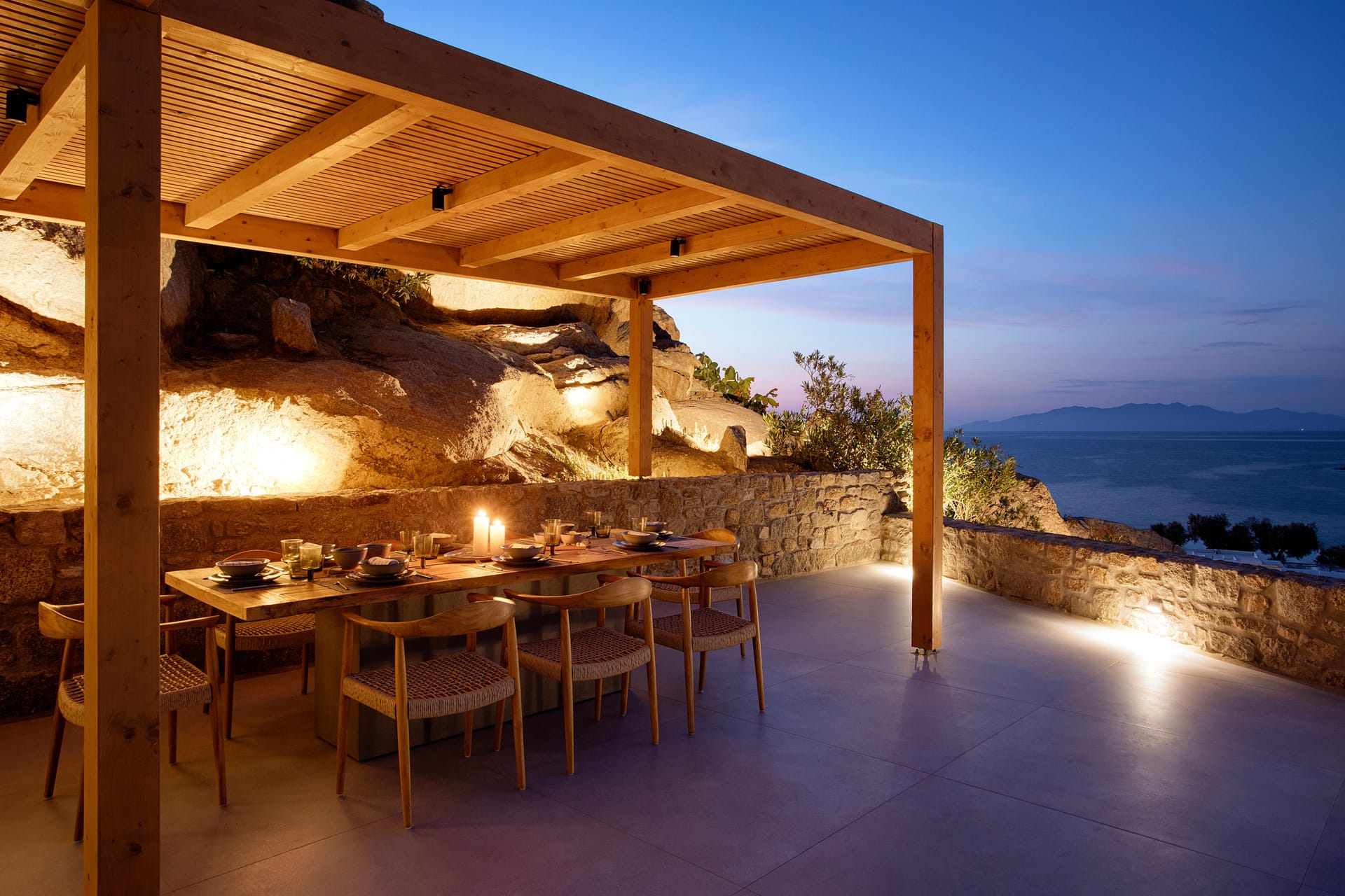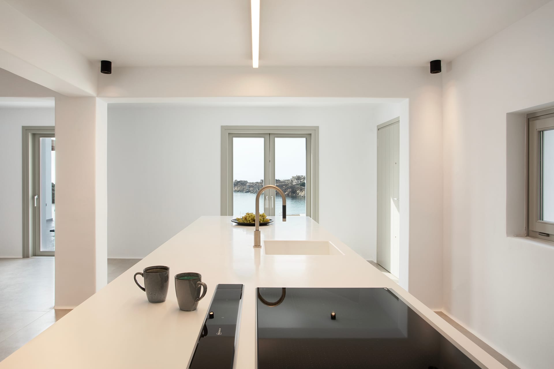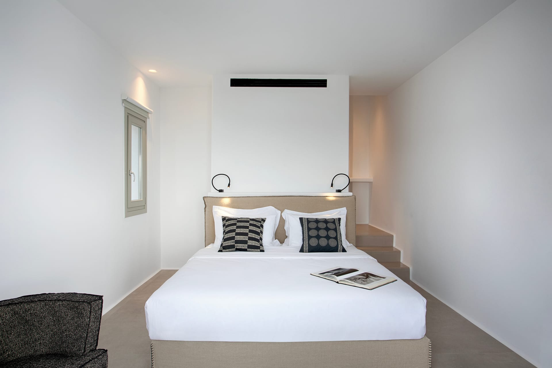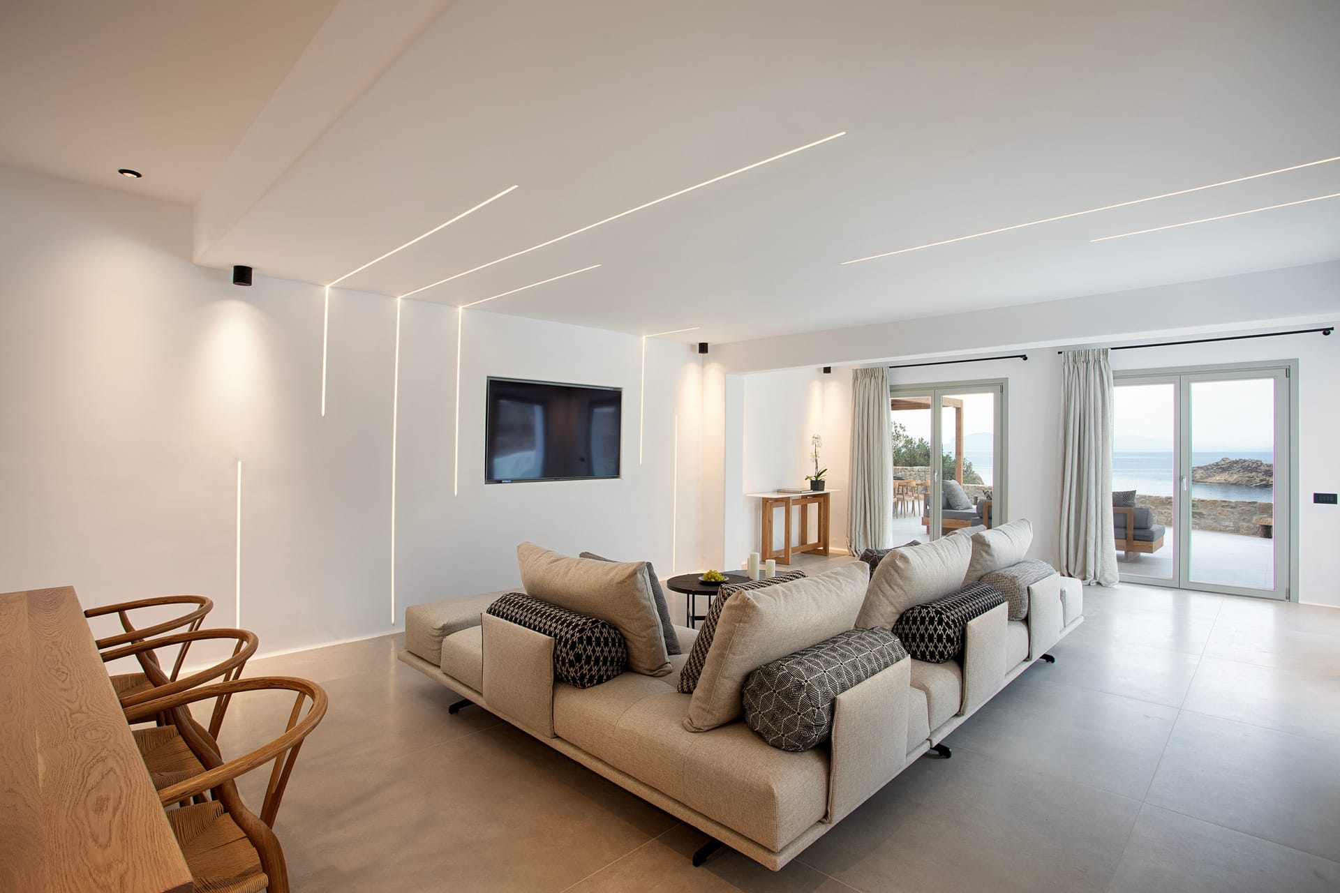 An open-plan living and dining area with a fully equipped kitchen and breakfast island creates an inviting social space, while the outdoor lounge and dining areas center around an infinity pool that seems to blend seamlessly with the sea. Sheltered from the island’s gentle ‘meltemi’ winds, Villa Paradise offers the ultimate Mykonos experience — steps from the beach, yet blissfully calm and secluded above it all.