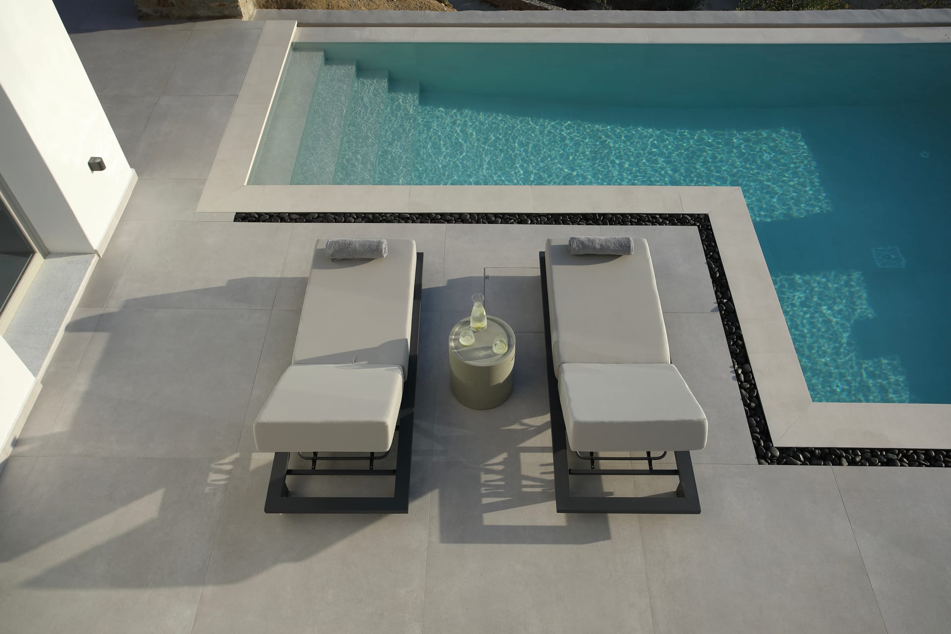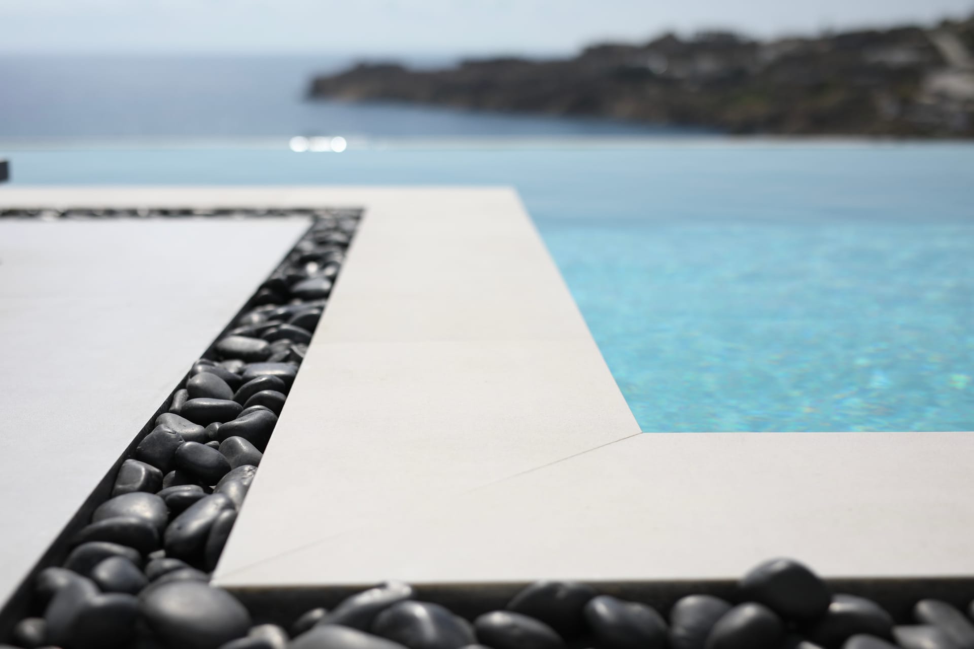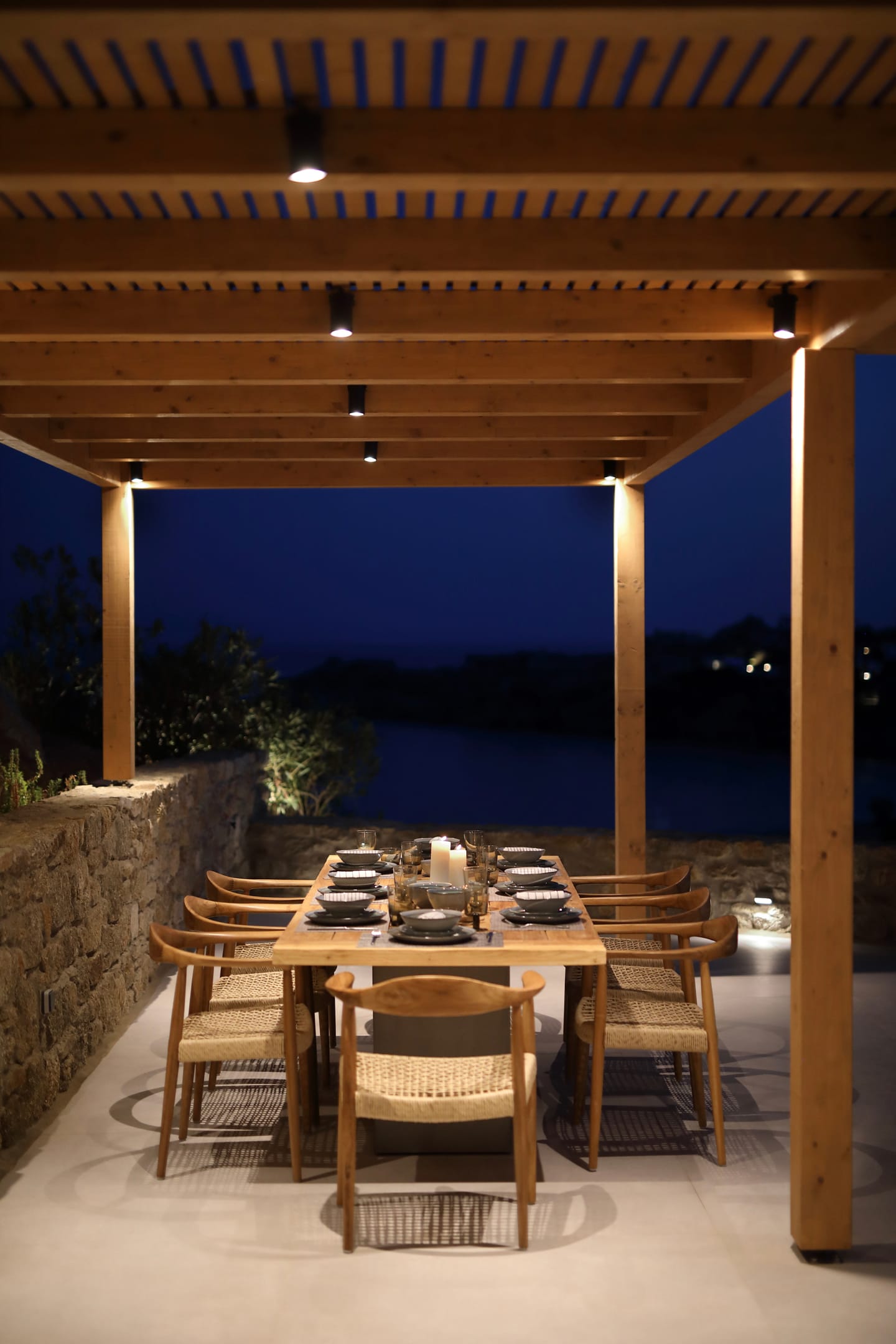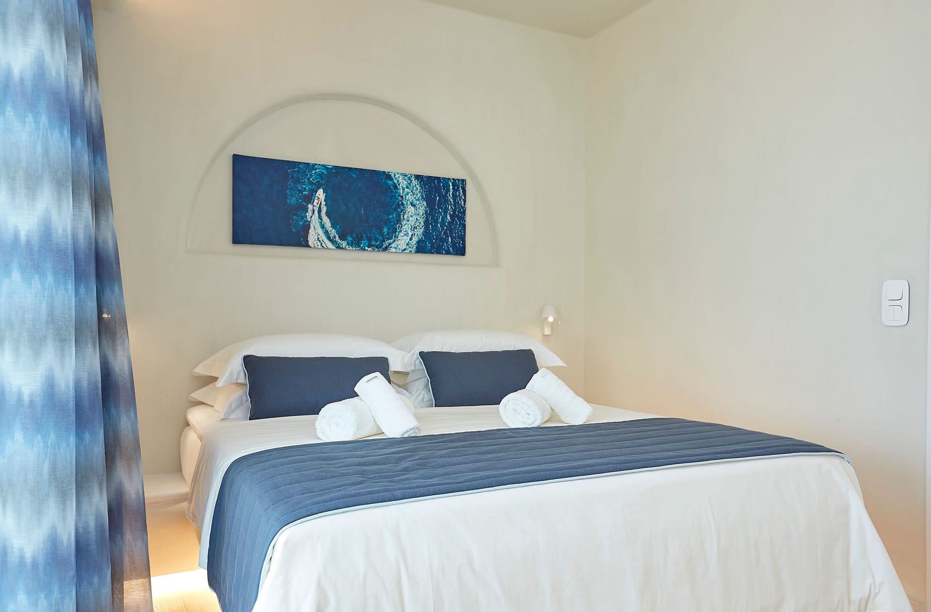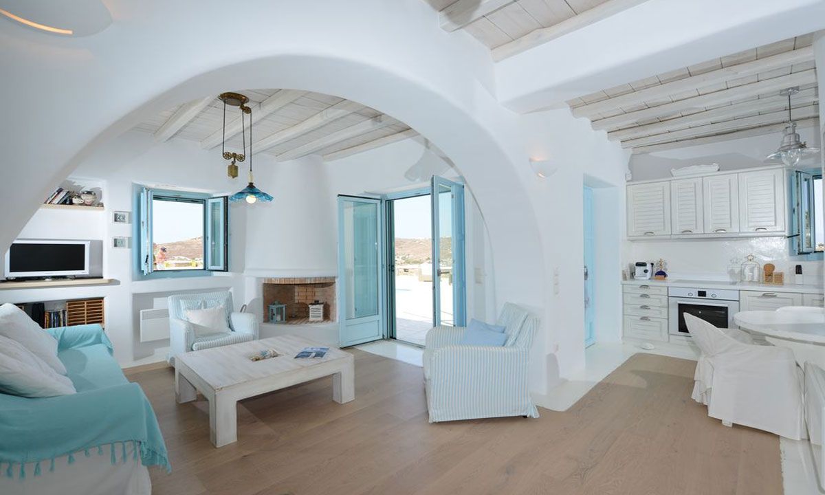 An open-plan living and dining area with a fully equipped kitchen and breakfast island creates an inviting social space, while the outdoor lounge and dining areas center around an infinity pool that seems to blend seamlessly with the sea. Sheltered from the island’s gentle ‘meltemi’ winds, Villa Paradise offers the ultimate Mykonos experience — steps from the beach, yet blissfully calm and secluded above it all.