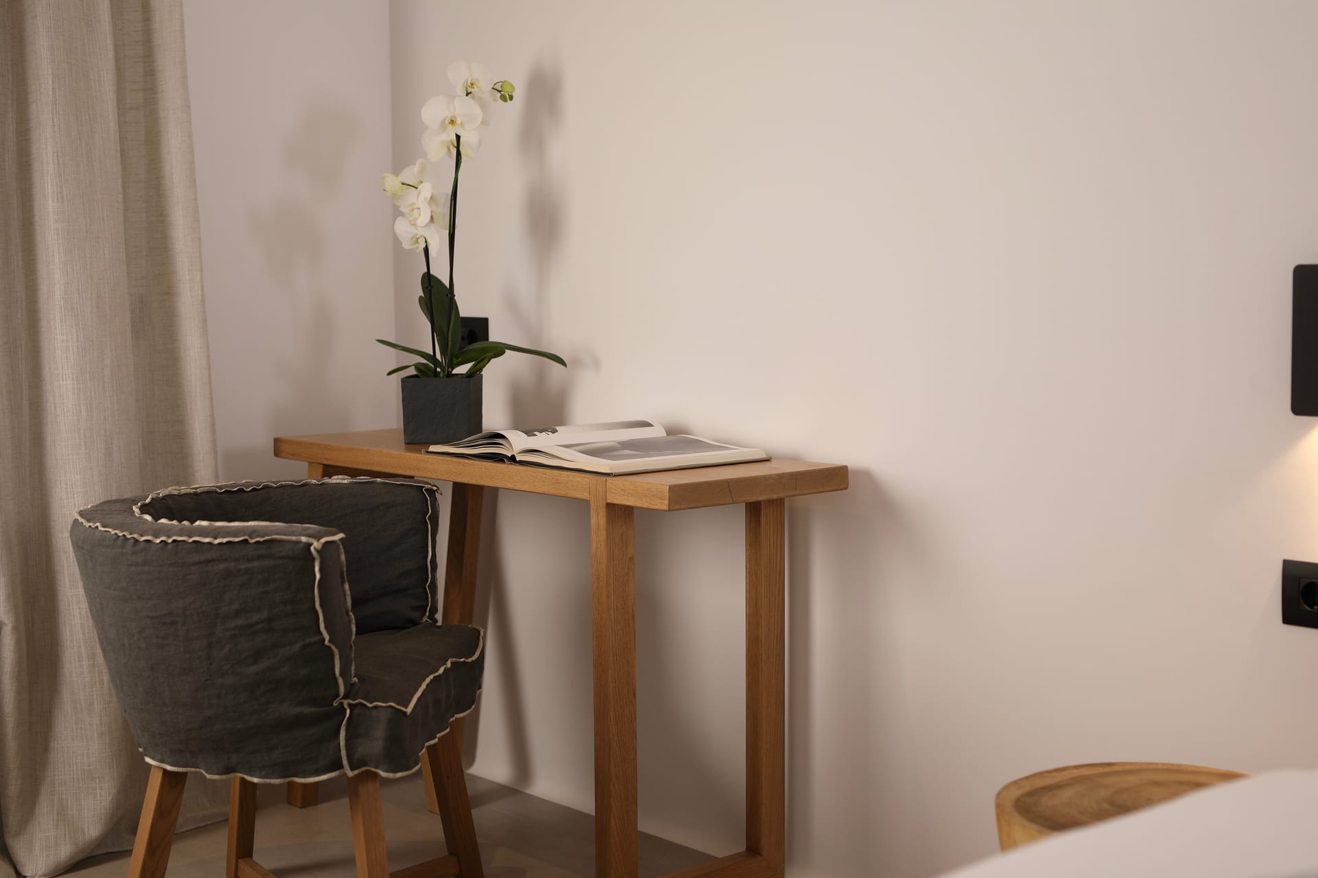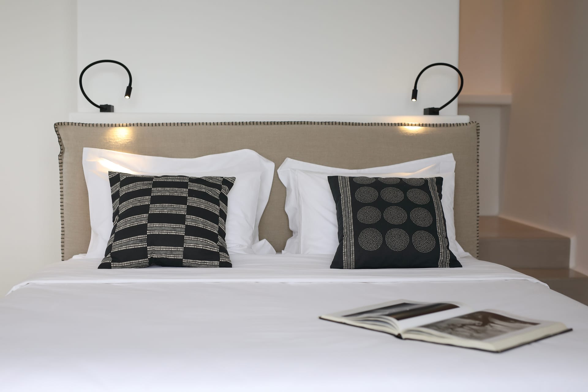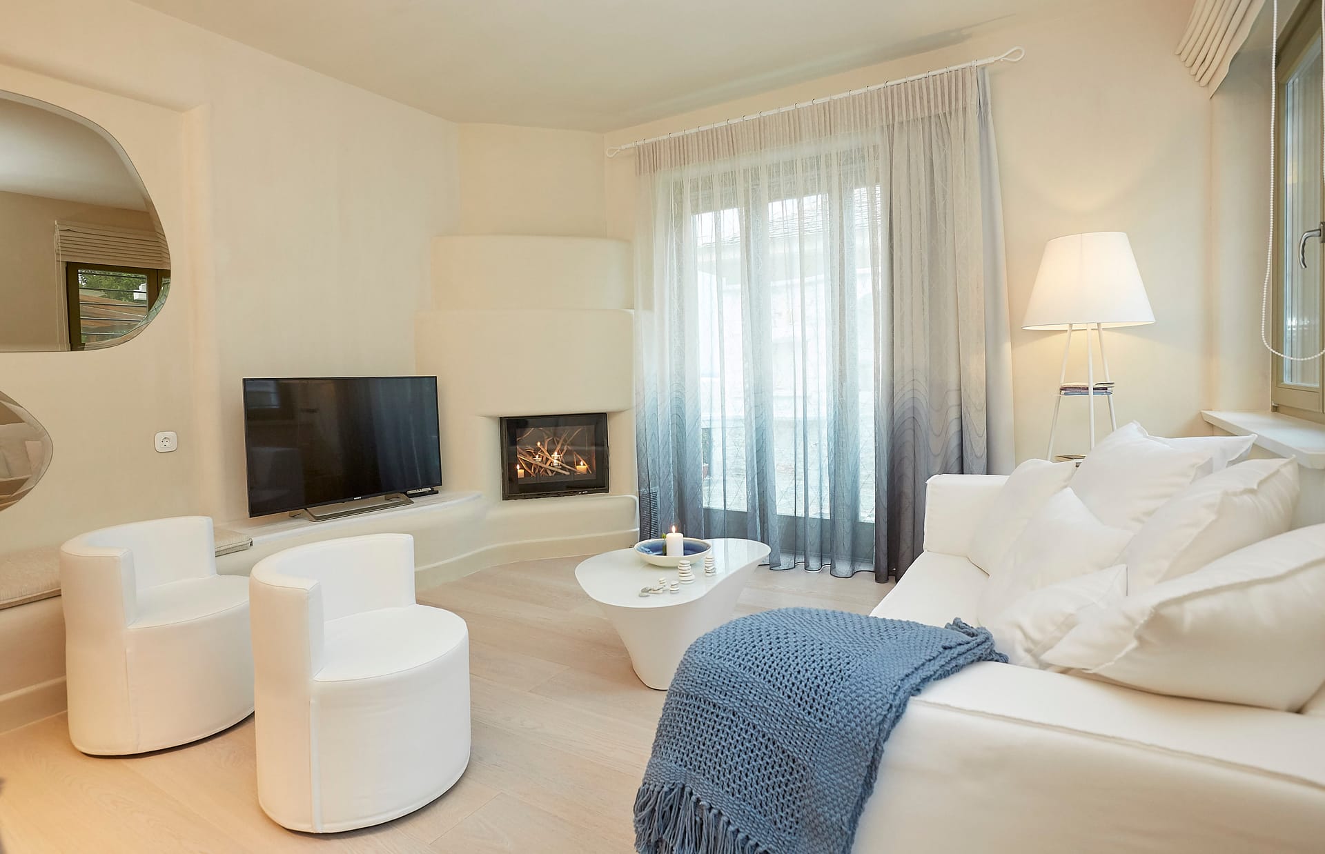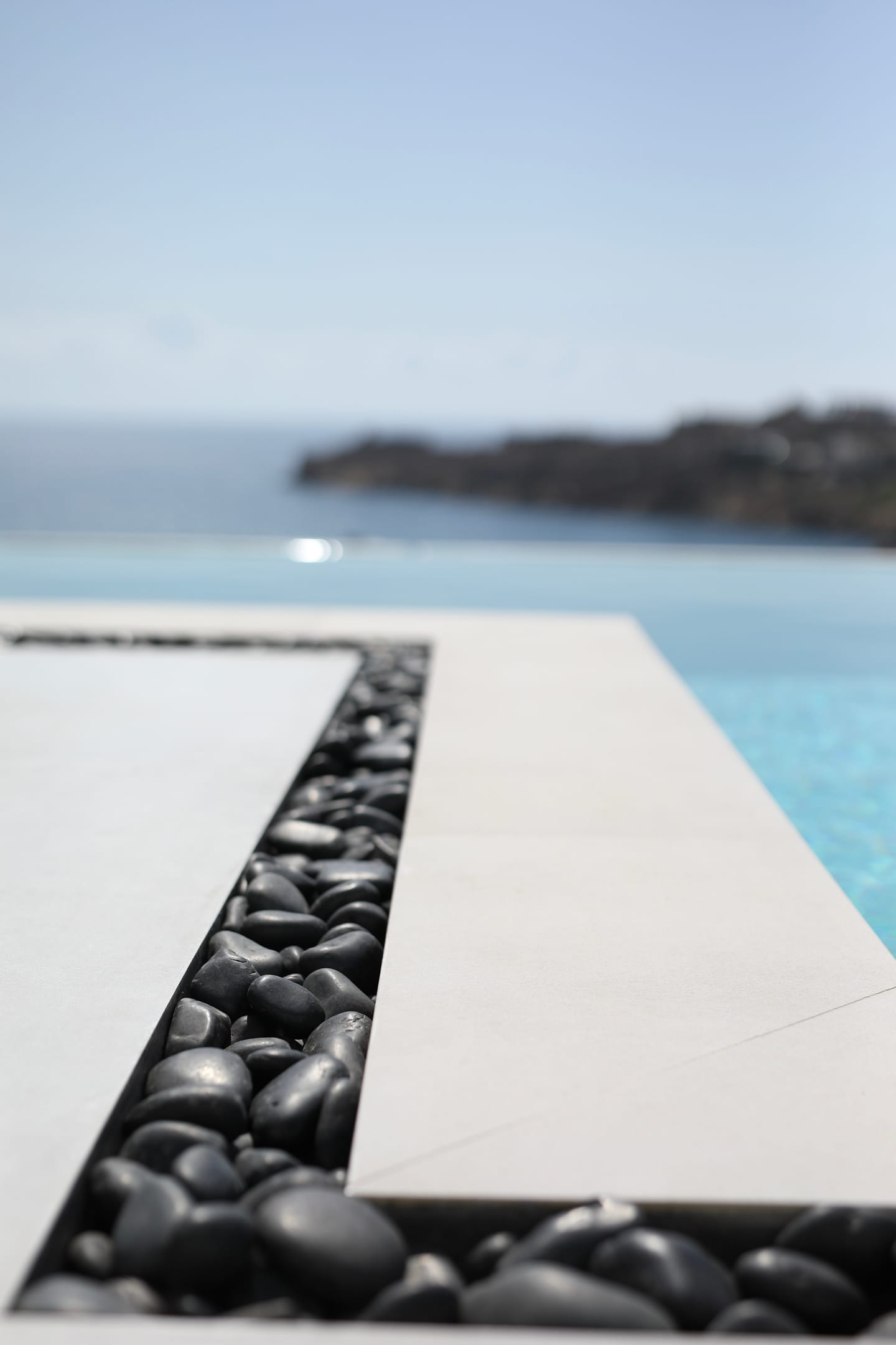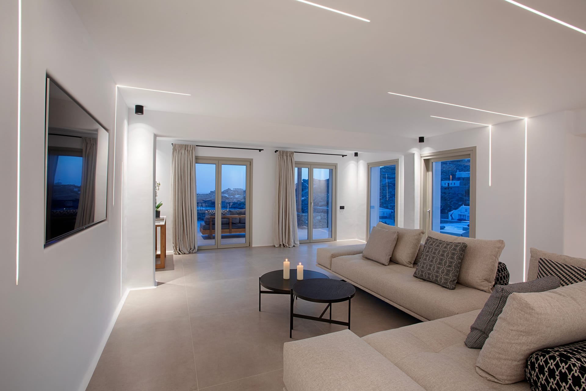 An open-plan living and dining area with a fully equipped kitchen and breakfast island creates an inviting social space, while the outdoor lounge and dining areas center around an infinity pool that seems to blend seamlessly with the sea. Sheltered from the island’s gentle ‘meltemi’ winds, Villa Paradise offers the ultimate Mykonos experience — steps from the beach, yet blissfully calm and secluded above it all.