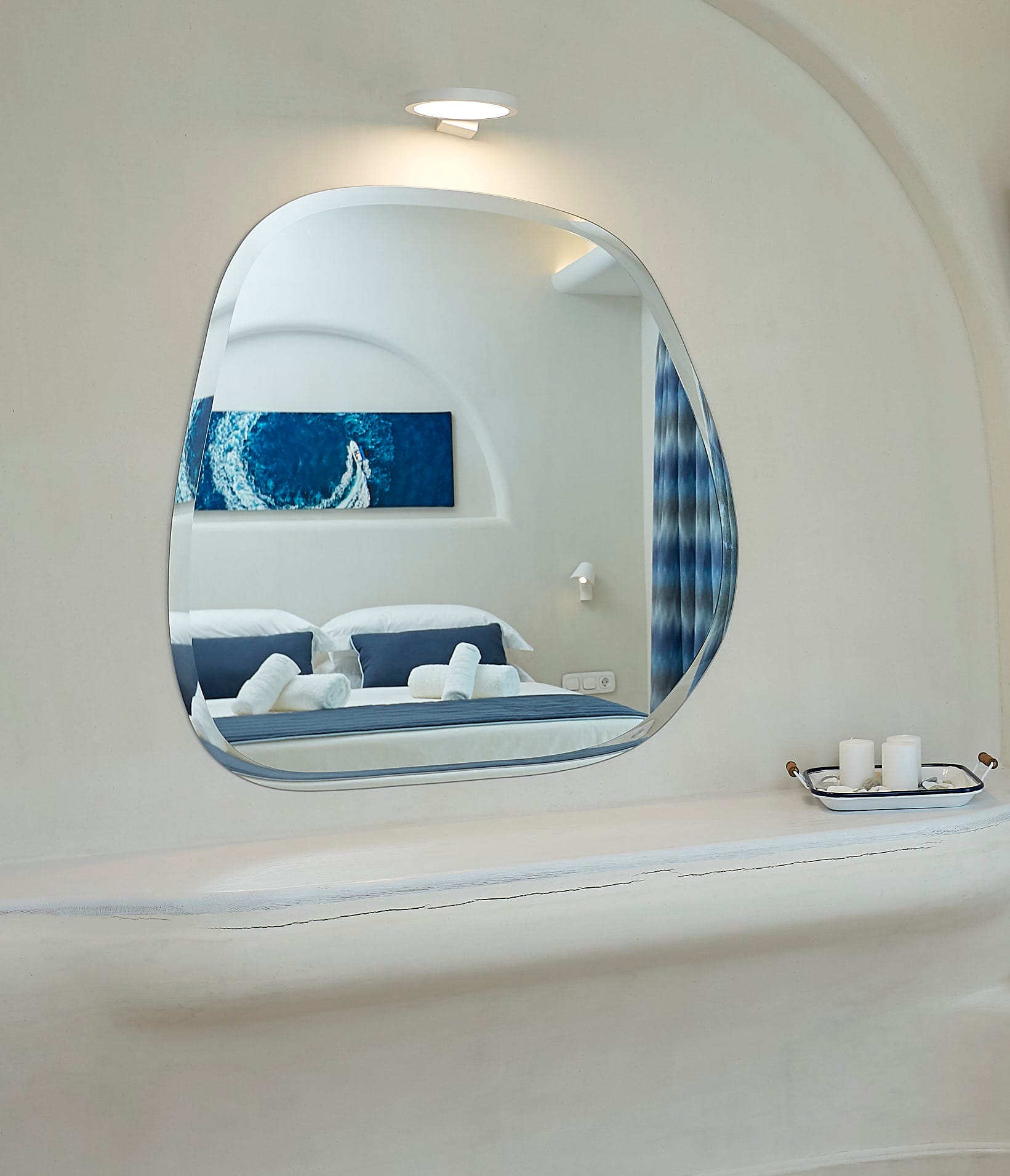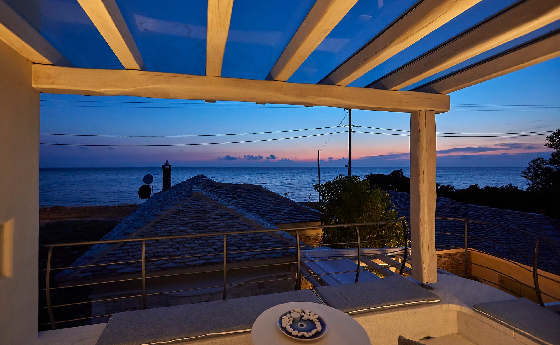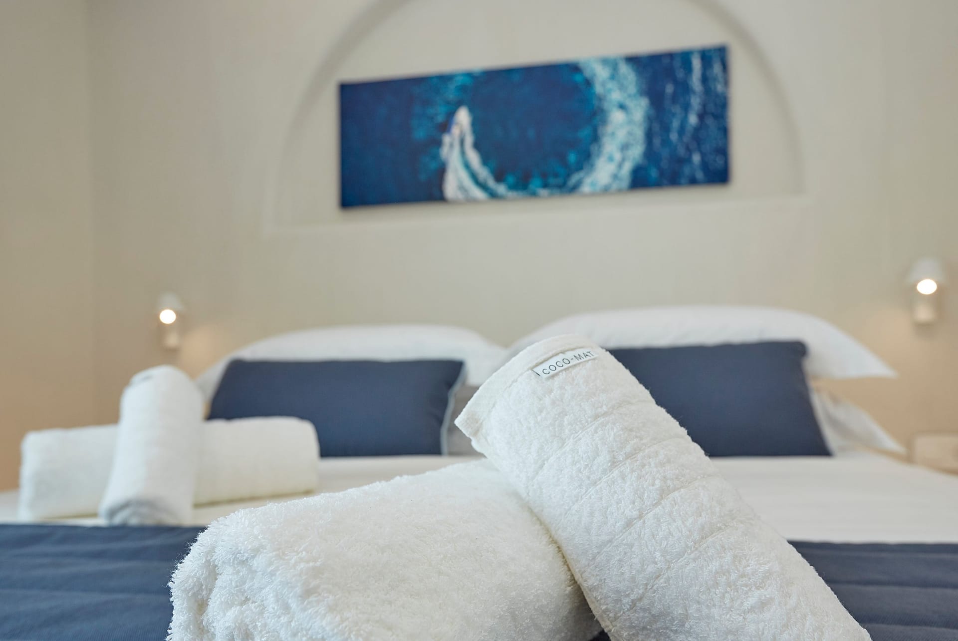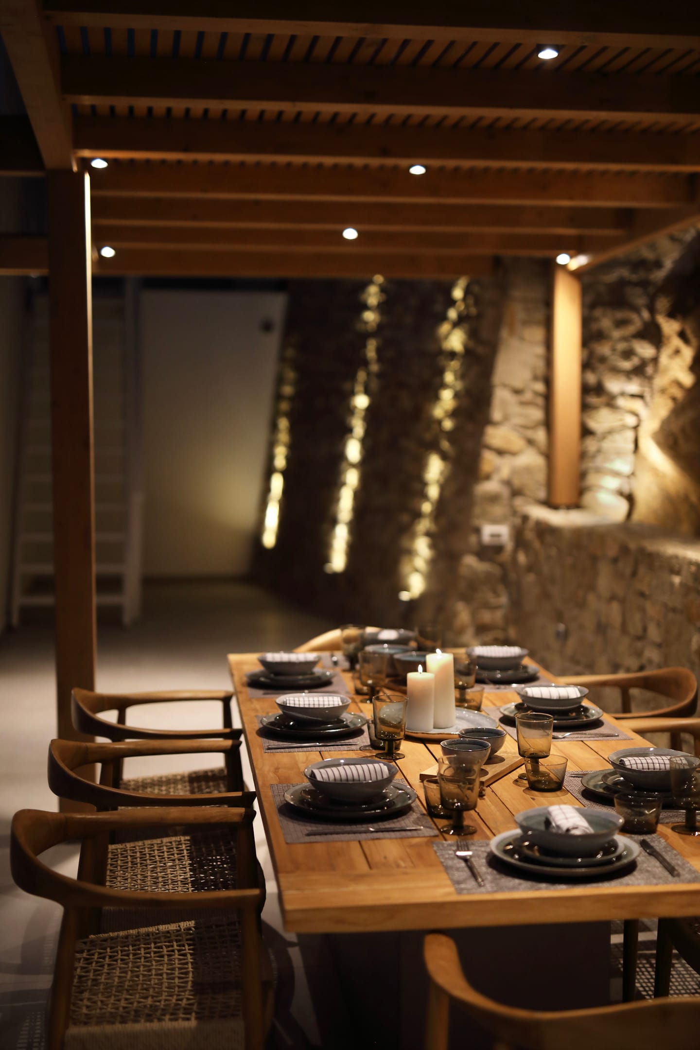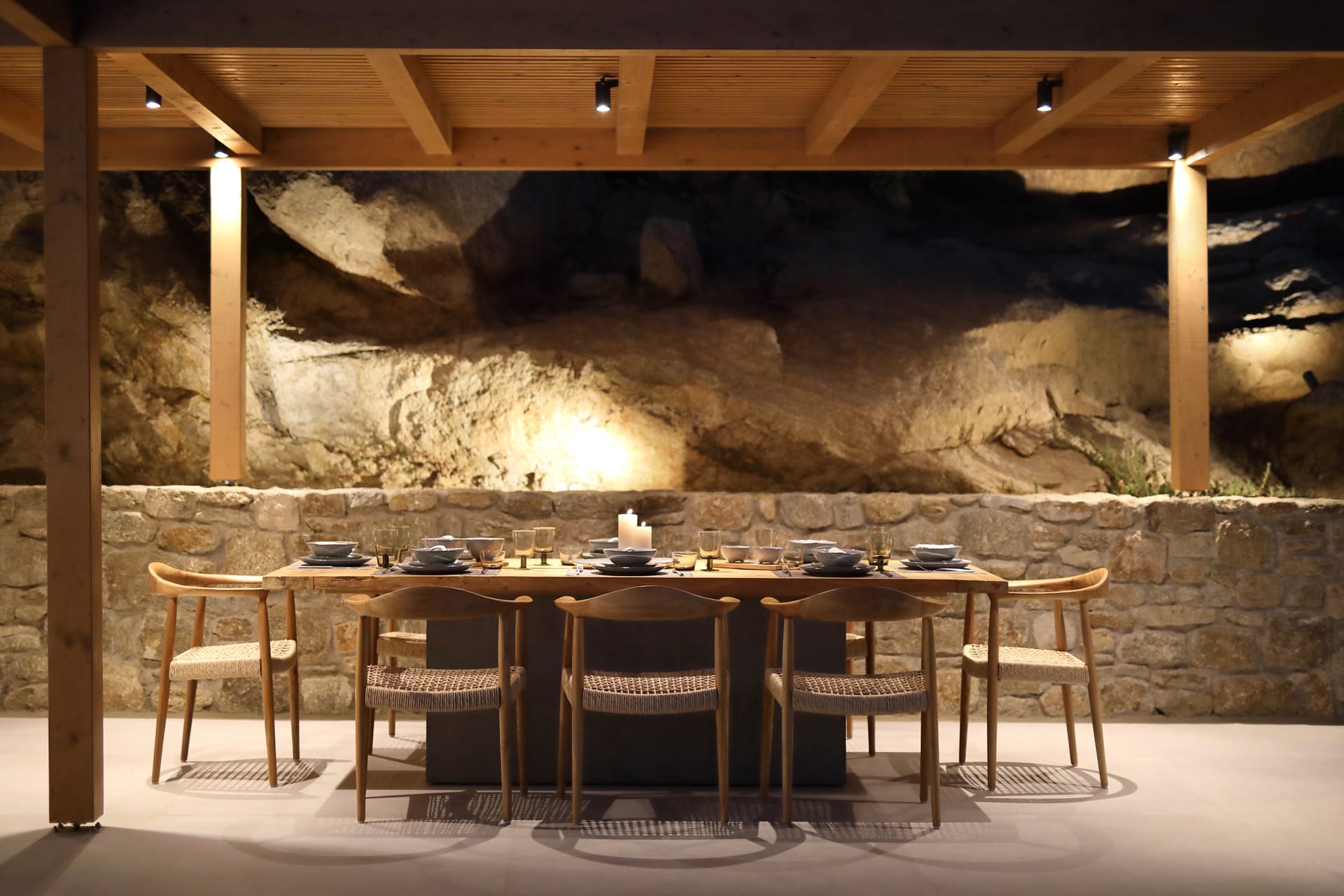 An open-plan living and dining area with a fully equipped kitchen and breakfast island creates an inviting social space, while the outdoor lounge and dining areas center around an infinity pool that seems to blend seamlessly with the sea. Sheltered from the island’s gentle ‘meltemi’ winds, Villa Paradise offers the ultimate Mykonos experience — steps from the beach, yet blissfully calm and secluded above it all.