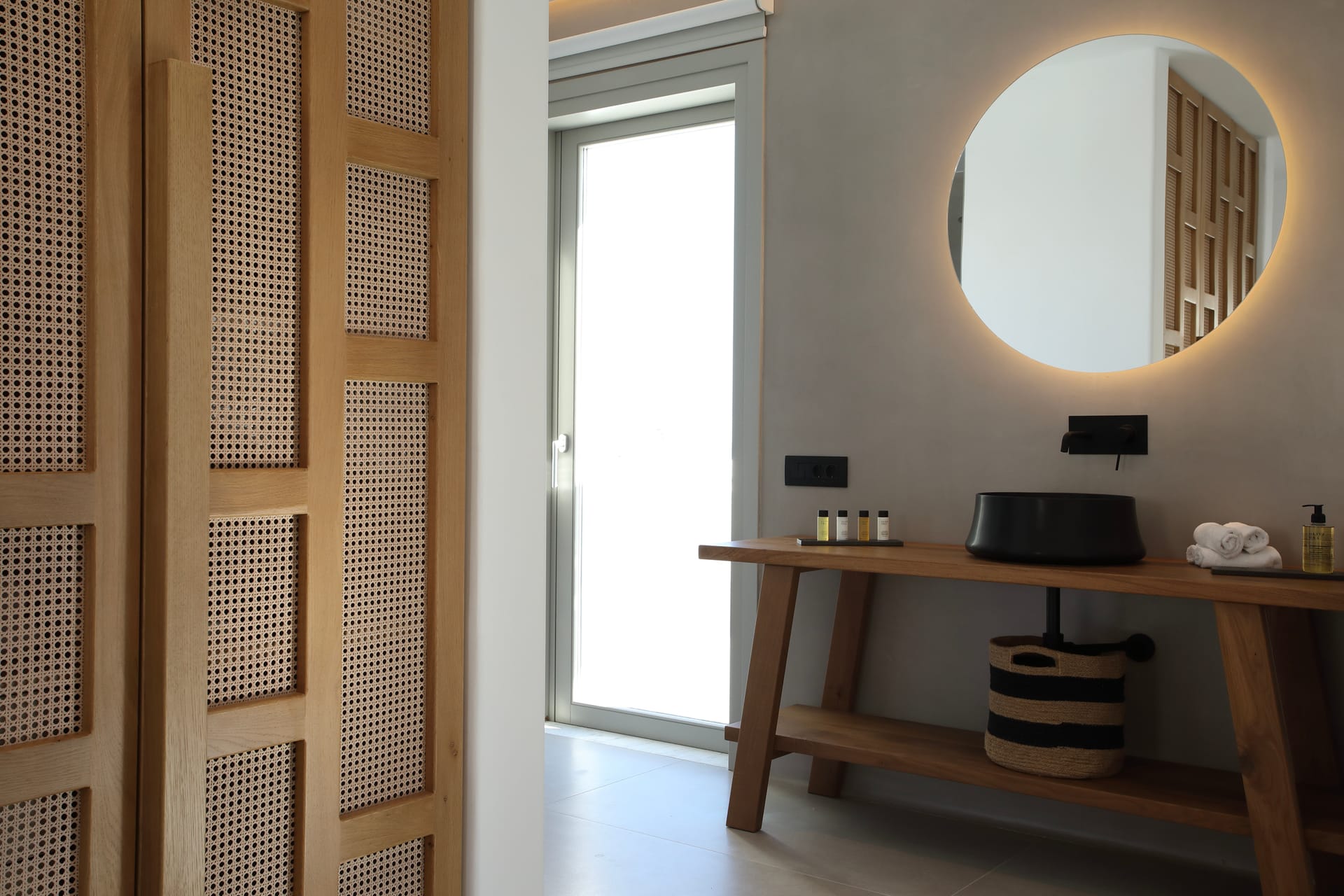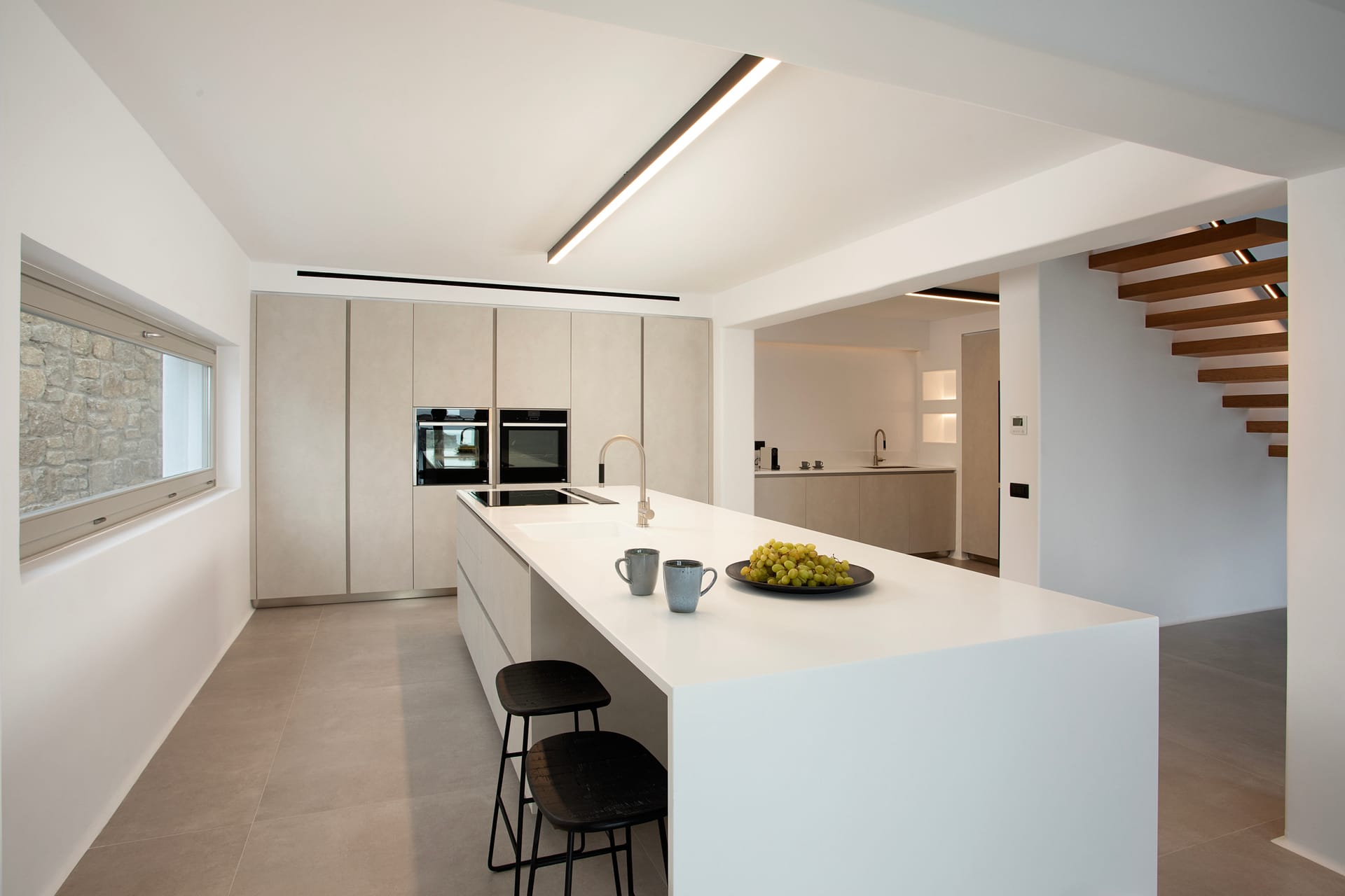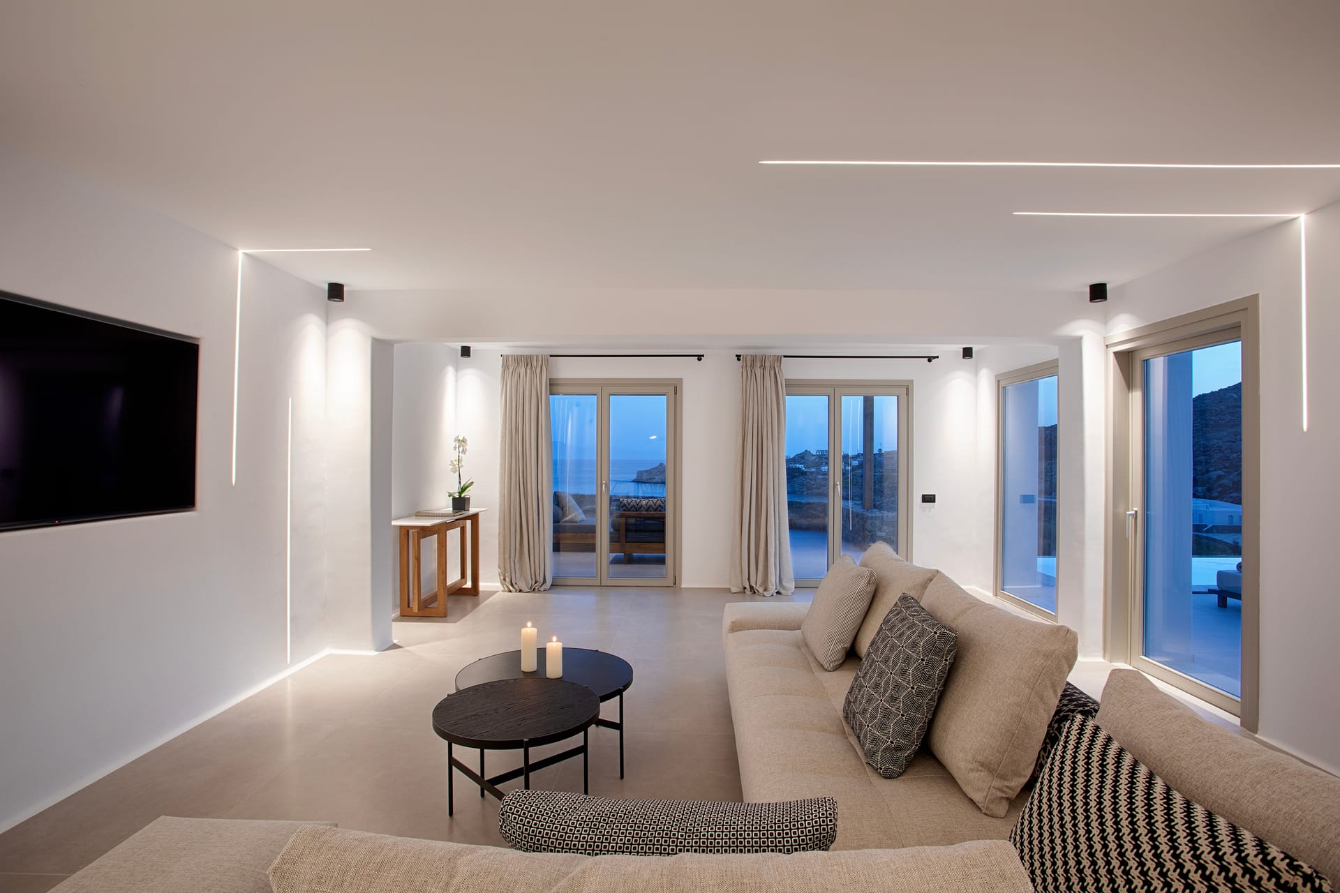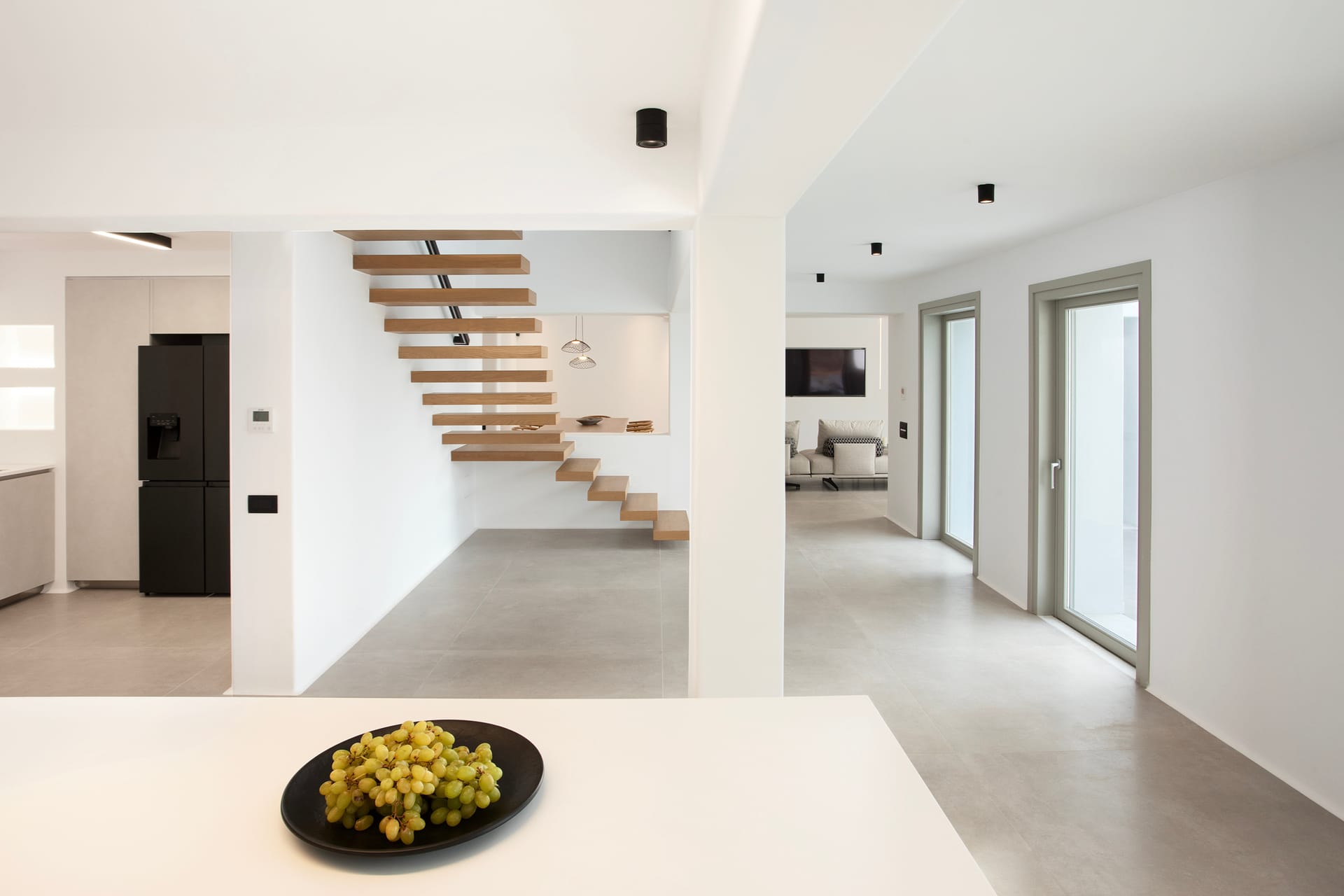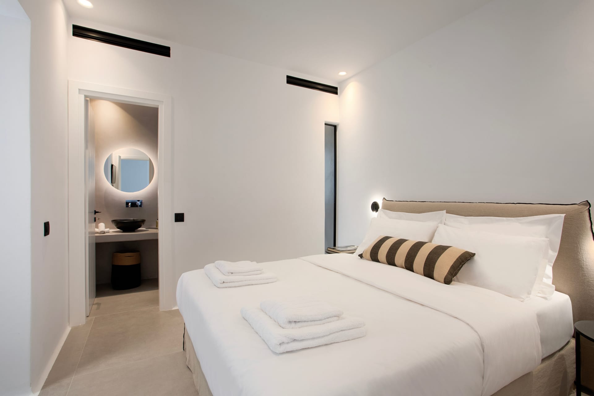 Designed in minimalist white and soft gray tones, accented by warm natural wood, the villa exudes a tranquil and airy atmosphere. Spread across three levels, it features five en-suite double bedrooms, three with private terraces and captivating sea views, plus a private single en-suite guest room with its own entrance for added privacy.